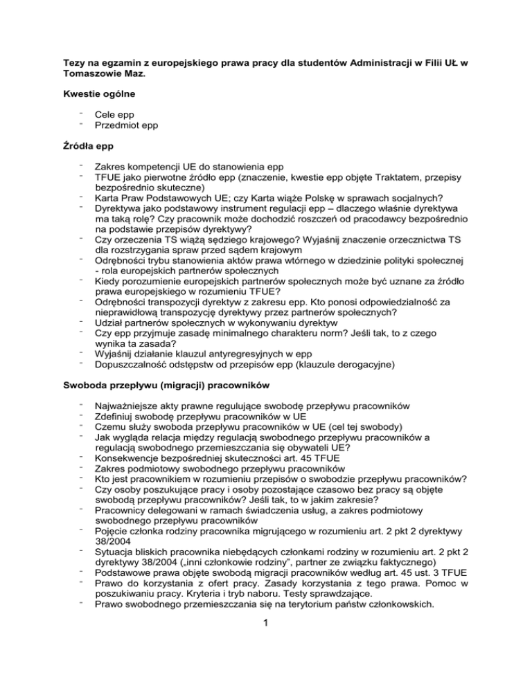 Tezy na egzamin z europejskiego prawa pracy dla studentów Administracji w Filii UŁ w Tomaszowie Maz. Kwestie ogólne ⁻ ⁻ Cele epp Przedmiot epp Źródła epp ⁻ ⁻ ⁻ ⁻ ⁻ ⁻ ⁻ ⁻ ⁻ ⁻ ⁻ ⁻ Zakres kompetencji UE do stanowienia epp TFUE jako pierwotne źródło epp (znaczenie, kwestie epp objęte Traktatem, przepisy bezpośrednio skuteczne) Karta Praw Podstawowych UE; czy Karta wiąże Polskę w sprawach socjalnych? Dyrektywa jako podstawowy instrument regulacji epp – dlaczego właśnie dyrektywa ma taką rolę? Czy pracownik może dochodzić roszczeń od pracodawcy bezpośrednio na podstawie przepisów dyrektywy? Czy orzeczenia TS wiążą sędziego krajowego? Wyjaśnij znaczenie orzecznictwa TS dla rozstrzygania spraw przed sądem krajowym Odrębności trybu stanowienia aktów prawa wtórnego w dziedzinie polityki społecznej - rola europejskich partnerów społecznych Kiedy porozumienie europejskich partnerów społecznych może być uznane za źródło prawa europejskiego w rozumieniu TFUE? Odrębności transpozycji dyrektyw z zakresu epp. Kto ponosi odpowiedzialność za nieprawidłową transpozycję dyrektywy przez partnerów społecznych? Udział partnerów społecznych w wykonywaniu dyrektyw Czy epp przyjmuje zasadę minimalnego charakteru norm? Jeśli tak, to z czego wynika ta zasada? Wyjaśnij działanie klauzul antyregresyjnych w epp Dopuszczalność odstępstw od przepisów epp (klauzule derogacyjne) Swoboda przepływu (migracji) pracowników ⁻ ⁻ ⁻ ⁻ ⁻ ⁻ ⁻ ⁻ ⁻ ⁻ ⁻ ⁻ ⁻ ⁻ Najważniejsze akty prawne regulujące swobodę przepływu pracowników Zdefiniuj swobodę przepływu pracowników w UE Czemu służy swoboda przepływu pracowników w UE (cel tej swobody) Jak wygląda relacja między regulacją swobodnego przepływu pracowników a regulacją swobodnego przemieszczania się obywateli UE? Konsekwencje bezpośredniej skuteczności art. 45 TFUE Zakres podmiotowy swobodnego przepływu pracowników Kto jest pracownikiem w rozumieniu przepisów o swobodzie przepływu pracowników? Czy osoby poszukujące pracy i osoby pozostające czasowo bez pracy są objęte swobodą przepływu pracowników? Jeśli tak, to w jakim zakresie? Pracownicy delegowani w ramach świadczenia usług, a zakres podmiotowy swobodnego przepływu pracowników Pojęcie członka rodziny pracownika migrującego w rozumieniu art. 2 pkt 2 dyrektywy 38/2004 Sytuacja bliskich pracownika niebędących członkami rodziny w rozumieniu art. 2 pkt 2 dyrektywy 38/2004 („inni członkowie rodziny”, partner ze związku faktycznego) Podstawowe prawa objęte swobodą migracji pracowników według art. 45 ust. 3 TFUE Prawo do korzystania z ofert pracy. Zasady korzystania z tego prawa. Pomoc w poszukiwaniu pracy. Kryteria i tryb naboru. Testy sprawdzające. Prawo swobodnego przemieszczania się na terytorium państw członkowskich. 1 ⁻ ⁻ ⁻ ⁻ ⁻ ⁻ ⁻ ⁻ ⁻ ⁻ ⁻ ⁻ ⁻ ⁻ ⁻ ⁻ ⁻ Prawo pobytu w wybranym państwie członkowskim. Rodzaje pobytu i warunki uzyskania prawa. Prawa pracowników związane z zatrudnieniem i pobytem Prawa członków rodziny pracownika Na czym polegają ograniczenia swobody migracji pracowników ze względów porządku, bezpieczeństwa i zdrowia publicznego? Wskaż i opisz zasady i procedury stosowania ograniczeń ze względów porządku, bezpieczeństwa i zdrowia publicznego (art. 27-33 dyrektywy 38/2004. Wyłączenie zatrudnienia w administracji publicznej ze swobody migracji pracowników (przyczyny, pojęcie administracji publicznej, zakaz dyskryminacji w przypadku zatrudnienia w administracji publicznej) Adresaci zakazu dyskryminacji pracowników migrujących (krąg podmiotów zobowiązanych do przestrzegania zasady równego traktowania tych pracowników) Zakres podmiotowy i przedmiotowy zakazu dyskryminacji osób korzystających ze swobody przepływu pracowników Czy zakaz dyskryminacji pracowników migrujących chroni interesy obywateli państwa przyjmującego? Zakaz dyskryminacji bezpośredniej pracowników migrujących. Podaj przykład dyskryminacji bezpośredniej Zakaz dyskryminacji pośredniej pracowników migrujących. Podaj przykład dyskryminacji pośredniej Przypadki dopuszczalności odmiennego traktowania pracowników migrujących Wskaż przewidziane w prawie europejskim gwarancje i ułatwienia swobody przepływu pracowników Podstawowe założenia i cele koordynacji systemów zabezpieczenia społecznego Cel wzajemnego uznawania kwalifikacji zawodowych. Wzajemne uznawanie kwalifikacji a wykonywanie pracy w zawodach regulowanych i nieregulowanych w świetle dyrektywy 2005/36 WE Wspieranie wymiany młodych pracowników Koordynacja swobodnego przepływu pracowników w świetle art. 46 TFUE i rozp. 492/2011 Równe traktowanie w dziedzinie zatrudnienia ⁻ Nierówne traktowanie a dyskryminacja ⁻ Wystąpowanie wskazanej w przepisach podstawy dyskryminacji jako warunek ochrony przed dyskryminacją w prawie UE (sprawa C-13/05, Chacón Navas przeciwko Eurest Colectividades SA) ⁻ Równe traktowanie mężczyzn i kobiet w zakresie wynagradzania za pracę (art. 157 TFUE) – pojęcie wynagrodzenia, pojęcie równości wynagrodzenia, równej pracy i pracy równej wartości ⁻ Zakres ochrony przed dyskryminacją w dyrektywie 2006/54 ⁻ Zakres ochrony przed dyskryminacją w dyrektywie 2000/43 ⁻ Zakres ochrony przed dyskryminacją w dyrektywie 2000/78 ⁻ Wskaż formy dyskryminacji ⁻ Wyjaśnij, odwołując się do orzecznictwa TS, pojęcie dyskryminacji bezpośredniej ⁻ Wyjaśnij, odwołując się do orzecznictwa TS, pojęcie dyskryminacji pośredniej 2 ⁻ Molestowanie jako forma dyskryminacji ⁻ Molestowanie ze względu na płeć a molestowanie seksualne ⁻ Dopuszczalne odstępstwa od zasady równego traktowania ze względu na wiek. Sprawa C-411/05 Felix Palacios de la Villa ⁻ Akcja pozytywna. Pojęcie. Kiedy akcja pozytywna nie narusza zakazu dyskryminacji (w świetle orzeczeń Eckhard Kalanke v. Freie Hansestadt Brem