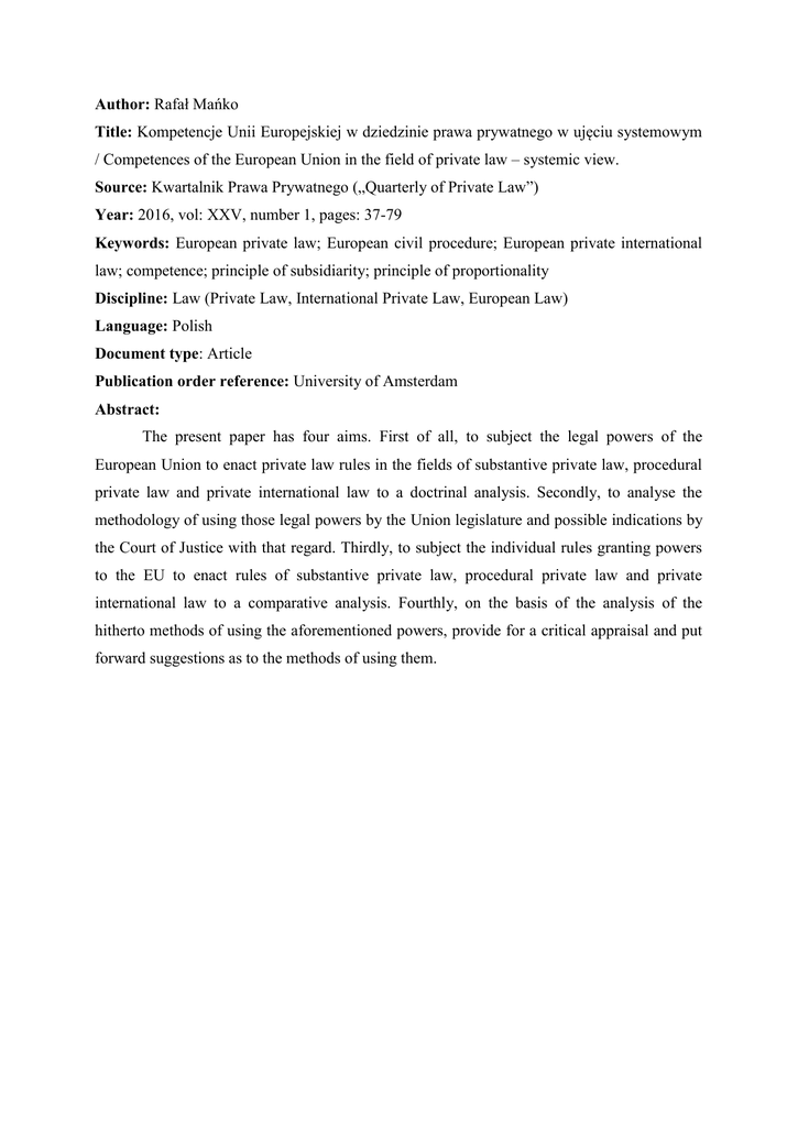 Author: Rafał Mańko Title: Kompetencje Unii Europejskiej w dziedzinie prawa prywatnego w ujęciu systemowym / Competences of the European Union in the field of private law – systemic view. Source: Kwartalnik Prawa Prywatnego („Quarterly of Private Law”) Year: 2016, vol: XXV, number 1, pages: 37-79 Keywords: European private law; European civil procedure; European private international law; competence; principle of subsidiarity; principle of proportionality Discipline: Law (Private Law, International Private Law, European Law) Language: Polish Document type: Article Publication order reference: University of Amsterdam Abstract: The present paper has four aims. First of all, to subject the legal powers of the European Union to enact private law rules in the fields of substantive private law, procedural private law and private international law to a doctrinal analysis. Secondly, to analyse the methodology of using those legal powers by the Union legislature and possible indications by the Court of Justice with that regard. Thirdly, to subject the individual rules granting powers to the EU to enact rules of substantive private law, procedural private law and private international law to a comparative analysis. Fourthly, on the basis of the analysis of the hitherto methods of using the aforementioned powers, provide for a critical appraisal and put forward suggestions as to the methods of using them.