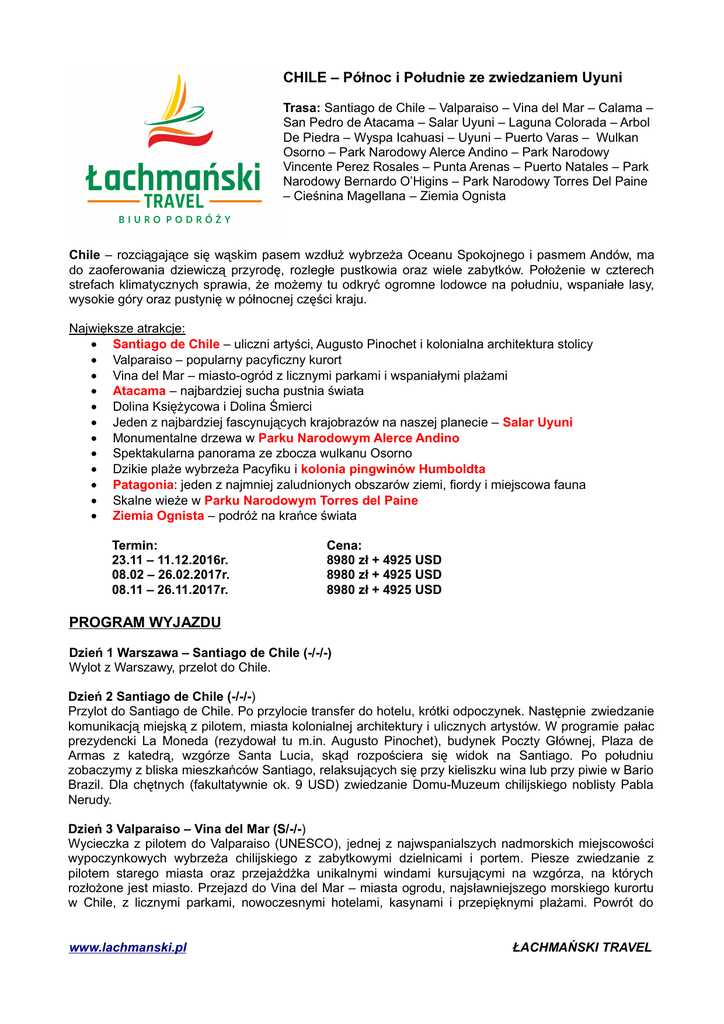 CHILE – Północ i Południe ze zwiedzaniem Uyuni Trasa: Santiago de Chile – Valparaiso – Vina del Mar – Calama – San Pedro de Atacama – Salar Uyuni – Laguna Colorada – Arbol De Piedra – Wyspa Icahuasi – Uyuni – Puerto Varas – Wulkan Osorno – Park Narodowy Alerce Andino – Park Narodowy Vincente Perez Rosales – Punta Arenas – Puerto Natales – Park Narodowy Bernardo O’Higins – Park Narodowy Torres Del Paine – Cieśnina Magellana – Ziemia Ognista Chile – rozciągające się wąskim pasem wzdłuż wybrzeża Oceanu Spokojnego i pasmem Andów, ma do zaoferowania dziewiczą przyrodę, rozległe pustkowia oraz wiele zabytków. Położenie w czterech strefach klimatycznych sprawia, że możemy tu odkryć ogromne lodowce na południu, wspaniałe lasy, wysokie góry oraz pustynię w północnej części kraju. Największe atrakcje: Santiago de Chile – uliczni artyści, Augusto Pinochet i kolonialna architektura stolicy Valparaiso – popularny pacyficzny kurort Vina del Mar – miasto-ogród z licznymi parkami i wspaniałymi plażami Atacama – najbardziej sucha pustnia świata Dolina Księżycowa i Dolina Śmierci Jeden z najbardziej fascynujących krajobrazów na naszej planecie – Salar Uyuni Monumentalne drzewa w Parku Narodowym Alerce Andino Spektakularna panorama ze zbocza wulkanu Osorno Dzikie plaże wybrzeża Pacyfiku i kolonia pingwinów Humboldta Patagonia: jeden z najmniej zaludnionych obszarów ziemi, fiordy i miejscowa fauna Skalne wieże w Parku Narodowym Torres del Paine Ziemia Ognista – podróż na krańce świata Termin: 23.11 – 11.12.2016r. 08.02 – 26.02.2017r. 08.11 – 26.11.2017r. Cena: 8980 zł + 4925 USD 8980 zł + 4925 USD 8980 zł + 4925 USD PROGRAM WYJAZDU Dzień 1 Warszawa – Santiago de Chile (-/-/-) Wylot z Warszawy, przelot do Chile. Dzień 2 Santiago de Chile (-/-/-) Przylot do Santiago de Chile. Po przylocie transfer do hotelu, krótki odpoczynek. Następnie zwiedzanie komunikacją miejską z pilotem, miasta kolonialnej architektury i ulicznych artystów. W programie pałac prezydencki La Moneda (rezydował tu m.in. Augusto Pinochet), budynek Poczty Głównej, Plaza de Armas z katedrą, wzgórze Santa Lucia, skąd rozpościera się widok na Santiago. Po południu zobaczymy z bliska mieszkańców Santiago, relaksujących się przy kieliszku wina lub przy piwie w Bario Brazil. Dla chętnych (fakultatywnie ok. 9 USD) zwiedzanie Domu-Muzeum chilijskiego noblisty Pabla Nerudy. Dzień 3 Valparaiso – Vina del Mar (S/-/-) Wycieczka z pilotem do Valparaiso (UNESCO), jednej z najwspanialszych nadmorskich miejscowości wypoczynkowych wybrzeża chilijskiego z zabytkowymi dzielnicami i portem. Piesze zwiedzanie z pilotem starego miasta oraz przejażdżka unikalnymi windami kursującymi na wzgórza, na których rozłożone jest miasto. Przejazd do Vina del Mar – miasta ogrodu, najsławniejszego morskiego kurortu w Chile, z licznymi parkami, nowoczesnymi hotelami, kasynami i przepięknymi plażami. Powrót do www.lachmanski.pl ŁACHMAŃSKI TRAVEL Santiago de Chile. Dzień 4 Calama – San Pedro de Atacama (S/-/-) Po śniadaniu przejazd na lotnisko i przelot Calama, położonego w regionie najbardziej suchej pustyni świata. Po przylocie przejazd w kierunku w San Pedro de Atacama przez Kordylierę Solną (Cordillera de la Sal) zbudowaną z piasku przemieszanego z solą, całkowicie pozbawioną życia (nie ma tu nawet owadów!). Dzień 5 Lagunas Altiplanicas (S/L/-) Wyjazd w stronę Salar de Tara. Podczas wycieczki zobaczymy niesamowite formacje skalne mieniące się cała ferią barw. Zatrzymamy się nad rzeką Quepiaco i zobaczymy lagune Diamente. Powrót do San Pedro de Atacama, krótki odpoczynek. Popołudniu wyjazd na jedne z najbardziej spektakularnych miejsc na pustyni Atacama. Zobaczymy Dolinę Księżycową oraz Dolinę Śmierci. Tamtejsze formacje skalne zostały wyrzeźbione przez wiatr, słońce i trzęsienia ziemi. Późnym popołudniem niezwykły spektakl, jaki daje zachodzące słońce, które złoci piaszczyste wydmy, kładzie się różowoczerwoną poświatą na nagich skałach i rozświetla stożki wulkanów. Światło barwi przyrodę na niesamowite kolory. Nocleg w San Pedro de Atacama. Dzień 6 Salar Uyuni (S/L/K) Rano wyjazd w kierunku granicy. Przekroczenie granicy Chile z Boliwią na andyjskiej przełęczy Portezuelo del Cajón na wysokości 4480 m n.p.m.i rozpoczynamy podróż przez jedno z najbardziej fascynujących krajobrazowo miejsc na świecie – Salar Uyuni. Na początek czeka nas poranek z gejzerem o nazwie „Sol de manana”, Laguna Verde i kąpiel w gorących źródłach. Nocleg w schronisku z pokojami wieloosobowymi, wspólną łazienką, bez ciepłej wody (w tym miejscu to jedyna możliwość). Dzień 7 Salar Uyuni (S/L/K) Kolejny dzień pełen atrakcji, wrażeń i niezapomnianych widoków - podróż przez pustynię. Salar Uyuni to miejsce gdzie przyroda stworzyła jedne z najbardziej fantastycznych krajobrazów na Naszej Planecie Zatrzymamy się przy kamiennym drzewie Arbol de Piedra oraz w wielu miejscach gdzie natura stworzyła fantastyczne krajobrazy. Nocleg w hotelu solnym (w hotelu jest ciepła woda; pokoje 2-4 osobowe bez łazienek; koniecznie trzeba zabrać ze sobą śpiwór i ręcznik). Dzień 8 Salar Uyuni - Wyspa Incahuasi (S/L/K) Kolejny miejscem na naszej trasie będzie spektakularna wyspa na słonym jeziorze Incahuasi Zobaczymy fantastyczny krajobraz jedynego w swoim rodzaju miejsca na Naszej Planecie. Po drodze do miasteczka Uyuni odwiedzimy cmentarzysko lokomotyw. Nocleg w miasteczku Uyuni. Dzień 9 Salar Uyuni – Laguna Cejar - San Pedro de Atacama (S/-/-) Rano wyruszamy w drogę powrotną do Chile. Po drodze zobaczymy Hito Cajón. Popołudniu czas wolny. Dla chętnych, jedyne w swoim rodzaju pożegnanie z jednym z najsuchszych i najbardziej malowniczych miejsc na świecie - wyjazd na lagune Cejar Późnym popołudniem niezwykły spektakl, jaki daje zachodzące słońce, 