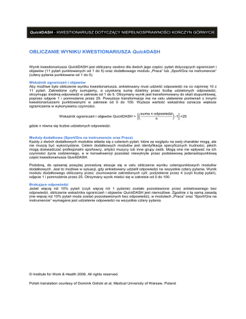 QuickDASH - KWESTIONARIUSZ DOTYCZĄCY NIEPEŁNOSPRAWNOŚCI KOŃCZYN GÓRNYCH d OBLICZANIE WYNIKU KWESTIONARIUSZA QuickDASH Wynik kwestionariusza QuickDASH jest obliczany osobno dla dwóch jego części: pytań dotyczących ograniczeń i objawów (11 pytań punktowanych od 1 do 5) oraz dodatkowego modułu „Praca” lub „Sport/Gra na instrumencie” (cztery pytania punktowane od 1 do 5). Wskaźnik ograniczeń i objawów Aby możliwe było obliczenie wyniku kwestionariusza, ankietowany musi udzielić odpowiedzi na co najmniej 10 z 11 pytań. Zakreślone cyfry sumujemy, a uzyskaną sumę dzielimy przez liczbę udzielonych odpowiedzi, otrzymując średnią odpowiedź w zakresie od 1 do 5. Otrzymany wynik jest transformowany do skali stupunktowej, poprzez odjęcie 1 i pomnożenie przez 25. Powyższa transformacja ma na celu ułatwienie porównań z innymi kwestionariuszami punktowanymi w zakresie od 0 do 100. Wyższa wartość wskaźnika oznacza większe ograniczenia w wykonywaniu czynności. Wskaźnik ograniczeń i objawów QuickDASH = suma n odpowiedzi -1 ×25 n gdzie n równa się liczbie udzielonych odpowiedzi. Moduły dodatkowe (Sport/Gra na instrumencie oraz Praca) Każdy z dwóch dodatkowych modułów składa się z czterech pytań, które ze względu na swój charakter mogą, ale nie muszą być wykorzystane. Celem dodatkowych modułów jest identyfikacja specyficznych trudności, jakich mogą doświadczać profesjonalni sportowcy, artyści muzycy lub inne grupy osób. Mogą one nie wpływać na ich czynności życia codziennego, a w konsekwencji pozostać niewykryte przez podstawową jedenastopunktową część kwestionariusza QuickDASH. Podobną, do opisanej powyżej procedurę stosuje się w celu obliczenia wyniku czteropunktowych modułów dodatkowych. Jest to możliwe w sytuacji, gdy ankietowany udzielił odpowiedzi na wszystkie cztery pytania. Wynik modułu dodatkowego obliczamy przez: zsumowanie zakreślonych cyfr, podzielenie przez 4 (czyli liczbę pytań), odjęcie 1 i pomnożenie przez 25. Otrzymany wynik mieści się w zakresie od 0 do 100. Brakujące odpowiedzi Jeżeli więcej niż 10% pytań (czyli więcej niż 1 pytanie) zostało pozostawione przez ankietowanego bez odpowiedzi, obliczenie wskaźnika ograniczeń i objawów QuickDASH jest niemożliwe. Zgodnie z tą samą zasadą (nie więcej niż 10% pytań może zostać pozostawionych bez odpowiedzi), w modułach „Praca” oraz “Sport/Gra na instrumencie” wymagane jest udzielenie odpowiedzi na wszystkie cztery pytania. © Institute for Work & Health 2006. All rights reserved. Polish translation courtesy of Dominik Golicki et al, Medical University of Warsaw, Poland