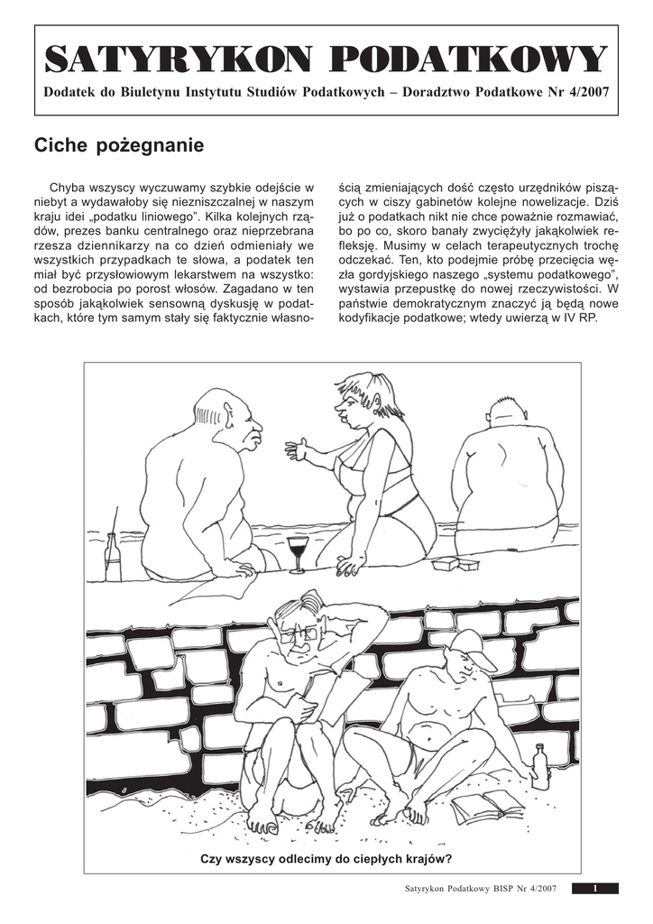 SATYRYKON PODATKOWY Dodatek do Biuletynu Instytutu Studiów Podatkowych Doradztwo Podatkowe Nr 4/2007 Ciche po¿egnanie Chyba wszyscy wyczuwamy szybkie odejcie w niebyt a wydawa³oby siê niezniszczalnej w naszym kraju idei podatku liniowego. Kilka kolejnych rz¹dów, prezes banku centralnego oraz nieprzebrana rzesza dziennikarzy na co dzieñ odmienia³y we wszystkich przypadkach te s³owa, a podatek ten mia³ byæ przys³owiowym lekarstwem na wszystko: od bezrobocia po porost w³osów. Zagadano w ten sposób jak¹kolwiek sensown¹ dyskusjê w podatkach, które tym samym sta³y siê faktycznie w³asno- ci¹ zmieniaj¹cych doæ czêsto urzêdników pisz¹cych w ciszy gabinetów kolejne nowelizacje. Dzi ju¿ o podatkach nikt nie chce powa¿nie rozmawiaæ, bo po co, skoro bana³y zwyciê¿y³y jak¹kolwiek refleksjê. Musimy w celach terapeutycznych trochê odczekaæ. Ten, kto podejmie próbê przeciêcia wêz³a gordyjskiego naszego systemu podatkowego, wystawia przepustkê do nowej rzeczywistoci. W pañstwie demokratycznym znaczyæ j¹ bêd¹ nowe kodyfikacje podatkowe; wtedy uwierz¹ w IV RP. Czy wszyscy odlecimy do ciep³ych krajów? Satyrykon Podatkowy BISP Nr 4/2007 1 Twórczy niepokój (podatkowy) ród³em najwiêkszych doznañ w tzw. procesie poznania prawa podatkowego jest lektura wyroków s¹dowych. Charakteryzuje siê niezmierzonym bogactwem myli i wyj¹tkow¹ oryginalnoci¹. Na tym tle oko³o 130 000 interpretacji urzêdowych wydanych od pocz¹tku 2005 r., charakteryzuj¹cych siê monotoni¹ powtórzeñ, wyroki s¹ barwne i zaskakuj¹ce. Wemy pierwszy z brzegu przyk³ad; okazuje siê ¿e, ustanowienie u¿ytkowania wieczystego jest w ich wietle... dostaw¹ towarów, za któr¹ nota bene p³aciæ bêdziemy przez prawie 100 lat. Przepis mówi co odwrotnego (¿e to jest us³uga) ale jak wiemy, przepisy nie maj¹ wiêkszego znaczenia. Je¿eli to ma byæ dostawa towarów, to wraz z ustanowieniem tego prawa trzeba wystawiæ fakturê. I tu pojawia siê k³opot: obrotem z tytu³u dostawy towarów jest ca³oæ kwoty naliczonej pomniejszonej o nale¿ny VAT. Czyli fakturê wystawiæ trzeba jednorazowo na wszystkie nale¿noci za prawie 100 lat: gminy bêd¹ musia³y go jednorazowo zap³aciæ. Gorsz¹ przys³ugê trudno sobie wyobraziæ, ale to ich zmartwienie. Fiskus siê cieszy, a najwiêksz¹ rewelacj¹ jest, ¿e powy¿szy pogl¹d wyra¿ony w judykaturze powsta³ z inicjatywy dzia³añ... lobby samorz¹du terytorialnego. Na drugi raz bêd¹ siedzieæ cicho. Cienko widzê nasz¹ (now¹) epokê Nowe podatki prorodzinne: nie po¿yczaj od bliskich Czy potomkowie agentów podlegaj¹ lustracji ju¿ od momentu poczêcia? 2 Satyrykon Podatkowy BISP Nr 4/2007 Na prze³omie roku media poda³y z triumfem, ¿e od po¿yczek udzia³owych w rodzinie nie bêdzie s³ynnego PCC, czyli podatku wynosz¹cego 2% po¿yczki. Wszystko po to, aby umacniaæ zwi¹zki rodzinne, choæ Polacy ¿r¹ siê w rodzinie nie tylko z powodu pieniêdzy. Warto jednak pamiêtaæ, ¿e podatek ten wynosi faktycznie 10 razy wiêcej, bo a¿ 20% po¿yczki, gdy jej udzielenie nast¹pi z rêki do rêki, czyli bez porednictwa banku lub przekazu pocztowego. A jest to raczej wyj¹tkiem, bo kto bratu po¿ycza pieni¹dze id¹c na pocztê? Jedno jest pewne: gdy gazety wykryj¹ oczywicie przypadkiem jaki przywilej podatkowy z regu³y okazuje siê on pu³apk¹ dla naiwnych. Po takiej wpadce nikt nie bêdzie chcia³ rodziny widzieæ nawet na pogrzebie. Wzorem VAT-u dla u¿ywanych podatników powinno obowi¹zywaæ zwolnienie od podatku Pospolite ruszenie (podatkowe) Ju¿ od co najmniej dziesiêciu lat nie mamy pomys³u jak zorganizowaæ tzw. proces tworzenia prawa podatkowego. Z regu³y opas³e projekty pisali doæ niscy rang¹ urzêdnicy resortu, które zatwierdza³y kolejne grupy wy¿szych oficjeli, a nastêpnie trafia³o to do Sejmu i Senatu, gdzie, poza kosmetyk¹, niewiele zmieniano. Nikt nie poczuwa³ siê do odpowiedzialnoci, produkt powstawa³ jednak w sposób demokratyczny, a wychodzi³o to co zawsze. Póniej zauwa¿ono problem lobbingu, który urós³ w naszym kraju do rangi z³ej czarownicy, któr¹ nale¿y mo¿liwie najszybciej wypleniæ. Byæ mo¿e nawet siê to czêciowo uda³o, ale o poprawie jakoci przepisów podatkowych mo¿emy tylko marzyæ. Ostatnim pomys³em by³o zwo³ywanie anonimowych zespo³ów, które pisa³y projekty wed³ug w³asnego pomys³u równie¿ bez jakiejkolwiek odpowiedzialnoci. Wprowadzono nawet forum internetowe, na którym ka¿dy mo¿e zg³aszaæ swoje projekty przepisów. Ten ostatni pomys³ wydaje siê szczególnie twórczy. Metoda pospolitego ruszenia jako sposób pisania ustaw jest na pewno bardzo oryginalna i byæ mo¿e powinna ulec upowszechnieniu na inne dziedziny ¿ycia publicznego. W internecie powinny byæ zamieszczone akta np. spraw karnych, a ka¿dy kto chce móg³by napisaæ projekt wyroku, a s¹d tylko wybra³by jeden sporód przed³o¿onych propozycji. Podobnie mo¿na by³oby rozwi¹zywaæ sprawy administracyjne. W koñcu w nazwie naszej Ojczyzny jest Rzecz POSPOLITA. Satyrykon Podatkowy BISP Nr 4/2007 3 Dekomunizacja podatków Wiemy, ¿e u progu IV RP najwa¿niejsze jest usuniêcie nêdznych resztek PeeReLu i to ze wszystkich dziedzin: z nazw ulic, pomników oraz wszystkiego co publiczne. Musimy bezwzglêdnie odci¹æ siê od tej tradycji, która jest nam tak obca, ¿e coraz bli¿si jestemy wspó³czuciu wszystkim (bez wyj¹tku) ofiarom komunizmu, w tym zw³aszcza bohaterom dzielnie broni¹cym Berlina przed bolszewickimi hordami w nies³awnym 1945 roku. Do pe³ni obrazu brakuje tylko ods³oniêcia pomnika volksdeutcha, który, w pewnym sensie, by³ przecie¿ prekursorem pojednania polsko-niemieckiego. Nie zapomnijmy o koniecznej dekomunizacji podatków. Co prawda prawie wszystkie s¹ tworem postPeeReLowskim, ale w ich wnêtrzu kryj¹ siê miazmaty komunizmu. Przyk³adów jest a¿ nadto. Dochód by³ego cz³onka PZPR jest ustalany tak samo jak praktykuj¹cego katolika, w dodatku z przesz³oci¹