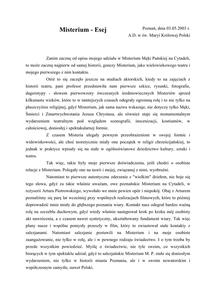 Poznań, dnia 03.05.2003 r. Misterium - Esej A.D. w św. Maryi Królowej Polski Zanim zacznę od opisu mojego udziału w Misterium Męki Pańskiej na Cytadeli, to może zacznę najpierw od samej historii, genezy Misterium, jako wielowiekowego teatru i mojego pierwszego z nim kontaktu. Otóż to się zaczęło jeszcze na studiach aktorskich, kiedy to na zajęciach z historii teatru, pani profesor przedstawiła nam pierwsze szkice, rysunki, fotografie, dagerotypy - słowem pierwowzory ówczesnych średniowiecznych Misteriów sprzed kilkunastu wieków, które to w tamtejszych czasach odegrały ogromną rolę i to nie tylko na płaszczyźnie religijnej, gdyż Misterium, jak sama nazwa wskazuje, nie dotyczy tylko Męki, Śmierci i Zmartwychwstania Jezusa Chrystusa, ale również staje się monumentalnym wydarzeniem teatralnym pod względem scenografii, inscenizacji, kostiumów, w całościowej, doniosłej i spektakularnej formie. Z czasem Misteria ulegały pewnym przeobrażeniom w swojej formie i widowiskowości, ale choć teoretycznie miały one początek w religii chrześcijańskiej, to jednak w praktyce wpisały się na stałe w ogólnoświatowe dziedzictwo kultury, sztuki i teatru. Tak więc, takie były moje pierwsze doświadczenia, jeśli chodzi o osobiste relacje z Misterium. Polegały one na teorii i mojej, związanej z nimi, wyobraźni. Natomiast to pierwsze autentyczne zderzenie z "wielkim" dziełem, nie boje się tego słowa, gdyż za takie właśnie uważam, owe poznańskie Misterium na Cytadeli, w reżyserii Artura Piotrowskiego, wywołało we mnie pewien opór i niepokój. Obaj z Arturem poznaliśmy się parę lat wcześniej przy wspólnych realizacjach filmowych, które to później doprowadzić mnie miały do głębszego poznania wiary. Kontakt nasz odegrał bardzo ważną rolę na szczeblu duchowym, gdyż wtedy właśnie następował krok po kroku mój osobisty akt nawrócenia, a z czasem nawet syntetyczny, ukształtowany fundament wiary. Tak więc plany nasze i wspólne pomysły przeszły w film, który to zwiastował stałe kontakty z salezjanami. Natomiast salezjanie postawili na Misterium i na moje osobiste zaangażowanie, nie tylko w rolę, ale i w pewnego rodzaju świadectwo. I o tym trzeba by przede wszystkim powiedzieć. Myślę o świadectwie, nie tyle swoim, co wszystkich biorących w tym spektaklu udział, gdyż to salezjańskie Misterium M. P. stało się doniosłym wydarzeniem, nie tylko w historii miasta Poznania, ale i w swoim nowatorskim i współczesnym zamyśle, nawet Polski. Spektakl, który w swojej istocie jest dziełem otwartym, to znaczy, że nie jest skonstruowany od początku do końca według ściśle określonego, w swojej precyzji scenariusza, gdyż pozostawia on, pomimo zarysowanej całości, naturalną wolność dla każdego, biorącego w nim udział, daje niezapomniane wrażenie, w ścisłym tego słowa znaczeniu - "Prawdy". Tak, prawdy istnienia, twórczego zaangażowania i co najważniejsze, prawdy obrazu odzwierciedlającego fakt historyczny i zawsze uniwersalny, jakim jest odkupienie Chrystusa Pana za grzechy ludzkości. Tłumy przychodzące, aby obejrzeć i doświadczyć tego widowiska, a było ich prawie zawsze kilkadziesiąt tysięcy, stanowią szczególną i wymowną odpowiedź na zapotrzebowanie i przeżycie owego sacrum, jakim jest Misterium. Świadectwa przeżyć i licznych nawróceń, mogą mówić same za siebie, to jest na pewno znak ducha czasu, w tym zlaicyzowanym i zsekularyzowanym świecie. Przez takie właśnie przedsięwzięcia, jakim jest Misterium, odbija się szerokim echem odwieczne ludzkie pragnienie na zaspokojenie własnego ducha. Dlatego dobrze jest, że tacy ludzie jak Artur Piotrowski, odczytują we właściwym dla siebie czasie swoją misję, powołanie, czy też swoje idee - jakkolwiek by to nazwać - realizacji ponadczasowego Dzieła Bożego. I chwała mu za to. Jeśli chodzi o mnie, to mój stosunek, z początku nie był zbyt entuzjastyczny. Bardziej traktowałem to, jako pewnego rodzaju, nowe wydarzenie artystyczne, może nawet swojego rodzaju - "happening", niż dzieło sztuki teatralnej. Górę wzięła w tym wszystkim lojalność do Artura, może nawet forma dziękczynienia z mojej strony dla tego wszystkiego, co dla mnie kiedyś zrobił oraz za ten niezatarty szlak wspólnych przygód, realizacji i tego wszystkiego, co jeszcze przed nami. Ale nie o tym miałem mówić, choć to wszystko się w pewnym sensie łączy i owocuje w jakiś szczególny mianownik wspólnego doświadczenia... Pamiętam dokładnie, jakie było moje pierwsze i chyba największe zdziwienie, kiedy reżyser zaproponował mi rolę Chrystusa. Było to w moim przekonaniu, tak mało realne i prawdopodobne, że aż w moim przypadku, wręcz paradoksalne i niemożliwe. Chrystus jako postać majestatyczna, wzniosła i ideał ludzkości był zawsze, w moim mniemaniu, poza wszelkim zasięgiem, nie tylko fizycznym i interpretacyjnym, ale przede wszystkim duchowym. Sam siebie, jeżeli już, to zawsze widziałem w postaci apostoła Piotra, który to jest odzwierciedleniem prawdziwie ludzkiej i analogicznie, bliskiej nam, charakterologicznie postaci. Pod każdym względem jego słabość, porywczość, pewnego rodzaju raptusowatość, przypomina nam o nas samych, równie zwodniczych i upadających. Choć w ostatecznym akcie, Piotr okaże gotowość do wyrwania się z człowieczej ułomności i powstanie, to jednak w efekcie daje nam zawsze uniwersalny obraz ludzkiej syntezy. Tak więc Piotr - to o nim myślałem i jego chciałem przedstawić, ale jak to w życiu bywa wszystkim rządzi przypadek, dziwny zbieg okoliczności, albo jak mawiał C. K. Norwid - "Ironia losu". Bo też, w tymże czasie przygotowań, było mi dane poznać Ziemowita Howadka, chłopaka starszego, postawnego i dużo dojrzalszego, zarówno pod względem religijnym, jak i duchowym. I to o tym właśnie chłopaku rosłym i brodatym, Artur miał powiedzieć, że będzie Piotrem i jakb