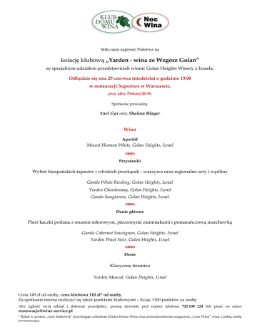 Miło nam zaprosić Państwa na kolację klubową „Yarden - wina ze Wzgórz Golan” ze specjalnym udziałem przedstawicieli winnic Golan Heights Winery z Izraela. Odbędzie się ona 29 czerwca (niedziela) o godzinie 19.00 w restauracji Superiore w Warszawie, przy ulicy Pieknej 28-34. Spotkanie prowadzą: Yael Gai oraz Shalom Blayer Wina Aperitif Mount Hermon White, Golan Heights, Izrael Przystawki Wybór hiszpańskich tapasów i włoskich przekąsek - warzywa oraz regionalne sery i wędliny Gamla White Riesling, Golan Heights, Izrael Yarden Chardonnay, Golan Heights, Izrael Gamla Sangiovese, Golan Heights, Izrael Danie główne Pierś kaczki podana z musem selerowym, pieczonymi ziemniakami i pomarańczową marchewką Gamla Cabernet Sauvignon, Golan Heights, Izrael Yarden Pinot Noir, Golan Heights, Izrael Deser Klasyczne tiramisu Yarden Muscat, Golan Heights, Izrael Cena 149 zł od osoby, cena klubowa 110 zł* od osoby. Za spotkanie można rozliczyć się także punktami klubowymi – licząc 1100 punktów za osobę. Aby zgłosić swój udział i dokonać przedpłaty. proszę dzwonić pod numer telefonu 722 100 224 lub pisać na adres [email protected] * Rabat w postaci „ceny klubowej” przysługuje członkom Klubu Domu Wina oraz prenumeratorom magazynu „Czas Wina” wraz z jedną osobą towarzyszącą.