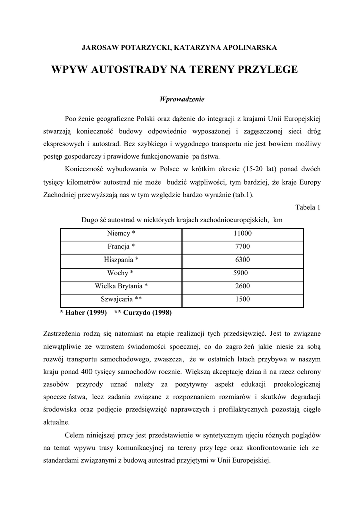JAROSAW POTARZYCKI, KATARZYNA APOLINARSKA WPYW AUTOSTRADY NA TERENY PRZYLEGE Wprowadzenie Poo Ŝenie geograficzne Polski oraz dąŜenie do integracji z krajami Unii Europejskiej stwarzają konieczność budowy odpowiednio wyposaŜonej i zagęszczonej sieci dróg ekspresowych i autostrad. Bez szybkiego i wygodnego transportu nie jest bowiem moŜliwy postęp gospodarczy i prawidowe funkcjonowanie pa ństwa. Konieczność wybudowania w Polsce w krótkim okresie (15-20 lat) ponad dwóch tysięcy kilometrów autostrad nie moŜe budzić wątpliwości, tym bardziej, Ŝe kraje Europy Zachodniej przewyŜszają nas w tym względzie bardzo wyraźnie (tab.1). Tabela 1 Dugo ść autostrad w niektórych krajach zachodnioeuropejskich, km Niemcy * 11000 Francja * 7700 Hiszpania * 6300 Wochy * 5900 Wielka Brytania * 2600 Szwajcaria ** 1500 * Haber (1999) ** Curzydo (1998) ZastrzeŜenia rodzą się natomiast na etapie realizacji tych przedsięwzięć. Jest to związane niewątpliwie ze wzrostem świadomości spoecznej, co do zagro Ŝeń jakie niesie za sobą rozwój transportu samochodowego, zwaszcza, Ŝe w ostatnich latach przybywa w naszym kraju ponad 400 tysięcy samochodów rocznie. Większą akceptację dziaa ń na rzecz ochrony zasobów przyrody uznać naleŜy za pozytywny aspekt edukacji proekologicznej spoecze ństwa, lecz zadania związane z rozpoznaniem rozmiarów i skutków degradacji środowiska oraz podjęcie przedsięwzięć naprawczych i profilaktycznych pozostają cięgle aktualne. Celem niniejszej pracy jest przedstawienie w syntetycznym ujęciu róŜnych poglądów na temat wpywu trasy komunikacyjnej na tereny przy lege oraz skonfrontowanie ich ze standardami związanymi z budową autostrad przyjętymi w Unii Europejskiej. Szkodliwe substancje Jedną z ujemnych stron rozwoju motoryzacji jest zanieczyszczenie atmosfery. Szacuje się, Ŝe w duŜych miastach spaliny emitowane przez samochody stanowią okoo 80% wszystkich zanieczyszczeń powietrza. Eksploatacja pojazdów samochodowych moŜe powodować zanieczyszczenia atmosfery poprzez: - niezupene spalanie mieszanki paliwowo-powietrzne j w silniku - parowanie naturalne - przeciekanie paliwa z ukadu zasilania W skad gazów spalinowych silników samochodowych wc hodzą substancje o róŜnej toksyczności dla czowieka: - obojętne (azot, tlen, para wodna, dwutlenek węgla) - toksyczne (tlenki azotu, tlenki siarki, tlenek węgla, węglowodory, nasycone i nienasycone aldehydy, sadza) - rakotwórcze (3, 4 benzopiren) Silniki spalinowe są jednym z podstawowych źróde emisji tlenków azotu do atmosfery, a tlenek węgla (czad) uwaŜany jest w wielu krajach za wskaźnik stopnia zanieczyszczenia powietrza (Skodowski 1995) . Węglowodory stanowią grupę związków chemicznych o róŜnej liczbie atomów węgla i wodoru, występujących w róŜnorodnych konfiguracjach. Do najaktywniejszych skadników spalin samochodowych z aliczyć naleŜy węglowodory z grupy olefin, z podwójnym wiązaniem między atomami węgla i wodoru. W pojazdach samochodowych część węglowodorów, zwaszcza o du Ŝych cząsteczkach, nie ulega spaleniu. Niektóre spalane są tylko częściowo, tworząc związki o zo Ŝonej budowie, sadzę i tlenek węgla. Reakcje nienasyconych węglowodorów z tlenkami azotu są gówn ą przyczyną powstawania tzw. smogu, a dziaanie rakotwórcze stw ierdzono w odniesieniu do cięŜkich węglowodorów aromatycznych typu pirenów. Benzopiren wykazuje niską toksyczność ostrą, lecz charakteryzuje się bardzo wyraźną toksycznością przewlek ą. Oznacza to, Ŝe pojedyncza duŜą dawka nie powoduje natychmiastowych skutków ujemnych, natomiast niewielka dawka podawana w sposób ciągy (na przykad na obszarach stale nara Ŝonych na zanieczyszczenia spalinami samochodowymi) znacząco zwiększa ryzyko zachorowania na raka. W odniesieniu do węglowodorów aromatycznych stwierdzono silne dziaani e kancerogenne. StęŜenia wielopierścieniowych węglowodorów aromatycznych są zazwyczaj większe w nie umytych warzywach i ziarnie zbóŜ pochodzących z terenów zanieczyszczonych (O’Neill 1998). Ograniczenia emisji zanieczyszczeń z silników samochodowych dokonuje się poprzez zastosowanie katalizatorów. Dziaanie wspóczesnych katalizatorów polega na: - „dopaleniu” nie spalonych w silniku węglowodorów do dwutlenku węgla i wody - przeksztaceniu tlenku w ęgla w dwutlenek węgla - rozkadzie tlenku azotu do azotu i tlenu Konsekwencją stosowania katalizatorów jest jednak zwiększona emisja platyny wokó tras komunikacyjnych. Wzrost koncentracji tego metalu stwierdzono między innymi w powietrzu nad jezdniami w duŜych miastach niemieckich (Jendryczko 1998). Wprawdzie wedug Światowej Organizacji Zdrowia (WHO), ilości platyny uwalniane z katalizatorów nie stanowią zagroŜenia dla zdrowia ludzi, to względnie krótki okres ekspozycji metalu do środowiska (w USA i Japonii obowiązek stosowania katalizatorów wprowadzono w roku 1975, w Europie Zachodniej w 1984 r., a w Polsce w 1997 r.) powoduje, Ŝe efekty biologiczne wywoywane przez emitowan ą z katalizatorów platynę pozostają nieznane. Nie bez znaczenia dla środowiska jest parowanie ciekych paliw samochodowy ch. Proces ten zachodzi zarówno w trakcie tankowania (rozlane paliwo) jak i po zatankowaniu samochodu (opary wydostające się ze zbiornika). NaleŜy pamiętać, Ŝe gorący silnik i ukad dolotowy powodują parowanie zarówno w trakcie jazdy jak i po wy ączeniu silnika. Inną kwestią jest natomiast sprawność, a raczej szczelność, ukadu zasilania pojazdu (wycieki benzyny i olejów). Pyy opadowe w okolicach ci ągów komunikacyjnych o duŜym natęŜeniu ruchu pojazdów są jednym z waŜniejszych nośników metali cięŜkich (Pb, Cd, Cu, Zn, Cr, Ni). Oów dodawany jest do benzyny w postaci czteroetylku oo wiu jako środek antystukowy i podwyŜszający liczbę oktanową paliwa, a zawartość tego metalu w powietrzu w 90% ma pochodzenie komunikacyjne. Większość związków oo