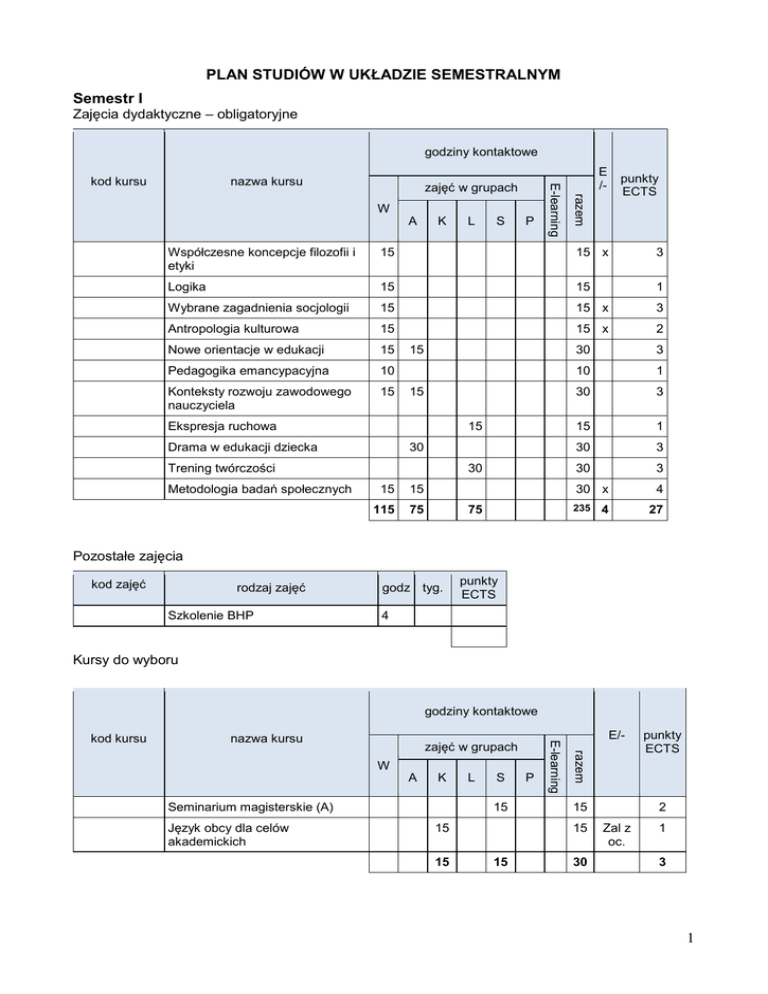 PLAN STUDIÓW W UKŁADZIE SEMESTRALNYM Semestr I Zajęcia dydaktyczne – obligatoryjne godziny kontaktowe nazwa kursu W A K L S P E /- punkty ECTS razem zajęć w grupach E-learning kod kursu Współczesne koncepcje filozofii i etyki 15 15 x 3 Logika 15 15 1 Wybrane zagadnienia socjologii 15 15 x 3 Antropologia kulturowa 15 15 x 2 Nowe orientacje w edukacji 15 30 3 Pedagogika emancypacyjna 10 10 1 Konteksty rozwoju zawodowego nauczyciela 15 30 3 15 1 30 3 30 3 30 x 4 15 15 Ekspresja ruchowa 15 Drama w edukacji dziecka 30 Trening twórczości Metodologia badań społecznych 30 15 15 115 75 235 75 4 27 Pozostałe zajęcia kod zajęć rodzaj zajęć Szkolenie BHP godz tyg. punkty ECTS 4 Kursy do wyboru godziny kontaktowe nazwa kursu W A K Seminarium magisterskie (A) Język obcy dla celów akademickich L S 15 15 15 P E/razem zajęć w grupach E-learning kod kursu 15 15 15 30 punkty ECTS 2 Zal z oc. 1 3 1 Semestr II Zajęcia dydaktyczne – obligatoryjne godziny kontaktowe nazwa kursu W A Prawa dziecka K L S P 15 Koncepcje poznawania dziecka E /razem zajęć w grupach E-learning kod kursu punkty ECTS 15 1 30 30 2 Współczesne koncepcje pedagogiki przedszkolnej 20 20 40 x 4 Współczesne koncepcje pedagogiki wczesnoszkolnej 20 20 40 x 4 30 30 3 10 1 Strategie wspierania rozwoju dziecka w przedszkolu (A) Strategie edukacji muzycznej w przedszkolu i klasach I-III (A) 10 Strategie edukacji plastycznej w przedszkolu i klasach I-III (A) 10 10 1 Strategie edukacji polonistycznej w klasach I-III 20 20 x 3 Strategie edukacji matematycznej w klasach I-III 20 20 x 3 Strategie edukacji środowiskowej w klasach I-III 20 20 x 3 55 170 235 10 5 25 Kursy do wyboru godziny kontaktowe nazwa kursu W A Action research w pracy nauczyciela (A) L S 15 Seminarium magisterskie (B) Wykład monograficzny K 15 15 15 15 15 P E /razem zajęć w grupach E-learning kod kursu punkty ECTS 15 1 15 2 15 2 45 5 2 Semestr III Zajęcia dydaktyczne – obligatoryjne godziny kontaktowe W A K L S P razem zajęć w grupach nazwa kursu E-learning kod kursu E /- punkty ECTS Podstawy wiedzy o sztuce 20 20 x 3 Konstruktywizm w edukacji dziecka 10 10 1 Konwersatorium pedagogiczne 30 30 3 Strategie wspierania rozwoju dziecka w przedszkolu (B) 30 30 x 4 Strategie wspierania rozwoju ucznia w edukacji zintegrowanej 30 30 3 15 x 2 Strategie edukacji muzycznej w przedszkolu i klasach I-III (B) 15 Strategie edukacji plastycznej w przedszkolu i klasach I-III (B) 15 15 x 2 Strategie edukacji technicznej w przedszkolu i klasach I-III 25 25 x 3 Strategie wychowania fizycznego w przedszkolu i klasach I-III 15 15 1 Konstruowanie programów i projektów edukacyjnych 30 30 3 30 175 220 15 5 25 Kursy do wyboru godziny kontaktowe zajęć w grupach W A Action research w pracy nauczyciela (B) K L S 15 Seminarium magisterskie (C) 15 Kultura fizyczna 30 45 14 P razem nazwa kursu E-learning kod kursu E /- punkty ECTS 15 2 15 2 30 1 60 5 Pozostałe zajęcia kod zajęć rodzaj zajęć Prezentacja modułów poszerzających do wyboru godz tyg. punkty ECTS 1 3 Semestr IV Zajęcia dydaktyczne – obligatoryjne godziny kontaktowe nazwa kursu W A K L S P E /razem zajęć w grupach E-learning kod kursu punkty ECTS Kultura organizacyjna instytucji oświatowych 15 15 1 Koncepcja partnerstwa edukacyjnego 15 15 1 Wybrane zagadnienia konektywizmu 10 10 1 30 3 15 1 85 7 Media w edukacji dziecka Neurodydaktyka w nauczaniu i uczeniu się 30 15 55 30 Kursy do wyboru godziny kontaktowe nazwa kursu W A K L S Projekt edukacyjny w przedszkolu lub klasach I-III Action research w pracy nauczyciela (C) P 10 15 Seminarium magisterskie (D) 15 15 15 10 E /razem zajęć w grupach E-learning kod kursu punkty ECTS 10 3 15 1 15 7 40 11 Moduły poszerzające do wyboru Kod modułu Nazwa modułu punkty ECTS Moduł poszerzający przygotowanie w zakresie pedagogicznym (profil ogólny) 12 Moduł poszerzający przygotowanie w zakresie edukacji plastycznej i muzycznej (profil edukacji plastycznej i muzycznej) 12 Moduł poszerzający przygotowanie w zakresie diagnozy i terapii pedagogicznej (profil terapeutyczny) 12 4 Moduł poszerzający przygotowanie w zakresie pedagogicznym (profil ogólny) godziny kontaktowe nazwa kursu W A K L S P E /razem zajęć w grupach E-learning kod kursu punkty ECTS Pedagogika ogólna w dobie przemian 10 10 20 x 4 Andragogika 10 10 20 x 4 20 20 2 20 20 2 20 80 2 12 Pedagogika porównawcza Edukacja dla zrównoważonego rozwoju 20 40 Moduł poszerzający przygotowanie w zakresie edukacji plastycznej i muzycznej (profil edukacji plastycznej i muzycznej) godziny kontaktowe nazwa kursu W A Dziecięcy repertuar muzyczny K L S P 20 Projektowanie wielostronnej aktywności muzycznej dziecka w przedszkolu i w klasach I-III 2 20 x 4 20 2 20 20 x 4 60 80 2 12 Eksperymenty twórcze w technikach plastycznych 20 20 punkty ECTS 20 20 Projektowanie wieloaspektowej aktywności plastycznej dziecka w przedszkolu i w klasach I-III E /razem zajęć w grupach E-learning kod kursu Moduł poszerzający przygotowanie w zakresie diagnozy i terapii pedagogicznej (profil terapeutyczny) godziny kontaktowe nazwa kursu W A Modele diagnozy i terapii zaburzeń psychicznych Terapia z rodziną dysfunkcyjną i dzieckiem krzywdzonym L 20 20 Rozwiązywanie problemów wychowawczych Wspieranie dzieci z zaburzeniami K 20 20 S P E /razem zajęć w grupach E-learning kod kursu punkty ECTS 20 x 4 20 x 4 20 2 20 2 5 psychomotorycznymi w przedszkolu i w szkole 20 40 20 80 2 12 Informacje uzupełniające: rozkład „ćwiczeń praktycznych w szkole” na: zajęcia praktyczne (godziny zajęć z uczniami/wychowankami w szkole/placówce) zajęcia teoretyczne (analizy merytoryczno-dydaktyczne hospitowanych zajęć) sem. 4 kod kursu zajęcia nazwa kursu Projekt edukacyjny w przedszkolu lub klasach I-III p t 8 2 8 2 6