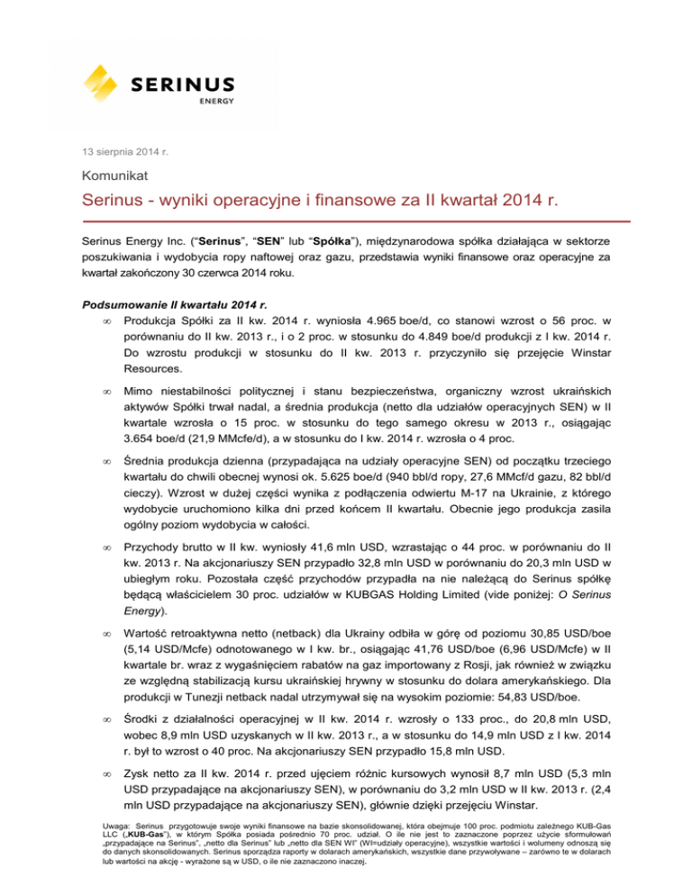 13 sierpnia 2014 r. Komunikat Serinus - wyniki operacyjne i finansowe za II kwartał 2014 r. Serinus Energy Inc. (“Serinus”, “SEN” lub “Spółka”), międzynarodowa spółka działająca w sektorze poszukiwania i wydobycia ropy naftowej oraz gazu, przedstawia wyniki finansowe oraz operacyjne za kwartał zakończony 30 czerwca 2014 roku. Podsumowanie II kwartału 2014 r. • Produkcja Spółki za II kw. 2014 r. wyniosła 4.965 boe/d, co stanowi wzrost o 56 proc. w porównaniu do II kw. 2013 r., i o 2 proc. w stosunku do 4.849 boe/d produkcji z I kw. 2014 r. Do wzrostu produkcji w stosunku do II kw. 2013 r. przyczyniło się przejęcie Winstar Resources. • Mimo niestabilności politycznej i stanu bezpieczeństwa, organiczny wzrost ukraińskich aktywów Spółki trwał nadal, a średnia produkcja (netto dla udziałów operacyjnych SEN) w II kwartale wzrosła o 15 proc. w stosunku do tego samego okresu w 2013 r., osiągając 3.654 boe/d (21,9 MMcfe/d), a w stosunku do I kw. 2014 r. wzrosła o 4 proc. • Średnia produkcja dzienna (przypadająca na udziały operacyjne SEN) od początku trzeciego kwartału do chwili obecnej wynosi ok. 5.625 boe/d (940 bbl/d ropy, 27,6 MMcf/d gazu, 82 bbl/d cieczy). Wzrost w dużej części wynika z podłączenia odwiertu M-17 na Ukrainie, z którego wydobycie uruchomiono kilka dni przed końcem II kwartału. Obecnie jego produkcja zasila ogólny poziom wydobycia w całości. • Przychody brutto w II kw. wyniosły 41,6 mln USD, wzrastając o 44 proc. w porównaniu do II kw. 2013 r. Na akcjonariuszy SEN przypadło 32,8 mln USD w porównaniu do 20,3 mln USD w ubiegłym roku. Pozostała część przychodów przypadła na nie należącą do Serinus spółkę będącą właścicielem 30 proc. udziałów w KUBGAS Holding Limited (vide poniżej: O Serinus Energy). • Wartość retroaktywna netto (netback) dla Ukrainy odbiła w górę od poziomu 30,85 USD/boe (5,14 USD/Mcfe) odnotowanego w I kw. br., osiągając 41,76 USD/boe (6,96 USD/Mcfe) w II kwartale br. wraz z wygaśnięciem rabatów na gaz importowany z Rosji, jak również w związku ze względną stabilizacją kursu ukraińskiej hrywny w stosunku do dolara amerykańskiego. Dla produkcji w Tunezji netback nadal utrzymywał się na wysokim poziomie: 54,83 USD/boe. • Środki z działalności operacyjnej w II kw. 2014 r. wzrosły o 133 proc., do 20,8 mln USD, wobec 8,9 mln USD uzyskanych w II kw. 2013 r., a w stosunku do 14,9 mln USD z I kw. 2014 r. był to wzrost o 40 proc. Na akcjonariuszy SEN przypadło 15,8 mln USD. • Zysk netto za II kw. 2014 r. przed ujęciem różnic kursowych wynosił 8,7 mln USD (5,3 mln USD przypadające na akcjonariuszy SEN), w porównaniu do 3,2 mln USD w II kw. 2013 r. (2,4 mln USD przypadające na akcjonariuszy SEN), głównie dzięki przejęciu Winstar. Uwaga: Serinus przygotowuje swoje wyniki finansowe na bazie skonsolidowanej, która obejmuje 100 proc. podmiotu zależnego KUB-Gas LLC („KUB-Gas”), w którym Spółka posiada pośrednio 70 proc. udział. O ile nie jest to zaznaczone poprzez użycie sformułowań „przypadające na Serinus”, „netto dla Serinus” lub „netto dla SEN WI” (WI=udziały operacyjne), wszystkie wartości i wolumeny odnoszą się do danych skonsolidowanych. Serinus sporządza raporty w dolarach amerykańskich, wszystkie dane przywoływane – zarówno te w dolarach lub wartości na akcję - wyrażone są w USD, o ile nie zaznaczono inaczej. • Serinus odnotował w II kwartale 2014 r. całkowity dochód w wysokości 6,7 mln USD. Wpływ na całkowity dochód miało ujęcie niezrealizowanych ujemnych różnic kursowych w wysokości 2,0 mln USD. Jest to związane z przeliczeniem sprawozdań finansowych ukraińskich spółek zależnych z UAH na USD i odzwierciedla osłabienie kursu UAH. W związku z tym, że kurs wymiany ulega wahaniom, zmienia się równowartość wykazywana w dolarach amerykańskich, nie wpływa to jednak na zdolność tych aktywów lub zobowiązań do realizacji założonych dla nich celów. Jeśli hrywna się umocni, część lub całość tej niezrealizowanej straty zostanie odrobiona. • Nakłady inwestycyjne w II kwartale br. wyniosły 16,1 mln USD, w porównaniu do 9,3 mln USD w analogicznym okresie roku 2013. • W trakcie II kwartału KUB-Gas LLC dokonał wypłaty dywidendy w wysokości 10,5 mln USD (7,35 mln USD dla udziałów operacyjnych SEN). • W II kw. 2014 r. Spółka dokonała dwóch wcześniejszych spłat - na łączną kwotę 7 mln USD zabezpieczonej pożyczki, udzielonej przez Dutco Energy Limited. Następnie, w okresie po 30 czerwca 2014 r. Spółka spłaciła jeszcze 8 mln USD pożyczki, która tym samym została ostatecznie rozliczona. Podsumowanie wyników finansowych (w tys. USD, o ile nie zaznaczono inaczej) Trzy miesiące zakończone 30 czerwca 2014 41.635 2013 28.929 Zmiana 44% Zysk za okres (wg Sprawozdania) na akcję - podstawowy i rozwodniony 8.733 $0,11 3.181 $0,06 175% Zysk za okres (przypadajacy na Serinus) na akcję - podstawowy i rozwodniony 5.344 $0,07 829 $0,02 545% Całkowity dochód na akcję - podstawowy i rozwodniony 6.737 $0,09 3.181 $0,06 112% 20.840 $0,27 8.928 $0,18 133% $15.778 $0,20 ($4.078) ($0,08) Nakłady inwestycyjne 16.059 9.258 73% Średnia produkcja (netto dla Serinus) Ropa naft. (Bbl/d) Gaz (Mcf/d) Ciecze (Bbl/d) BOE (boe/d) 982 23.293 101 4.965 18.331 124 3.179 27% (19%) 56% $108,13 $10,56 $77,79 $76,72 nd $11,55 $88,76 $70,02 30 czerwca 2014 15.719 (11.727) 15.413 2013 19.253 9.524 5.352 Przychody ze sprzedaży ropy naftowej i gazu Przepływy z działal.operacyjnej (wg Sprawozdania) na akcję - podstawowy i rozwodniony Przepływy z działal.operacyjnej (przyp. na Serinus) na akcję - podstawowy i rozwodniony Średnia cena sprzedaży Ropa naft. (USD/Bbl) (USD/Mcf) Gaz Ciecze (USD/Bbl) BOE (USD/boe) Środki pieniężne i inne aktywa pieniężne Kapitał obrotowy Kredyt długoterminowy Liczba akcji Na koniec okresu Średnio w okresie (podstawowa) Średnio w