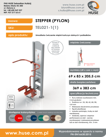 FHU HUSE Sebastian Hulbój www.huse.com.pl [email protected] [email protected] Bielsko-Biała 43-300 ul. Zielona 6 tel. +48 600 269 537 NIP: 937 217 63 61 nazwa: STEPPER (PYLON) SKU: TEL021-1(1) opis produktu: Umożliwia ćwiczenie mięśni kończyn dolnych i pośladków. INSTRUKCJA ĆWICZENIA Z KODEM QR ORAZ WARUNKI UŻYTKOWANIA UMIESZCZONE NA PYLONIE mięśnie ćwiczone: Wysokość swobodnego upadku: 43 cm wymiary (dł x szer x wys): 69 x 83 x 205,5 cm strefa bezpieczeństwa: 369 x 383 cm specyfikacja techniczna: MAX 120kg MIN 140cm dostępna kolorystyka: 7040 3020 7040 5003 (i wiele innych według wzornika RAL) 6005 1015 www.huse.com.pl 8016 1015 • Rury stalowe ocynkowane min. 3 mm grubości • Średnice rur: 33, 38, 42, 60, 90, 114 mm • Malowane dwukrotnie proszkowo • Rączki plas�kowe • Łożyska zamknięte, śruby ze stali nierdzewnej • Siedziska, oparcia i stopnice perforowane ze stali czarnej ocynkowanej i malowanej proszkowo lub ze stali nierdzewnej, min. 3 mm Wyprodukowano w oparciu o normy PN-EN16630:2015