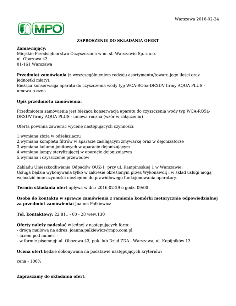 Warszawa 2016-02-24 ZAPROSZENIE DO SKŁADANIA OFERT Zamawiający: Miejskie Przedsiębiorstwo Oczyszczania w m. st. Warszawie Sp. z o.o. ul. Obozowa 43 01-161 Warszawa Przedmiot zamówienia (z wyszczególnieniem rodzaju asortymentu/towaru jego ilości oraz jednostki miary): Bieżąca konserwacja aparatu do czyszczenia wody typ WCA-RO5a-DRXUV firmy AQUA PLUS umowa roczna Opis przedmiotu zamówienia: Przedmiotem zamówienia jest bieżąca konserwacja aparatu do czyszczenia wody typ WCA-RO5aDRXUV firmy AQUA PLUS - umowa roczna (wzór w załączeniu) Oferta powinna zawierać wycenę następujących czynności: 1.wymiana złoża w odżelaziaczu 2.wymiana kompletu filtrów w aparacie zasilającym zmywarkę oraz w dejonizatorze 3.wymiana kolumn jonitowych w aparacie dejonizującym 4.wymiana lampy sterylizującej w aparacie dejonizującym 5.wymiana i czyszczenie przewodów Zakładu Unieszkodliwiania Odpadów OUZ-1 przy ul. Kampinoskiej 1 w Warszawie. Usługa będzie wykonywana tylko w zakresie określonym przez WykonawcĘ i w skład usługi mogą wchodzić inne czynności niezbędne do prawidłowego funkcjonowania aparatury. Termin składania ofert upływa w dn.: 2016-02-29 o godz. 09:00 Osoba do kontaktu w sprawie zamówienia z ramienia komórki metorycznie odpowiedzialnej za przedmiot zamówienia: Joanna Pałkiewicz Tel. kontaktowy: 22 811 - 00 - 28 wew.130 Oferty należy nadesłać w jednej z następujących form: - drogą mailową na adres: [email protected] - faxem pod numer: - w formie pisemnej: ul. Obozowa 43, pok. lub Dział ZDA - Warszawa, ul. Kopijników 13 Ocena ofert będzie dokonywana na podstawie następujących kryteriów: cena - 100% Zapraszamy do składania ofert.
