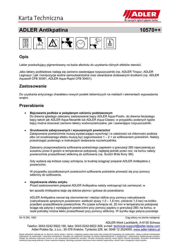 ADLER Antikpatina 10570++ Opis Lakier prześwitujący pigmentowany na bazie alkoholu do uzyskania różnych efektów starości. Jako lakiery podkładowe nadają się zarówno zawierające rozpuszczalniki (np. ADLER Tiropur, ADLER Legnopur ) jak i kompozycje wodne samoutwardzalne oraz utwardzane dodawanymi środkami (np. ADLER Aquasoft CFB 30361, ADLER Aqua-Rapid CFB 30451). Zastosowanie Do uzyskania antycznego charakteru nowych powłok lakierniczych na meblach i elementach wyposażenia wnętrz. Przerabianie Bejcowanie podłoża w pożądanym odcieniu podstawowym Do drewna iglastego zalecamy zastosowanie bejcy ADLER Aqua-Positiv, do drewna liściastego bejcy takich jak ADLER Aqua-Neoantik lub ADLER Aqua-Classic; w przypadku podanych typów bejcy można stosować zarówno lakiery wodorozcieńczalne, jak i zawierające rozpuszczalniki. Gruntowanie zabejcowanych i wysuszonych powierzchni Zabejcowane powierzchnie muszą wystarczająco wyschnąć i w zależności od chłonności podłoża albo od oczekiwanego efektu muszą być zagruntowane 1 – 2 × ze szlifowaniem pośrednim. Należy przestrzegać podanego w instrukcjach dodawania rozcieńczalnika. Zalecamy przeprowadzenia szlifowania pośredniego papierem o granulacji 280 najwcześniej po suszeniu przez 6 godzin w temperaturze pokojowej, najlepiej jednak przez noc; na końcu należy powierzchnie przeszlifować włókniną do szlifowania (np. Scotch Brite firmy 3M). Gdy wybiera się krótsze czasy schnięcia, to trudniej ściągnąć preparat ADLER Antikpatina z powierzchni. W przypadku szczotkowanych powierzchni szlifowanie pośrednie prowadzi się przy pomocy włókniny do szlifowania. Uzyskiwanie efektu antyku Przed zastosowaniem preparat ADLER Antikpatina należy wstrząsnąć lub zamieszać; w ten sposób Antikpatina staje się dobrze płynna i gotowa do przerabiania ADLER Antikpatina nanosi się równomiernie i niezbyt obficie przy pomocy natryskiwania (natryskiwanie sprężonym powietrzem: wielkość dyszy 1,5 – 1,8 mm, ciśnienie 1,5 bar) na krótko przedtem przeszlifowane powierzchnie. Po czasie schnięcia ok. 20 min w temperaturze pokojowej ściąga się patynę z wystających powierzchni przy pomocy papieru o granulacji 280; na końcu, w razie potrzeby można lekko przeszlifować przy pomocy włókniny. W wyniku tego patyna pozostaje 04-10 ZKL 1003 Ciąg dalszy na stronie następnej ADLER-Werk Lackfabrik, A-6130 Schwaz Telefon: 0043-5242 6922-190, faks: 0043-5242-6922-309, e-mail: [email protected] Adler-Polska Sp. z o.o., 30-376 Kraków, Tyniecka 229, tel. 0048 12 2524000, www.adler-lakiery.pl Nasze wskazówki opierają się na obecnym stanie wiedzy i zgodnie z najlepszą wiedzą mają służyć jako porada dla kupującego lub użytkownika, należy je jednak indywidualnie dostosować do zastosowań i warunków przerabiania. Kupujący lub użytkownik decyduje na własną odpowiedzialność o przydatności i zastosowaniu dostarczanego produktu, dlatego też zalecamy wykonanie wzorca w celu sprawdzenia przydatności produktu. Ponadto zachowują ważność nasze Ogólne Warunki Sprzedaży. Wszystkie wcześniejsze instrukcje tracą swoją ważność z dniem wydania niniejszej. Zastrzega się prawo dokonania zmian wielkości pojemników, odcieni barw i dostępnych stopni połysku. Ciąg dalszy ADLER Antikpatina 10570++ w zagłębieniach i kątach wyprofilowanych części i nadaje przedmiotowi pożądany antyczny charakter. Należy unikać nanoszenia bardzo dużych ilości ADLER Antikpatina. Jeżeli się tego nie przestrzega, to lakier nawierzchniowy będzie wykazywał mniejszą przyczepność w tych miejscach. Lakierowanie nawierzchniowe powierzchni Końcowe lakierowanie nawierzchniowe należy przeprowadzić stosując normalne ilości (patrz Instrukcja stosowanego lakieru); nie można stosować zbyt małych ilości. W celu uzyskania dobrej przyczepności między warstwami ważnym jest, by szlifowanie pośrednie, następujące po tym naniesienie i ściągnięcie nadmiaru ADLER Antikpatina oraz lakierowanie nawierzchniowe zostały przeprowadzone w ciągu 8 godzin. Dłuższe przerwy doprowadzają do obniżenia przyczepności. Proszę zapoznać się z właściwą Kartą Charakterystyki. Dane charakterystyczne Rozjaśniać, rozcieńczać Czyszczenie narzędzi pracy ADLER Antikpatina Farblos 10580 Aceton NITRO Verdünnung 80001 Forma dostawy 750 ml, 5 l Trwałość 1 rok w oryginalnie zamkniętych pojemnikach. Odcienie barwy Creme (kremowy) Beige (beżowy) Grau (szary) Dunkelbraun (ciemnobrązowy) Rotbraun (czerwonobrązowy) 10571 10572 10573 10574 10576