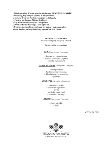 Piknie prosimy Wos do góralskiej chałupy SKANSEN SMAKÓW. Położonej przy samym zalewie w Kryspinowie, 2 minuty drogi od Portu Lotniczego w Balicach, 15 minut od Starego Miasta Krakowa, Przy drodze tranzytowej do Oświęcimia 300 m od Parku linowego i toru offroad W piknych góralskich wnętrzach serwujemy najwspanialsze dania kuchni polskiej i możemy ugościć do 350 Gości PROPOZYCJA MENU I na obiad dla grup powyżej 10 osób Pajdy chleba ze smalcem ZUPA ( do wyboru 1 pozycja ) - kwaśnica z ziemniakiem, - barszcz czerwony z jajkiem - rosół z makaronem DANIE GŁÓWNE ( do wyboru 1 pozycja) - schab pieczony, - karkówka marynowana, - filet drobiowy z żurawiną - pierogi DODATKI ( do wyboru 2 pozycje) - ziemniaki z wody, - ziemniaki zapiekane, - frytki - surówka z marchwi, - surówka z kapusty DESER ( do wyboru 1 pozycja) - ciasto wiejskie, - lody CENA: 29 PLN PROPOZYCJA MENU II Pajdy chleba ze smalcem PRZYSTAWKA ( do wyboru 1 pozycja) - oscypek z żurawiną, - pasztet domowej roboty ZUPA ( do wyboru 1 pozycja ) - żurek z jajkiem i kiełbasą, - zupa gulaszowa, - rosół z makaronem DANIE GŁÓWNE ( do wyboru 1 pozycja) - schab ze śliwką, - żeberko w miodzie, - rolada drobiowa nadziewana jabłkami - kotlet schabowy - pstrąg smażony DODATKI ( do wyboru 1 pozycja) - ziemniaki z wody, - ziemniaki zapiekane, - frytki - kasza gryczana SAŁATKI ( do wyboru 1 pozycja) - zestaw surówek, - kapusta zasmażana - warzywa smażone z czosnkiem DESER ( do wyboru 1 pozycja) - sernik na ciepło z czekoladą - puchar lodowy NAPÓJ ( do wyboru 1 pozycja) - woda, - kawa, - herbata, - sok owocowy CENA: 40 PLN PROPOZYCJA MENU III Pajdy chleba ze smalcem PRZYSTAWKA: - łosoś wędzony - oscypek z żurawiną i boczkiem ZUPA ( do wyboru 1 pozycja ) - grzybowa w czarce chlebowej, - barszcz z krokietem, - krem ze szparagów z groszkiem ptysiowym DANIE GŁÓWNE ( do wyboru 1 pozycja) - pieczeń z polędwicy wieprzowej z kurkami, - łosoś pieczony, - kaczka z jabłkami, - szynka pieczona z żurawiną - rostbef wołowy z czosnkiem DODATKI ( do wyboru 1 pozycja) - ziemniaki z wody, - ziemniaki zapiekane, - frytki - kasza gryczana SAŁATKI ( do wyboru 1 pozycja) - zestaw surówek, - kapusta zasmażana - buraczki na gorąco - warzywa z wody DESER ( do wyboru 1 pozycja) - sernik na ciepło z czekoladą - szarlotka na ciepło z lodami - panna cotta z czekoladą - puchar lodowy z owocami NAPOJE ( bez ograniczeń) - woda, - kawa, - herbata, - sok owocowy WINO: - lampka wina CENA: 65 PLN DODATKOWE OPCJE: SŁODKA ZAGRODA: Ciasta wiejskie różnego rodzaju - 10 PLN/ os MORSKA PŁYTA Śledzie w trzech rodzajach - 12 PLN/ os MISY SAŁAT do wyboru 3 rodzaje sałat: wiosenna, ziemniaczana, jarzynowa, z tuńczykiem i kukurydzą, grecka - 12 PLN/ os JAJA FASZEROWANE NA TRZY SPOSOBY - 12 PLN/ os WIELKIE GRILOWANIE: Kiełbaski, karczki, ziemniaczki zapiekane * degustacja grillowych specjałów, dostępna tylko w sezonie letnim - 20 PLN/ os Dodatkowe atrakcje kulinarne: STÓŁ WIEJSKI - kiełbasy staropolskie, kaszanki wiejskie, pasztety, bigos, chleb wiejski, smalec, ogórki kiszone,.; 19 PLN/ os ( min 30 os) stół można wzbogacać w udżca wieprzowego: 400zł, prosię pieczone w całości: 800 zł dla ok. 40 os lub 19 PLN/ os ALKOHOLE: Piwo grzane z miodem – 8zł 0,5l Wino grzane – 8zł 0,2l Wino stołowe 30zł 0,7l. Piwo Żywiec –500zł - 50l. Wódka Gorzka Żołądkowa 32 PLN Wódka Wyborowa 0,5l. – 39zł Wódka Finlandia 0,5l – 55zł Wódka Absolut 0,5l – 60zł Smirnoff Black 0,7l – 70zł Proponujemy dodatkowe atrakcje: Kapela góralska do 4 h Kapela góralska z parą taneczną Śpasy góralskie: zabawa z góralami, konkursy 800 PLN 1150 PLN od 3300 PLN Z przyjemnością przygotujemy dla Państwa tematyczne spotkania taneczne, warsztaty regionalne, bankiety oraz spotkania sportowe. Dzięki współpracy z naszymi partnerami możemy Państwu zaproponować obsługę muzyczną, florystyczną oraz atrakcje sportowe.