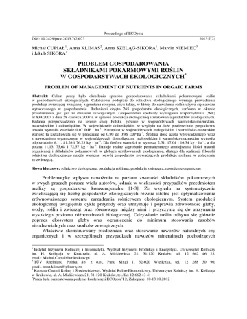 Proceedings of ECOpole DOI: 10.2429/proc.2013.7(2)073 2013;7(2) Michał CUPIAŁ1, Anna KLIMAS2, Anna SZELĄG-SIKORA1, Marcin NIEMIEC3 i Jakub SIKORA1 PROBLEM GOSPODAROWANIA SKŁADNIKAMI POKARMOWYMI ROŚLIN W GOSPODARSTWACH EKOLOGICZNYCH* PROBLEM OF MANAGEMENT OF NUTRIENTS IN ORGAIC FARMS Abstrakt: Celem pracy było określenie sposobu gospodarowania składnikami pokarmowymi roślin w gospodarstwach ekologicznych. Całościowe podejście do rolnictwa ekologicznego wymaga prowadzenia produkcji zwierzęcej związanej z gruntami rolnymi, czyli takiej, w której do nawożenia roślin używa się nawozu wytworzonego w gospodarstwie. Badaniami objęto 265 gospodarstw ekologicznych, zarówno w okresie przestawiania, jak, już ze statusem ekologicznym. Gospodarstwa spełniały wymagania rozporządzenia (WE) nr 834/2007 z dnia 28 czerwca 2007 r. w sprawie produkcji ekologicznej i znakowania produktów ekologicznych. Badania przeprowadzono na terenie całej Polski, głównie w województwach warmińsko-mazurskim, mazowieckim i dolnośląskim. W województwie dolnośląskim ze względu na duże powierzchnie gospodarstw obsada wynosiła zaledwie 0,07 DJP · ha–1. Natomiast w województwach małopolskim i warmińsko-mazurskim wartość ta kształtowała się w przedziale od 0,90 do 0,96 DJP·ha–1. Średnia ilość azotu wprowadzonego wraz z nawożeniem organicznym w województwach dolnośląskim, małopolskim i warmińsko-mazurskim wynosiła odpowiednio 6,11, 81,26 i 76,23 kg · ha–1. Dla fosforu wartości te wynoszą 2,51, 17,04 i 16,34 kg · ha–1, a dla potasu 11,13, 75,68 i 72,57 kg · ha–1. Istnieje realne zagrożenie permanentnego zmniejszania ilości materii organicznej i składników pokarmowych w glebach użytkowanych ekologicznie, dlatego dla realizacji filozofii rolnictwa ekologicznego należy wspierać rozwój gospodarstw prowadzących produkcję roślinną w połączeniu ze zwierzęcą. Słowa kluczowe: rolnictwo ekologiczne, produkcja roślinna, produkcja zwierzęca, nawożenie organiczne Problematykę wpływu nawożenia na poziom zwartości składników pokarmowych w swych pracach porusza wielu autorów, jednak w większości przypadków przedmiotem analizy są gospodarstwa konwencjonalne [1-3]. Ze względu na systematycznie zwiększającą się liczbę gospodarstw ekologicznych równie istotne jest optymalizowanie zrównoważonego systemu zarządzania rolnictwem ekologicznym. System produkcji ekologicznej uwzględnia cykle przyrody oraz utrzymuje i poprawia zdrowotność gleby, wody, roślin i zwierząt oraz równowagę między nimi i przyczynia się do utrzymania wysokiego poziomu różnorodności biologicznej. Odżywianie roślin odbywa się głównie poprzez ekosystem gleby oraz ograniczenie do minimum stosowania zasobów nieodnawialnych oraz środków zewnętrznych. Właściwie skonstruowany płodozmian oraz stosowanie nawozów naturalnych czy organicznych i w szczególnych przypadkach nawozów mineralnych pochodzących 1 Instytut Inżynierii Rolniczej i Informatyki, Wydział Inżynierii Produkcji i Energetyki, Uniwersytet im. H. Kołłątaja w Krakowie, al. A. Mickiewicza 21, 31-120 Kraków, tel. 12 662 email: [email protected] 2 TÜV Rheinland Polska Sp. z o.o., Park Kingi 1, 32-020 Wieliczka, tel. 12 288 email: [email protected] 3 Katedra Chemii Rolnej i Środowiskowej, Wydział Rolno-Ekonomiczny, Uniwersytet Rolniczy im. H. w Krakowie, al. A. Mickiewicza 21, 31-120 Kraków, tel./fax 12 662 43 41 * Praca była prezentowana podczas konferencji ECOpole’12, Zakopane, 10-13.10.2012 Rolniczy 46 23, 30 90, Kołłątaja 554 Michał Cupiał, Anna Klimas, Anna Szeląg-Sikora, Marcin Niemiec i Jakub Sikora z naturalnych kopalin jest podstawą utrzymania żyzności gleby, stabilności plonowania roślin w dłuższym okresie czasu i zbilansowania składników pokarmowych w gospodarstwie [4]. Do celów nawozowych wykorzystuje się szeroki asortyment tradycyjnych nawozów organicznych pochodzenia zwierzęcego i roślinnego, jak np. obornik, gnojowica, pomiot ptasi, nawozy zielone, słoma czy torf. Wzbogacają one gleby w substancję organiczną, wpływają kompleksowo na żyzność i urodzajność gleb [5]. Składniki pokarmowe wyniesione z plonem muszą być uzupełniane w formie nawożenia. Ze względu na sytuację ekonomiczną gospodarstw ekologicznych i ograniczony rozwój rynku zbytu produktów stosowanie nawożenia mineralnego ma wymiar marginalny [6]. Nawożenie nawozami organicznymi i naturalnymi jest podstawowym źródłem składników nawozowych oraz materii organicznej w gospodarstwach ekologicznych w Polsce. Rolnictwo ekologiczne jest jedną z metod produkcji rolniczej, która ma gwarantować racjonalne wykorzystanie zasobów środowiska. Do celów produkcji ekologicznej należy stworzenie zrównoważonego systemu zarządzania rolnictwem, który uwzględnia systemy i cykle przyrody oraz utrzymuje i poprawia zdrowotność gleby, wody, roślin i zwierząt oraz równowagę między nimi, a także przyczynia się do zwiększania bioróżnorodności. Odżywianie roślin w tym systemie odbywa się głównie poprzez ekosystem gleby przy ograniczeniu wykorzystania zasobów nieodnawialnych oraz środków zewnętrznych. Składniki pokarmowe wyniesione z plonem muszą być uzupełniane w formie nawożenia, aby nie doprowadzić do degradacji gleby przez wyjałowienie. Ze względu na trudną sytuację ekonomiczną gospodarstw ekologicznych determinowaną ograniczonym rozwojem rynku zbytu produktów stosowanie nawożenia mineralnego ma wymiar marginalny. Asortyment nawozów mineralnych dopuszczonych do stosowania w rolnictwie ekologicznym jest wąski, a ich ceny w przeliczeniu na czysty składnik są kilkakrotnie wyższe w porównaniu z nawozami konwencjonalnymi. Nawożenie nawozami organicznymi i naturalnymi jest więc podstawowym źródłem składników nawozowych oraz materii organicznej w gospodarstwach ekologicznych. Prawidłowy płodozmian, odpowiednie składowanie, przechowywan