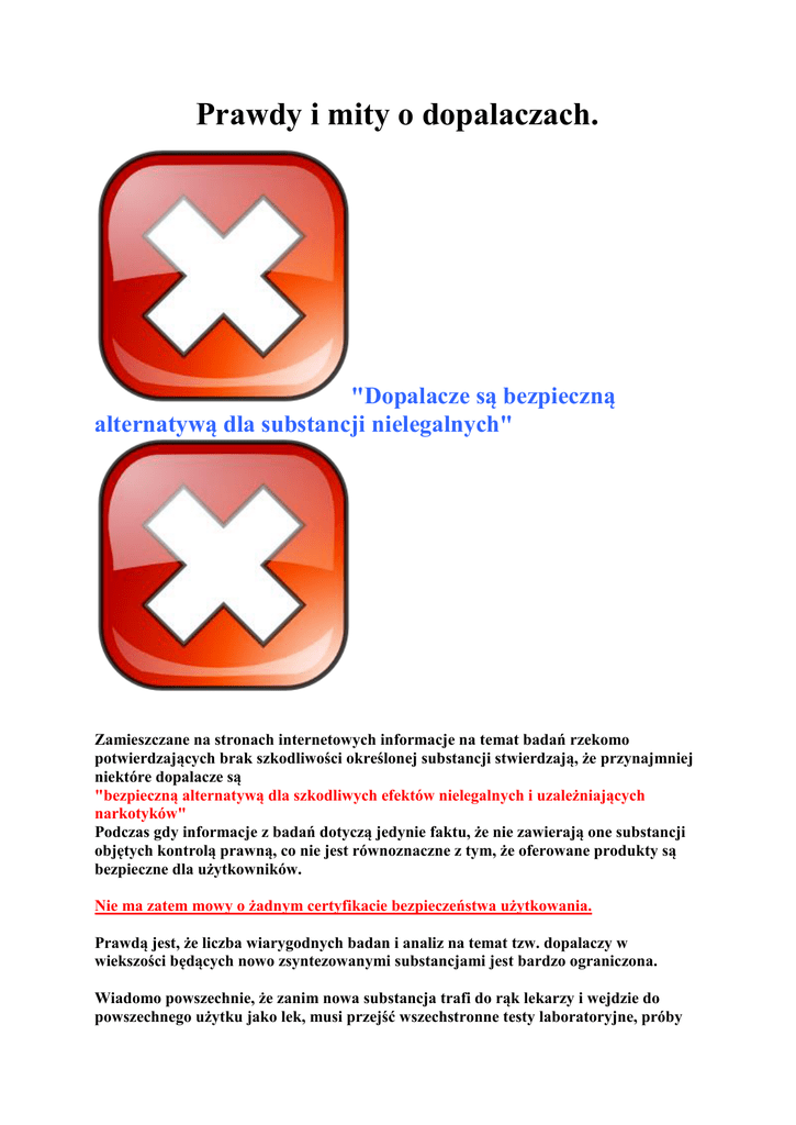 Prawdy i mity o dopalaczach. "Dopalacze są bezpieczną alternatywą dla substancji nielegalnych" Zamieszczane na stronach internetowych informacje na temat badań rzekomo potwierdzających brak szkodliwości określonej substancji stwierdzają, że przynajmniej niektóre dopalacze są "bezpieczną alternatywą dla szkodliwych efektów nielegalnych i uzależniających narkotyków" Podczas gdy informacje z badań dotyczą jedynie faktu, że nie zawierają one substancji objętych kontrolą prawną, co nie jest równoznaczne z tym, że oferowane produkty są bezpieczne dla użytkowników. Nie ma zatem mowy o żadnym certyfikacie bezpieczeństwa użytkowania. Prawdą jest, że liczba wiarygodnych badan i analiz na temat tzw. dopalaczy w wiekszości będących nowo zsyntezowanymi substancjami jest bardzo ograniczona. Wiadomo powszechnie, że zanim nowa substancja trafi do rąk lekarzy i wejdzie do powszechnego użytku jako lek, musi przejść wszechstronne testy laboratoryjne, próby na zwierzętach doświadczalnych i trzy fazy badań z udziałem ludzi - czyli badań klinicznych. Od zsyntezowania biologicznie aktywnego związku do pojawienia się leku na rynku upływa z reguły kilkanaście lat, a koszty badan przedklinicznych i trzech faz klinicznych szacuje się obecnie na kilkaset milionów dolatór. Czy przypuszczasz, ze producenci dopalaczy zadają sobie tyle trudu by stosować tę procedurę? W ostatnim czasie było kilka zgłoszeń, głównie do szpitali psychiatrycznych spowodowanych używaniem dopalaczy. Istnieją także przypuszczenia, że niektóre z nich mogą silnie uzależniać. Producenci dopalaczy, testują swoje wynalazki tylko na ludziach, którym je sprzedają. "Dopalacze są wyrobami kolekcjonerskimi" Na opakowaniu KAŻDEGO dopalacza widnieje napis: "NIE DO SPOŻYCIA PRZEZ LUDZI" W sklepach dopalacze sprzedawane są jako "produkty kolekcjonerskie". Dopalacze zawierają substancje psychoaktywne, które JESZCZE nie są zakwalifikowane jako nielegalne, ale mają zbliżone działanie do narkotyków. To jest tak, jakby ktoś znalazł substancję szkodliwą, która ma działanie zbliżone do tej określonej jako NIELEGALNA i sprzedawał ją jako wyrób kolekcjonerski - NIE DO SPOŻYCIA PRZEZ LUDZI. W ten sposób wszelkie złe aspekty spożycia dopalacza są kwestią osoby spożywającej. "Poza tabletkami imprezowymi, dopalacze to w większości zioła lub ich mieszanki od setek lat wykorzystywane w obrzędach religijnych. Wszystkie są pochodzenia naturalnego. Żadnej chemii" Ostatnie badania przeprowadzone przez ekspertów chemii, między innymi w Austrii, Niemczech, a także w Polsce wykazały, że w składzie niektórych dostępnych na rynku mieszanek ziołowych znajduje się przynajmniej kilka SYNTETYCZNYCH AGONISTÓW RECEPTORÓW KANABINOIDOWYCH takicj jak JWH - 018 czy CP-47 CP-487. Wedle posiadanej obecnie wiedzy żadna z tych syntetycznych substancji nie występuje w naturze. WIĘC CZY RZECZYWIŚCIE WSZYSTKIE MIESZANKI ZIOŁOWE I ZIOŁA NIE ZAWIERAJĄ "ŻADNEJ CHEMII" ?