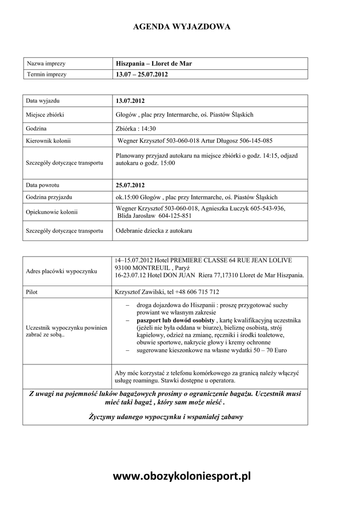 AGENDA WYJAZDOWA Nazwa imprezy Hiszpania – Lloret de Mar Termin imprezy 13.07 – 25.07.2012 Data wyjazdu 13.07.2012 Miejsce zbiórki Głogów , plac przy Intermarche, oś. Piastów Śląskich Godzina Zbiórka : 14:30 Kierownik kolonii Wegner Krzysztof 503-060-018 Artur Długosz 506-145-085 Szczegóły dotyczące transportu Planowany przyjazd autokaru na miejsce zbiórki o godz. 14:15, odjazd autokaru o godz. 15:00 Data powrotu 25.07.2012 Godzina przyjazdu ok.15:00 Głogów , plac przy Intermarche, oś. Piastów Śląskich Opiekunowie kolonii Wegner Krzysztof 503-060-018, Agnieszka Łuczyk 605-543-936, Blida Jarosław 604-125-851 Szczegóły dotyczące transportu Odebranie dziecka z autokaru 14–15.07.2012 Hotel PREMIERE CLASSE 64 RUE JEAN LOLIVE Adres placówki wypoczynku Pilot Uczestnik wypoczynku powinien zabrać ze sobą.. 93100 MONTREUIL , Paryż 16-23.07.12 Hotel DON JUAN Riera 77,17310 Lloret de Mar Hiszpania. Krzysztof Zawilski, tel +48 606 715 712 02.07–09.07.2012 Hotel Dana Palace , Golden Sands 9007, Varna , droga dojazdowa do Hiszpanii : proszę przygotować suchy Bułgaria prowiant we własnym zakresie paszport lub dowód osobisty , kartę kwalifikacyjną uczestnika (jeżeli nie była oddana w biurze), bieliznę osobistą, strój kąpielowy, odzież na zmianę, ręczniki i środki toaletowe, obuwie sportowe, nakrycie głowy i kremy ochronne sugerowane kieszonkowe na własne wydatki 50 – 70 Euro Aby móc korzystać z telefonu komórkowego za granicą należy włączyć usługę roamingu. Stawki dostępne u operatora. Z uwagi na pojemność luków bagażowych prosimy o ograniczenie bagażu. Uczestnik musi mieć taki bagaż , który sam może nieść . Życzymy udanego wypoczynku i wspaniałej zabawy www.obozykoloniesport.pl