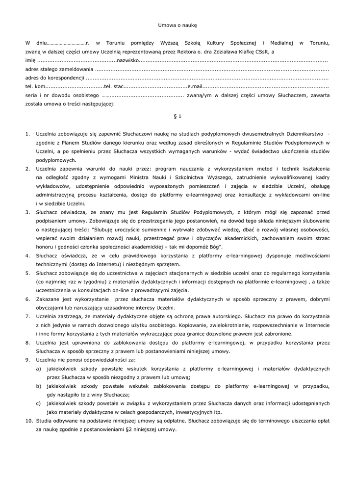 Umowa o naukę W dniu…………………………r. w Toruniu pomiędzy Wyższą Szkołą Kultury Społecznej i Medialnej w Toruniu, zwaną w dalszej części umowy Uczelnią reprezentowaną przez Rektora o. dra Zdziaława Klafkę CSsR, a imię ..............................................nazwisko............................................................................................................. adres stałego zameldowania ....................................................................................................................................... adres do korespondencji ............................................................................................................................................ tel. kom..................................tel. stac.....................................e.mail......................................................................... seria i nr dowodu osobistego ……........................................... zwaną/ym w dalszej części umowy Słuchaczem, zawarta została umowa o treści następującej: §1 1. Uczelnia zobowiązuje się zapewnić Słuchaczowi naukę na studiach podyplomowych dwusemetralnych Dziennikarstwo zgodnie z Planem Studiów danego kierunku oraz według zasad określonych w Regulaminie Studiów Podyplomowych w Uczelni, a po spełnieniu przez Słuchacza wszystkich wymaganych warunków - wydać świadectwo ukończenia studiów podyplomowych. 2. Uczelnia zapewnia warunki do nauki przez: program nauczania z wykorzystaniem metod i technik kształcenia na odległość zgodny z wymogami Ministra Nauki i Szkolnictwa Wyższego, zatrudnienie wykwalifikowanej kadry wykładowców, udostępnienie odpowiednio wyposażonych pomieszczeń i zajęcia w siedzibie Uczelni, obsługę administracyjną procesu kształcenia, dostęp do platformy e-learningowej oraz konsultacje z wykładowcami on-line i w siedzibie Uczelni. 3. Słuchacz oświadcza, że znany mu jest Regulamin Studiów Podyplomowych, z którym mógł się zapoznać przed podpisaniem umowy. Zobowiązuje się do przestrzegania jego postanowień, na dowód tego składa niniejszym ślubowanie o następującej treści: "Ślubuję uroczyście sumiennie i wytrwale zdobywać wiedzę, dbać o rozwój własnej osobowości, wspierać swoim działaniem rozwój nauki, przestrzegać praw i obyczajów akademickich, zachowaniem swoim strzec honoru i godności członka społeczności akademickiej – tak mi dopomóż Bóg”. 4. Słuchacz oświadcza, że w celu prawidłowego korzystania z platformy e-learningowej dysponuje możliwościami technicznymi (dostęp do Internetu) i niezbędnym sprzętem. 5. Słuchacz zobowiązuje się do uczestnictwa w zajęciach stacjonarnych w siedzibie uczelni oraz do regularnego korzystania (co najmniej raz w tygodniu) z materiałów dydaktycznych i informacji dostępnych na platformie e-learningowej , a także uczestniczenia w konsultacjach on-line z prowadzącymi zajęcia. 6. Zakazane jest wykorzystanie przez słuchacza materiałów dydaktycznych w sposób sprzeczny z prawem, dobrymi obyczajami lub naruszający uzasadnione interesy Uczelni. 7. Uczelnia zastrzega, że materiały dydaktyczne objęte są ochroną prawa autorskiego. Słuchacz ma prawo do korzystania z nich jedynie w ramach dozwolonego użytku osobistego. Kopiowanie, zwielokrotnianie, rozpowszechnianie w Internecie i inne formy korzystania z tych materiałów wykraczające poza granice dozwolone prawem jest zabronione. 8. Uczelnia jest uprawniona do zablokowania dostępu do platformy e-learningowej, w przypadku korzystania przez 9. Uczelnia nie ponosi odpowiedzialności za: Słuchacza w sposób sprzeczny z prawem lub postanowieniami niniejszej umowy. a) jakiekolwiek szkody powstałe wskutek korzystania z platformy e-learningowej i materiałów dydaktycznych b) jakiekolwiek przez Słuchacza w sposób niezgodny z prawem lub umową; szkody powstałe wskutek zablokowania dostępu do platformy e-learningowej w przypadku, gdy nastąpiło to z winy Słuchacza; c) jakiekolwiek szkody powstałe w związku z wykorzystaniem przez Słuchacza danych oraz informacji udostępnianych jako materiały dydaktyczne w celach gospodarczych, inwestycyjnych itp. 10. Studia odbywane na podstawie niniejszej umowy są odpłatne. Słuchacz zobowiązuje się do terminowego uiszczania opłat za naukę zgodnie z postanowieniami §2 niniejszej umowy. §2 1. Opłata ze semestr nauki wynosi 1500 zł. 2. Opłata za powtarzanie semestru wynosi 1500 zł ( w przypadku powtarzania 3 i więcej przedmiotów) lub 800 zł ( w przypadku powtarzania dwóch przedmiotów) lub 400 zł ( przypadku powtarzania jednego przedmiotu). 3. Uczelnia nie pobiera opłat za rejestrację na kolejny semestr lub rok studiów, egzaminy, w tym egzamin poprawkowy, egzamin komisyjny, egzamin dyplomowy, wydanie dziennika praktyk zawodowych, złożenie i ocenę pracy dyplomowej. Jedyną opłatą – oprócz czesnego – jest opłata w wysokości 30 zł za wydanie dyplomu. 4. Słuchacze wnoszący semestralne opłaty za studia jednorazowo, w pełnej wysokości, uiszczają je w następujących terminach: za semestr zimowy – do 30 września 2015r. lub w terminie do 3 dni przed rozpoczęciem zajęć, za semestr letni – do 28 lutego 2016r. 5. W drugim semestrze studiów istnieje możliwość wniesienia opłaty w ratach w następujących częściach i terminach: za semestr letni: 6. a) I rata w wysokości 50 proc. – do 28 lutego b) II rata w wysokości 50 proc. – do 15 kwietnia Opłaty wynikające z niniejszej umowy Słuchacz wnosi na konto bankowe Uczelni, podane do jego wiadomości wraz z przyjęciem na studia. 7. Słuchacz zobowiązany jest do okazania dowodu wpłaty na wezwanie upoważnionych pracowników Uczelni. 8. Za datę uiszczenia opłaty uważa się datę wpływu zapłaconej kwoty na konto bankowe Uczelni. 9. W razie zaległości w regulowaniu opłat wg zasad powyżej określonych w §2 Uczelnia może nie dopuścić Słuchacza do składa