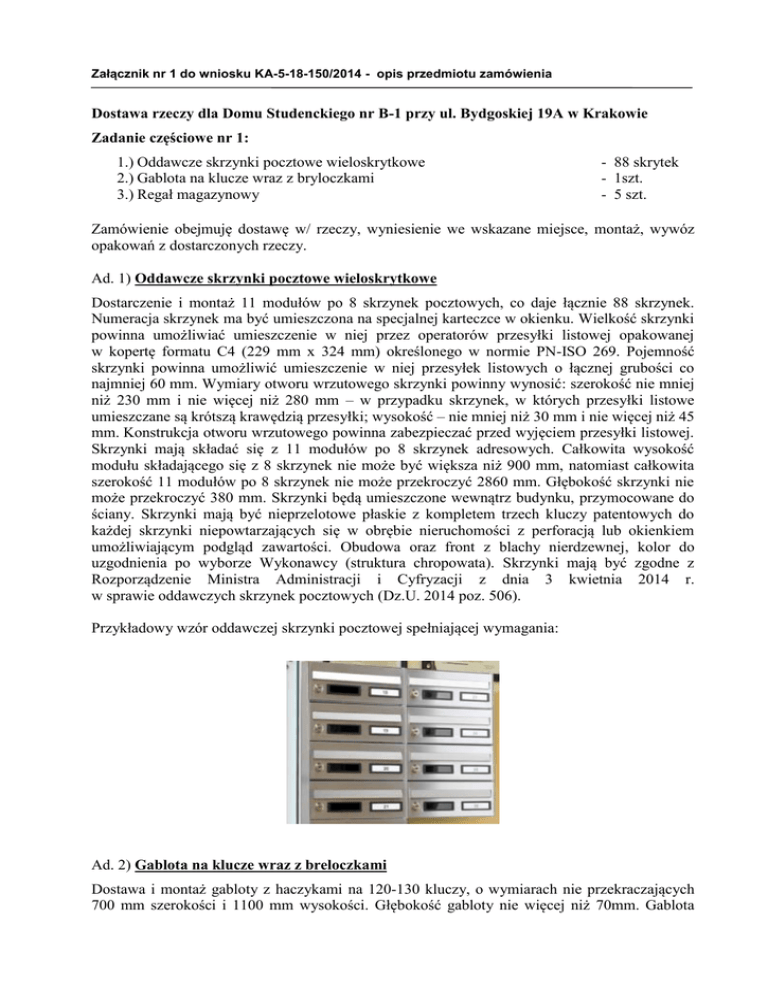 Załącznik nr 1 do wniosku KA-5-18-150/2014 - opis przedmiotu zamówienia Dostawa rzeczy dla Domu Studenckiego nr B-1 przy ul. Bydgoskiej 19A w Krakowie Zadanie częściowe nr 1: 1.) Oddawcze skrzynki pocztowe wieloskrytkowe 2.) Gablota na klucze wraz z bryloczkami 3.) Regał magazynowy - 88 skrytek - 1szt. - 5 szt. Zamówienie obejmuję dostawę w/ rzeczy, wyniesienie we wskazane miejsce, montaż, wywóz opakowań z dostarczonych rzeczy. Ad. 1) Oddawcze skrzynki pocztowe wieloskrytkowe Dostarczenie i montaż 11 modułów po 8 skrzynek pocztowych, co daje łącznie 88 skrzynek. Numeracja skrzynek ma być umieszczona na specjalnej karteczce w okienku. Wielkość skrzynki powinna umożliwiać umieszczenie w niej przez operatorów przesyłki listowej opakowanej w kopertę formatu C4 (229 mm x 324 mm) określonego w normie PN-ISO 269. Pojemność skrzynki powinna umożliwić umieszczenie w niej przesyłek listowych o łącznej grubości co najmniej 60 mm. Wymiary otworu wrzutowego skrzynki powinny wynosić: szerokość nie mniej niż 230 mm i nie więcej niż 280 mm – w przypadku skrzynek, w których przesyłki listowe umieszczane są krótszą krawędzią przesyłki; wysokość – nie mniej niż 30 mm i nie więcej niż 45 mm. Konstrukcja otworu wrzutowego powinna zabezpieczać przed wyjęciem przesyłki listowej. Skrzynki mają składać się z 11 modułów po 8 skrzynek adresowych. Całkowita wysokość modułu składającego się z 8 skrzynek nie może być większa niż 900 mm, natomiast całkowita szerokość 11 modułów po 8 skrzynek nie może przekroczyć 2860 mm. Głębokość skrzynki nie może przekroczyć 380 mm. Skrzynki będą umieszczone wewnątrz budynku, przymocowane do ściany. Skrzynki mają być nieprzelotowe płaskie z kompletem trzech kluczy patentowych do każdej skrzynki niepowtarzających się w obrębie nieruchomości z perforacją lub okienkiem umożliwiającym podgląd zawartości. Obudowa oraz front z blachy nierdzewnej, kolor do uzgodnienia po wyborze Wykonawcy (struktura chropowata). Skrzynki mają być zgodne z Rozporządzenie Ministra Administracji i Cyfryzacji z dnia 3 kwietnia 2014 r. w sprawie oddawczych skrzynek pocztowych (Dz.U. 2014 poz. 506). Przykładowy wzór oddawczej skrzynki pocztowej spełniającej wymagania: Ad. 2) Gablota na klucze wraz z breloczkami Dostawa i montaż gabloty z haczykami na 120-130 kluczy, o wymiarach nie przekraczających 700 mm szerokości i 1100 mm wysokości. Głębokość gabloty nie więcej niż 70mm. Gablota w ramie aluminiowej otwarta, niezamykana. Kolor pleców gabloty odcienie szarości. Plecy gabloty metalowe. Gablota ma być dodatkowo wyposażona w 150 plastikowych breloczków do kluczy, z kółkiem do mocowania, z okienkiem dwustronnym z możliwością wymiany umieszczonych w nich karteczek z numerami. Breloczki w pięciu różnych kolorach, po 30 szt. z każdego koloru. Gablota montowana do ściany. Przykładowy wzór breloczka spełniającego wymagania: Przykładowy wzór gabloty spełniającej wymagania: Ad. 3) Regał magazynowy Dostawa i montaż 5 regałów magazynowych stacjonarnych na pościel o konstrukcji nośnej metalowej ocynkowanej. Półki pełne ze stali nierdzewnej. Całkowita wysokość regału w przedziale 1700-1800mm, szerokość w przedziale: 900-1000mm; głębokość: 500-600mm. Wytrzymałość półki minimum 100kg. Ilość półek: 4. Odstęp między półkami minimum 500mm. Przykładowy wzór regału spełniającego wymagania: Zadanie częściowe nr 2: 1.) Stojak rowerowy 2.) Wózek na brudną pościel - 4 szt. - 2 szt. Zamówienie obejmuję dostawę w/ rzeczy, wyniesienie we wskazane miejsce, montaż, wywóz opakowań z dostarczonych rzeczy. Ad. 1) Stojak na rowery Dostawa i montaż 4 stojaków rowerowych z pięcioma stanowiskami. Przeznaczony do parkowania wszystkich typów i wielkości rowerów, również tych wyposażonych w hamulce tarczowe. Stojak ma mieć możliwość przypięcia roweru za ramę. Montaż wewnątrz budynku do podłoża betonowego. Szerokość stojaka w przedziale: 1500-1800mm, wysokość w przedziale 300-600mm, głębokość w przedziale 400-600mm. Stojak ma posiadać antykorozyjnąocynkowaną powłokę. Materiał: stal ocynkowana. Sposób parkowania jednostronnie. Optymalny rozstaw pozwalający na swobodne zaparkowanie rowerów. Kształt stojaków przedstawiono poniżej na rysunku: Ad. 2) Wózek na brudną pościel Dostawa wózków o konstrukcji metalowej na kółkach gumowych. Wysokość w przedziale 8001300 mm; długość w przedziale 800-1000mm, szerokość w przedziale 500-800 mm. Nośność minimum 100kg. Konstrukcja: rurowa. Burty pełne lub z siatki. Kolor: dowolny. Przykładowy wzór wózka spełniającego wymagania: Ogólne warunki dla Zamówieni dla zadania częściowego 1,2 1. Wykonawca zobowiązuje się do wysokiego standardu wykonywanych prac. 2. Wykonawca zobowiązuje się dostarczyć przedmiot zamówienia kompletny, nieużywany, w oryginalnych opakowaniach producentów, fabrycznie nowy, dopuszczony do stosowania w Polsce, posiadający wszelkie stosowne dokumenty zgodnie z obowiązującymi przepisami i normami. 3. Przed realizacją umowy Wykonawca uzgodni z Zamawiającym kolor dostarczanych rzeczy. 4. Dostawa wraz z montażem w dni robocze od poniedziałku do piątku w godz. 800 – 1400 do Domu Studenckiego Nr B-1 w Krakowie, ul. Bydgoska 19A, po wcześniejszym uzgodnieniu z kierownikiem obiektu, Tel. (12)363-40-01, 502-038-451. 5. Szczegółowy termin dostawy i montażu zostanie ustalony z kierownikiem Domu Studenckiego B-1. 6. Z czynności dostawy i montażu zostanie sporządzony protokół odbioru. Odbioru wykonanych prac dokona kierownik Domów Studenckich B-1. 7. Wykonawca udziela 24 miesięcznej gwarancji. Wszelkie poprawki w okresie gwarancyjnym będą wykonane na koszt Zleceniobiorcy, w ciągu 48 godzin od daty zgłoszenia telefonicznego. 8. Koszt dojazdu i transportu w okresie gwarancji pokrywa Wykonawca. 9. Okres gwarancji liczy się od dat