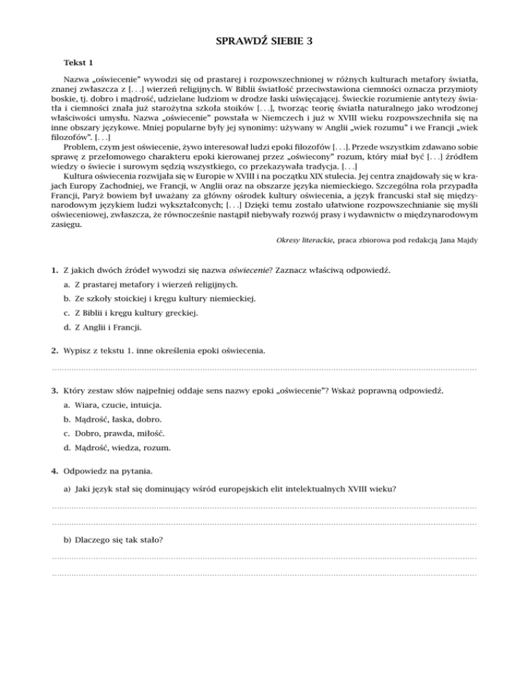 SPRAWDŹ SIEBIE 3 Tekst 1 Nazwa „oświecenie” wywodzi się od prastarej i rozpowszechnionej w różnych kulturach metafory światła, znanej zwłaszcza z [. . .] wierzeń religijnych. W Biblii światłość przeciwstawiona ciemności oznacza przymioty boskie, tj. dobro i mądrość, udzielane ludziom w drodze łaski uświęcającej. Świeckie rozumienie antytezy światła i ciemności znała już starożytna szkoła stoików [. . .], tworząc teorię światła naturalnego jako wrodzonej właściwości umysłu. Nazwa „oświecenie” powstała w Niemczech i już w XVIII wieku rozpowszechniła się na inne obszary językowe. Mniej popularne były jej synonimy: używany w Anglii „wiek rozumu” i we Francji „wiek filozofów”. [. . .] Problem, czym jest oświecenie, żywo interesował ludzi epoki filozofów [. . .]. Przede wszystkim zdawano sobie sprawę z przełomowego charakteru epoki kierowanej przez „oświecony” rozum, który miał być [. . .] źródłem wiedzy o świecie i surowym sędzią wszystkiego, co przekazywała tradycja. [. . .] Kultura oświecenia rozwijała się w Europie w XVIII i na początku XIX stulecia. Jej centra znajdowały się w krajach Europy Zachodniej, we Francji, w Anglii oraz na obszarze języka niemieckiego. Szczególna rola przypadła Francji, Paryż bowiem był uważany za główny ośrodek kultury oświecenia, a język francuski stał się międzynarodowym językiem ludzi wykształconych; [. . .] Dzięki temu zostało ułatwione rozpowszechnianie się myśli oświeceniowej, zwłaszcza, że równocześnie nastąpił niebywały rozwój prasy i wydawnictw o międzynarodowym zasięgu. Okresy literackie, praca zbiorowa pod redakcją Jana Majdy 1. Z jakich dwóch źródeł wywodzi się nazwa oświecenie? Zaznacz właściwą odpowiedź. a. Z prastarej metafory i wierzeń religijnych. b. Ze szkoły stoickiej i kręgu kultury niemieckiej. c. Z Biblii i kręgu kultury greckiej. d. Z Anglii i Francji. 2. Wypisz z tekstu 1. inne określenia epoki oświecenia. ............................................................................................................................... ................................................ 3. Który zestaw słów najpełniej oddaje sens nazwy epoki „oświecenie”? Wskaż poprawną odpowiedź. a. Wiara, czucie, intuicja. b. Mądrość, łaska, dobro. c. Dobro, prawda, miłość. d. Mądrość, wiedza, rozum. 4. Odpowiedz na pytania. a) Jaki język stał się dominujący wśród europejskich elit intelektualnych XVIII wieku? ............................................................................................................................... ................................................ ............................................................................................................................... ................................................ b) Dlaczego się tak stało? ............................................................................................................................... ................................................ ............................................................................................................................... ................................................ 5. Dzięki czemu idee oświeceniowe mogły się łatwo rozprzestrzeniać? Podaj dwie przyczyny. 1. ............................................................................................................................... ............................................ 2. ............................................................................................................................... ............................................ 6. Jaką rolę przypisywano w czasach oświecenia rozumowi? Odpowiedz własnymi słowami. ............................................................................................................................... ................................................ ............................................................................................................................... ................................................ Tekst 2 Zanim [. . .] nazwa „romantyzm” pojawiła się w takiej właśnie formie w latach dwudziestych XIX wieku i zaczęła wyróżniać określoną klasę zjawisk kultury duchowej i materialnej, znana była forma przymiotnikowa: „romantyczny” [. . .]. Nazywano tak [. . .] cechy wywodzące się – zgodnie z etymologią* wyrazu, który pochodzi od słowa: romans – ze średniowiecznej opowieści awanturniczo-miłosnej, nierzadko fantastycznej. [. . .] jako „romantyczną” najwcześniej określano poezję [. . .] przesyconą takimi pierwiastkami romansu rycerskiego, jak: fantastyka, cudowność, niezwykłość postaci i wydarzeń, które apelują do uczucia, wiary i wyobraźni – pozarozumowych władz czytelnika. [. . .] słowo „romantyczny” zaczęło oznaczać pewne właściwości podobne do tych, jakie występowały w romansach, będące cechami ludzkiego usposobienia (człowiek romantycznego pokroju – to znaczyło: idealista, marzyciel, melancholik, ktoś przesadnie uczuciowy) lub jeszcze powszechniej stosowano ten przymiotnik w odniesieniu do krajobrazu, dotyczyło to zarówno scenerii naturalnej, jak i pejzażu malarskiego; i tu znaczyło określenie „romantyczny” tyleż, co: „malowniczy”, nastrojowy, budzący silne emocje, pokrewny opisom spotykanym w literaturze uznawanej za romansową. Okresy literackie, praca zbiorowa pod redakcją Jana Majdy etymologia – pochodzenie słowa 1. Tekst 2. przede wszystkim: a. opisuje cechy człowieka romantycznego. b. przedstawia główne idee epoki romantyzmu. c. wyjaśnia pochodzenie nazwy epoki: romantyzm. d. ukazuje najważniejsze osiągnięcia kultury epoki romantyzmu. 2. Zaznacz schemat, który przedstawia właściwą kolejność powstawania wyrazów. a. romans → romantyczny → romantyzm b. romantyczny → romans →