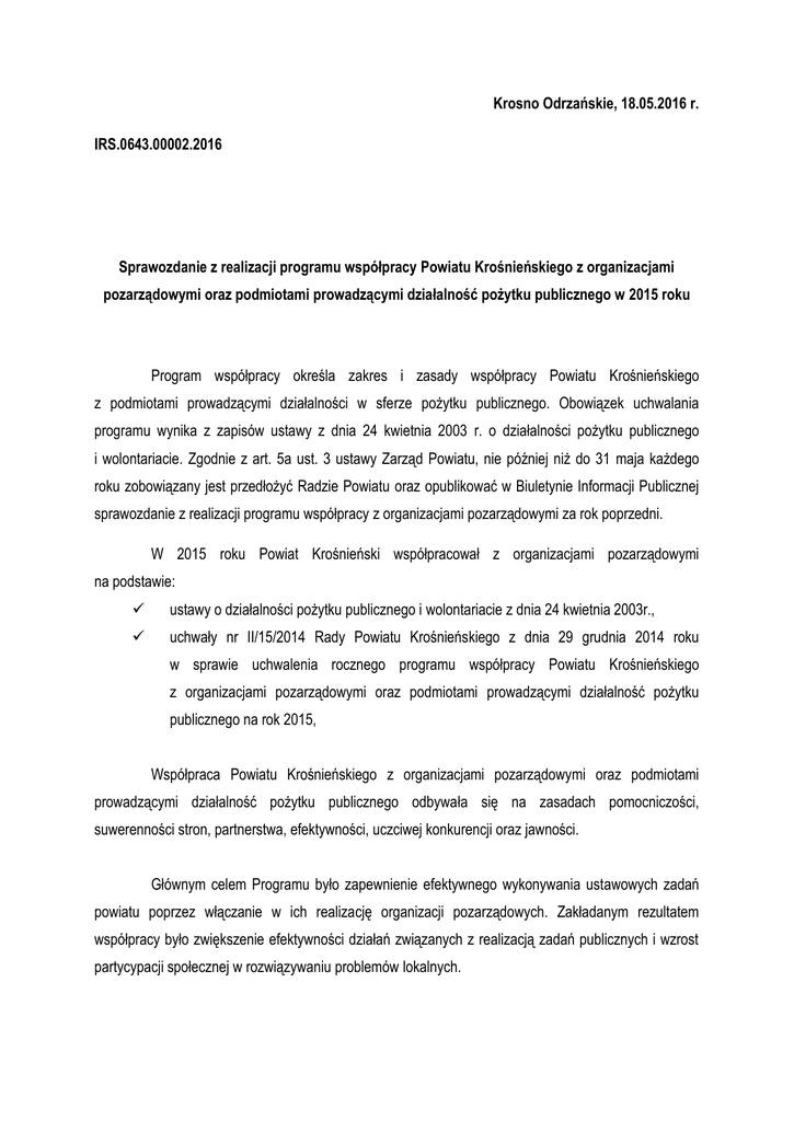 Krosno Odrzańskie, 18.05.2016 r. IRS.0643.00002.2016 Sprawozdanie z realizacji programu współpracy Powiatu Krośnieńskiego z organizacjami pozarządowymi oraz podmiotami prowadzącymi działalność pożytku publicznego w 2015 roku Program współpracy określa zakres i zasady współpracy Powiatu Krośnieńskiego z podmiotami prowadzącymi działalności w sferze pożytku publicznego. Obowiązek uchwalania programu wynika z zapisów ustawy z dnia 24 kwietnia 2003 r. o działalności pożytku publicznego i wolontariacie. Zgodnie z art. 5a ust. 3 ustawy Zarząd Powiatu, nie później niż do 31 maja każdego roku zobowiązany jest przedłożyć Radzie Powiatu oraz opublikować w Biuletynie Informacji Publicznej sprawozdanie z realizacji programu współpracy z organizacjami pozarządowymi za rok poprzedni. W 2015 roku Powiat Krośnieński współpracował z organizacjami pozarządowymi na podstawie: ustawy o działalności pożytku publicznego i wolontariacie z dnia 24 kwietnia 2003r., uchwały nr II/15/2014 Rady Powiatu Krośnieńskiego z dnia 29 grudnia 2014 roku w sprawie uchwalenia rocznego programu współpracy Powiatu Krośnieńskiego z organizacjami pozarządowymi oraz podmiotami prowadzącymi działalność pożytku publicznego na rok 2015, Współpraca Powiatu Krośnieńskiego z organizacjami pozarządowymi oraz podmiotami prowadzącymi działalność pożytku publicznego odbywała się na zasadach pomocniczości, suwerenności stron, partnerstwa, efektywności, uczciwej konkurencji oraz jawności. Głównym celem Programu było zapewnienie efektywnego wykonywania ustawowych zadań powiatu poprzez włączanie w ich realizację organizacji pozarządowych. Zakładanym rezultatem współpracy było zwiększenie efektywności działań związanych z realizacją zadań publicznych i wzrost partycypacji społecznej w rozwiązywaniu problemów lokalnych. Cel ten osiągnięto poprzez: stworzenie warunków do pogłębiania aktywizacji społeczeństwa, w szczególności poprzez popularyzację zróżnicowanych form działalności organizacji pozarządowych, utrwalanie społecznego poczucia odpowiedzialności za wspólnotę lokalną oraz jej tradycje; zachęcanie mieszkańców powiatu krośnieńskiego do udziału w rozwiązywaniu problemów lokalnych; działania nad poprawą jakości życia poprzez pełniejsze zaspokojenie potrzeb społeczności lokalnych. Program współpracy realizowano w formie: powierzania i wspierania zadań publicznych, wzajemnego informowania się o planowanych kierunkach działalności i współdziałanie w celu harmonizacji tych kierunków, promocję organizacji pozarządowych w zakresie wykonywanych przez nie zadań poprzez informowanie o działalności na stronie internetowej powiatu, umożliwienie dostępu do sal konferencyjnych oraz wyposażenia niezbędnego do przeprowadzenia spotkań organizacji realizujących zadania na rzecz powiatu, udzielania pomocy organizacjom w pozyskiwaniu środków zewnętrznych poprzez organizację szkoleń i pomoc merytoryczną. Powierzanie i wspieranie zadań publicznych. W ramach otwartego konkursu ofert ogłoszonego na podstawie uchwały nr 32/2015 Zarządu Powiatu Krośnieńskiego z dnia 27 stycznia 2015 roku w sprawie ogłoszenia konkursu ofert na realizację zadań publicznych, z zakresu pomocy społecznej, kultury, ochrony zabytków i opieki nad zabytkami, kultury fizycznej i sportu, turystyki, porządku i bezpieczeństwa publicznego, ochrony zdrowia, promocji powiatu wpłynęło 29 ofert na wsparcie realizacji zadań publicznych. Komisja konkursowa powołana przez Zarząd w skład, której weszli trzej przedstawiciele Zarządu Powiatu Krośnieńskiego oraz dwaj przedstawiciele organizacji pozarządowych, zgłoszonych w odpowiedzi na ogłoszenie Zarządu Powiatu Krośnieńskiego o zgłaszaniu kandydatur na członków komisji konkursowej opiniującej wnioski w ramach ogłoszonego otwartego konkursu ofert na realizację zadań publicznych, zaopiniowała, a następnie zarekomendowała Zarządowi Powiatu Krośnieńskiego wsparcie 23 ofert realizacji zadań publicznych. Zarząd Powiatu Krośnieńskiego uchwałą nr 42/2015 z dnia 12 marca 2015 r. w sprawie wyboru ofert i przyznania dotacji na realizacji zadań publicznych w zakresie kultury fizycznej i sportu, pomocy społecznej, turystyki, ochrony zdrowia, kultury, ochrony zabytków i opieki nad zabytkami, porządku i bezpieczeństwa publicznego oraz promocji powiatu udzielił dotacji z budżetu Powiatu Krośnieńskiego w wysokości 35.500,00 zł na wsparcie realizacji zadań publicznych: Lp. 1. 2. 3. 4. 5. 6. 7. 8. 9. 10. 11. 12. 13. 14. 15. Nazwa oferenta Nazwa zadania publicznego Międzyszkolny Ludowy Klub Sportowy VOLLEY w Gubinie Gubińskie Międzyszkolne Towarzystwo Sportowe SPARTA w Gubinie. Stowarzyszenie „Młode Krosno” Krośnieńskie Stowarzyszenie Gier Umysłowych „Tęcza” w Krośnie Odrzańskim Uczniowski Klub Sportowy „ENERGETYK” w Dychowie Towarzystwo Miłośników Ziemi Krośnieńskiej w Krośnie Odrzańskim Klub Sportowy LKS „Płomień” Chlebowo Stowarzyszenie Pomocy Osobom Autystycznym „Dom nad Lubszą”. Stowarzyszenie „Wzgórze nadziei” w Krośnie Odrzańskim Organizacja i przeprowadzenie zajęć treningowych w siatkówkę dzieci i młodzieży. Finał Mistrzostw Polski Dziewcząt, roczników 2002/03 – Koszalin, Mielno KO Streetball Summer Cup 2015 – X lecie. 4 Mistrzostwa powiatu krośnieńskiego w szachach szybkich P-15. Krośnieńska Liga Szachowa. Wiosenno – Jesienne Otwarte Mistrzostwa Powiatu w biegach na orientację. XV Turniej Strzelecki. Uczestnictwo zespołu Orlików w rozgrywkach ligowych. Podokręg Krosno Odrz. Integracja ze środowiskiem lokalnym oraz współpraca między organizacjami Uważaj mnie za dobrego, a stanę się lepszy – program zajęć socjoterapeutycznych dla młodzieży zagrożonej niedostosowaniem społecznym – uczniów Zespołu Szkół Specjalnych w Krośnie Odrzańskim Stowarzyszenie „Przysta