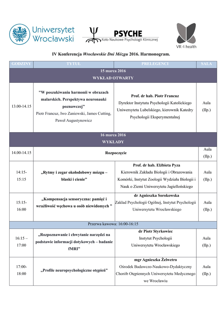 IV Konferencja Wrocławskie Dni Mózgu 2016. Harmonogram.