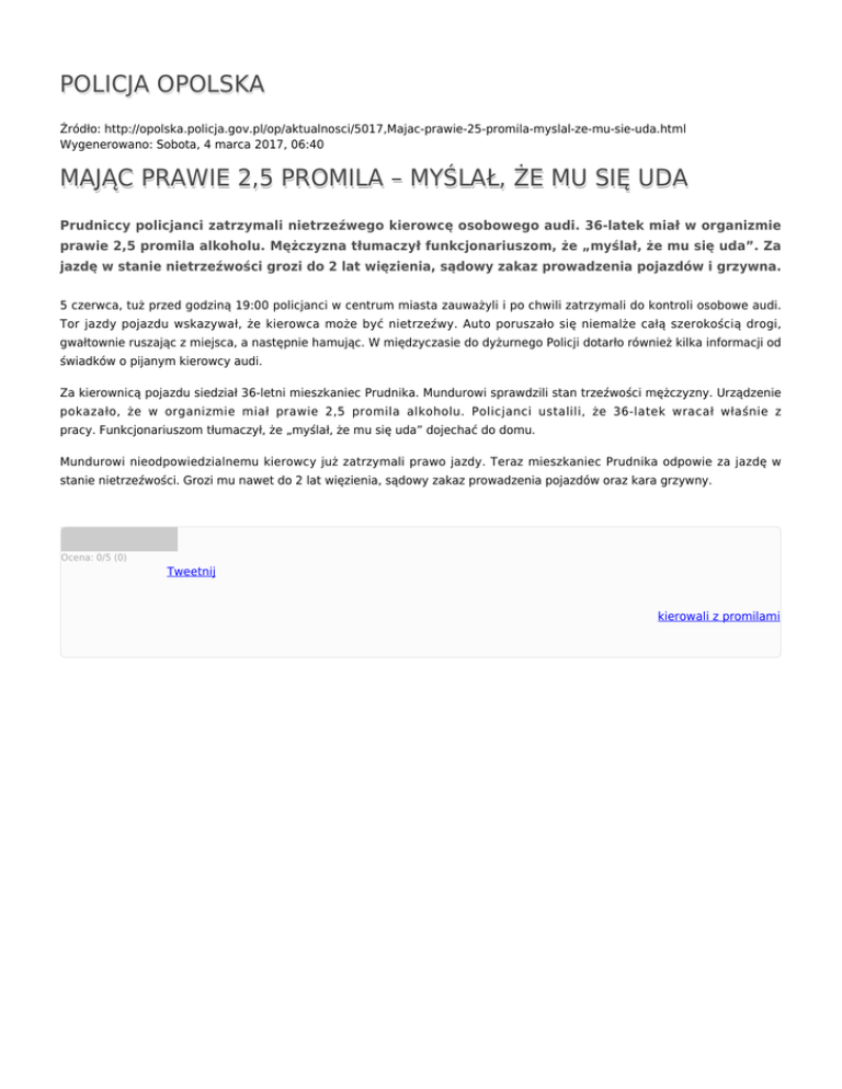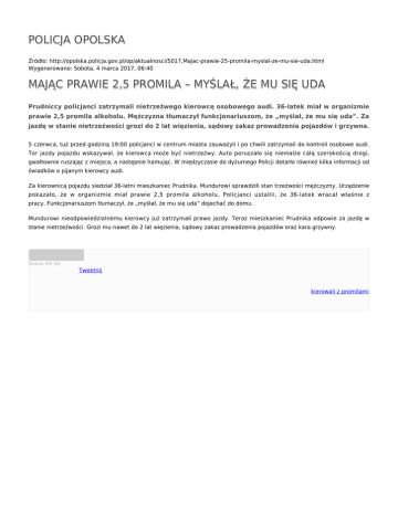 POLICJA OPOLSKA Źródło: http://opolska.policja.gov.pl/op/aktualnosci/5017,Majac-prawie-25-promila-myslal-ze-mu-sie-uda.html Wygenerowano: Sobota, 4 marca 2017, 06:40 MAJĄC PRAWIE 2,5 PROMILA – MYŚLAŁ, ŻE MU SIĘ UDA Prudniccy policjanci zatrzymali nietrzeźwego kierowcę osobowego audi. 36-latek miał w organizmie prawie 2,5 promila alkoholu. Mężczyzna tłumaczył funkcjonariuszom, że „myślał, że mu się uda”. Za jazdę w stanie nietrzeźwości grozi do 2 lat więzienia, sądowy zakaz prowadzenia pojazdów i grzywna. 5 czerwca, tuż przed godziną 19:00 policjanci w centrum miasta zauważyli i po chwili zatrzymali do kontroli osobowe audi. Tor jazdy pojazdu wskazywał, że kierowca może być nietrzeźwy. Auto poruszało się niemalże całą szerokością drogi, gwałtownie ruszając z miejsca, a następnie hamując. W międzyczasie do dyżurnego Policji dotarło również kilka informacji od świadków o pijanym kierowcy audi. Za kierownicą pojazdu siedział 36-letni mieszkaniec Prudnika. Mundurowi sprawdzili stan trzeźwości mężczyzny. Urządzenie pokazało, że w organizmie miał prawie 2,5 promila alkoholu. Policjanci ustalili, że 36-latek wracał właśnie z pracy. Funkcjonariuszom tłumaczył, że „myślał, że mu się uda” dojechać do domu. Mundurowi nieodpowiedzialnemu kierowcy już zatrzymali prawo jazdy. Teraz mieszkaniec Prudnika odpowie za jazdę w stanie nietrzeźwości. Grozi mu nawet do 2 lat więzienia, sądowy zakaz prowadzenia pojazdów oraz kara grzywny. Ocena: 0/5 (0) Tweetnij kierowali z promilami