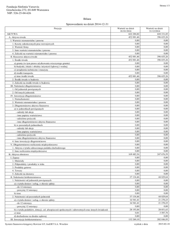 Strona 1/3 Fundacja Sinfonia Varsovia Grochowska 272, 03-849 Warszawa NIP: 526-25-04-626 Bilans Sprawozdanie na dzień 2014-12-31 Pozycja AKTYWA A. Aktywa trwałe I. Wartości niematerialne i prawne 1. Koszty zakończonych prac rozwojowych 2. Wartość firmy 3. Inne wartości niematerialne i prawne 4. Zaliczki na wartości niematerialne i prawne II. Rzeczowe aktywa trwałe 1. Środki trwałe a) grunty (w tym prawo użytkowania wieczystego gruntu) b) budynki, lokale i obiekty inżynierii lądowej i wodnej c) urządzenia techniczne i maszyny d) środki transportu e) inne środki trwałe 2. Środki trwałe w budowie 3. Zaliczki na środki trwałe w budowie III. Należności długoterminowe 1. Od jednostek powiązanych 2. Od innych jednostek IV. Inwestycje długoterminowe 1. Nieruchomości 2. Wartości niematerialne i prawne 3. Długoterminowe aktywa finansowe a) w jednostkach powiązanych - udziały lub akcje - inne papiery wartościowe - udzielone pożyczki - inne długoterminowe aktywa finansowe b) w pozostałych jednostkach - udziały lub akcje - inne papiery wartościowe - udzielone pożyczki - inne długoterminowe aktywa finansowe 4. Inne inwestycje długoterminowe V. Długoterminowe rozliczenia międzyokresowe 1. Aktywa z tytułu odroczonego podatku dochodowego 2. Inne rozliczenia międzyokresowe B. Aktywa obrotowe I. Zapasy 1. Materiały 2. Półprodukty i produkty w toku 3. Produkty gotowe 4. Towary 5. Zaliczki na dostawy II. Należności krótkoterminowe 1. Należności od jednostek powiązanych a) z tytułu dostaw i usług, o okresie spłaty: - do 12 miesięcy - powyżej 12 miesięcy b) inne 2. Należności od pozostałych jednostek a) z tytułu dostaw i usług, o okresie spłaty: - do 12 miesięcy - powyżej 12 miesięcy b) z tytułu podatków, dotacji, ceł, ubezpieczeń społecznych i zdrowotnych oraz innych świadczeń c) inne d) dochodzone na drodze sądowej III. Inwestycje krótkoterminowe System finansowo-księgowy Rewizor GT, InsERT S.A. Wrocław Wartość na dzień 01/01/2014 622 204,02 452 801,46 0,00 0,00 0,00 0,00 0,00 452 801,46 452 801,46 0,00 0,00 0,00 0,00 452 801,46 0,00 0,00 0,00 0,00 0,00 0,00 0,00 0,00 0,00 0,00 0,00 0,00 0,00 0,00 0,00 0,00 0,00 0,00 0,00 0,00 0,00 0,00 0,00 169 402,56 0,00 0,00 0,00 0,00 0,00 0,00 37 134,46 0,00 0,00 0,00 0,00 0,00 37 134,46 16 941,41 16 941,41 0,00 20 193,04 0,01 0,00 132 268,10 Wartość na dzień 31/12/2014 644 331,85 396 655,26 0,00 0,00 0,00 0,00 0,00 396 655,26 396 655,26 0,00 0,00 0,00 0,00 396 655,26 0,00 0,00 0,00 0,00 0,00 0,00 0,00 0,00 0,00 0,00 0,00 0,00 0,00 0,00 0,00 0,00 0,00 0,00 0,00 0,00 0,00 0,00 0,00 247 676,59 0,00 0,00 0,00 0,00 0,00 0,00 44 829,64 0,00 0,00 0,00 0,00 0,00 44 829,64 21 270,25 21 270,25 0,00 20 051,63 3 507,76 0,00 202 846,95 wydruk z dnia 2015-02-18 Strona 2/3 Sprawozdanie na dzień 2014-12-31 Pozycja 1. Krótkoterminowe aktywa finansowe a) w jednostkach powiązanych - udziały lub akcje - inne papiery wartościowe - udzielone pożyczki - inne krótkoterminowe aktywa finansowe b) w pozostałych jednostkach - udziały lub akcje - inne papiery wartościowe - udzielone pożyczki - inne krótkoterminowe aktywa finansowe c) środki pieniężne i inne aktywa pieniężne - środki pieniężne w kasie i na rachunkach - inne środki pieniężne - inne aktywa pieniężne 2. Inne inwestycje krótkoterminowe IV. Krótkoterminowe rozliczenia międzyokresowe PASYWA A. Kapitał (fundusz) własny I. Kapitał (fundusz) podstawowy II. Należne wpłaty na kapitał podstawowy (wielkość ujemna) III. Udziały (akcje) własne (wielkość ujemna) IV. Kapitał (fundusz) zapasowy V. Kapitał (fundusz) z aktualizacji wyceny VI. Pozostałe kapitały (fundusze) rezerwowe VII. Zysk (strata) z lat ubiegłych VIII. Zysk (strata) netto IX. Odpisy z zysku netto w ciągu roku obrotowego (wielkość ujemna) B. Zobowiązania i rezerwy na zobowiązania I. Rezerwy na zobowiązania 1. Rezerwa z tytułu odroczonego podatku dochodowego 2. Rezerwa na świadczenia emerytalne i podobne - długoterminowa - krótkoterminowa 3. Pozostałe rezerwy - długoterminowe - krótkoterminowe II. Zobowiązania długoterminowe 1. Wobec jednostek powiązanych 2. Wobec pozostałych jednostek a) kredyty i pożyczki b) z tytułu emisji dłużnych papierów wartościowych c) inne zobowiązania finansowe d) inne III. Zobowiązania krótkoterminowe 1. Wobec jednostek powiązanych a) z tytułu dostaw i usług, o okresie wymagalności: - do 12 miesięcy - powyżej 12 miesięcy b) inne 2. Wobec pozostałych jednostek a) kredyty i pożyczki b) z tytułu emisji dłużnych papierów wartościowych c) inne zobowiązania finansowe d) z tytułu dostaw i usług, o okresie wymagalności: - do 12 miesięcy - powyżej 12 miesięcy e) zaliczki otrzymane na dostawy f) zobowiązania wekslowe g) z tytułu podatków, ceł, ubezpieczeń i innych świadczeń h) z tytułu wynagrodzeń i) inne System finansowo-księgowy Rewizor GT, InsERT S.A. Wrocław Wartość na dzień 01/01/2014 132 268,10 0,00 0,00 0,00 0,00 0,00 0,00 0,00 0,00 0,00 0,00 132 268,10 132 268,10 0,00 0,00 0,00 0,00 622 204,02 585 803,87 2 000,00 0,00 0,00 564 394,19 0,00 0,00 -22 483,60 41 893,28 0,00 36 400,15 0,00 0,00 0,00 0,00 0,00 0,00 0,00 0,00 0,00 0,00 0,00 0,00 0,00 0,00 0,00 36 400,15 0,00 0,00 0,00 0,00 0,00 36 400,15 0,00 0,00 0,00 20 024,17 20 024,17 0,00 0,00 0,00 714,13 0,00 15 661,85 Wartość na dzień 31/12/2014 202 846,95 0,00 0,00 0,00 0,00 0,00 0,00 0,00 0,00 0,00 0,00 202 846,95 197 736,95 5 110,00 0,00 0,00 0,00 644 331,85 637 302,18 2 000,00 0,00 0,00 541 910,59 0,00 0,00 41 893,28 51 498,31 0,00 7 029,67 0,00 0,00 0,00 0,00 0,00 0,00 0,00 0,00 0,00 0,00 0,00 0,00 0,00 0,00 0,00 7 029,67 0,00 0,00 0,00 0,00 0,00 7 029,67 0,00 0,00 0,00 6 459,67 6 459,67 0,00 0,00 0,00 570,00 0,00 0,00 wydruk z dnia 2015-02-18 Strona 3/3 Sprawozdanie na dzień 2014-12-31 Pozycja 3. Fundusze specjalne IV. Rozliczenia międzyokresowe 1. Ujemna wartość firmy 2. Inne rozliczenia międzyokresowe - d
