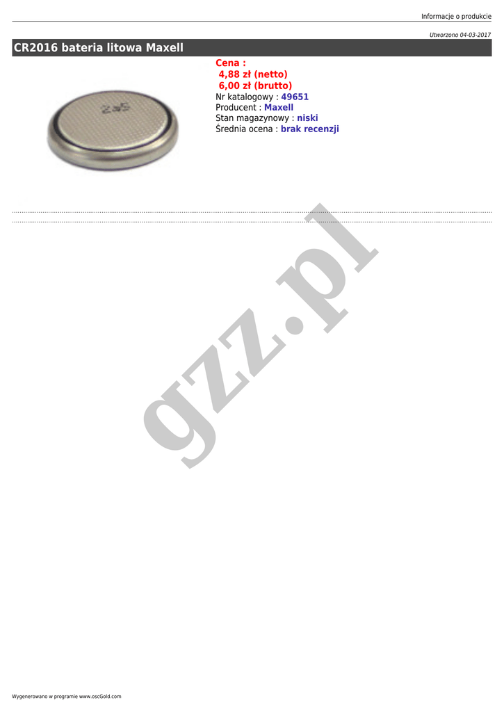 Informacje o produkcie Utworzono 04-03-2017 CR2016 bateria litowa Maxell Cena : 4,88 zł (netto) 6,00 zł (brutto) gz z .p l Nr katalogowy : 49651 Producent : Maxell Stan magazynowy : niski Średnia ocena : brak recenzji Wygenerowano w programie www.oscGold.com