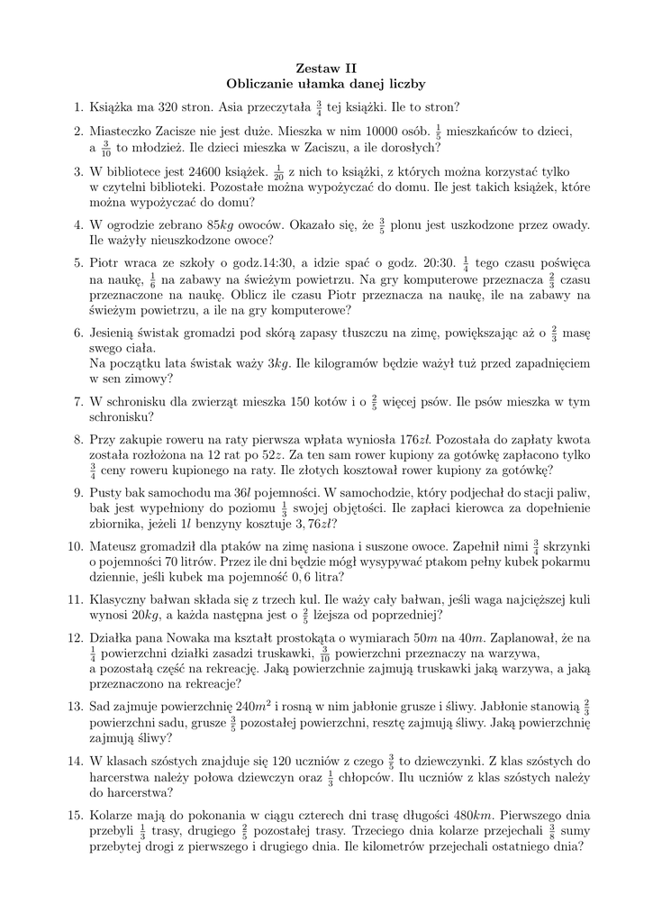 Zestaw II Obliczanie ułamka danej liczby 1. Książka ma 320 stron. Asia przeczytała 3 4 tej książki. Ile to stron? 2. Miasteczko Zacisze nie jest duże. Mieszka w nim 10000 osób. 51 mieszkańców to dzieci, 3 a 10 to młodzież. Ile dzieci mieszka w Zaciszu, a ile dorosłych? 1 3. W bibliotece jest 24600 książek. 20 z nich to książki, z których można korzystać tylko w czytelni biblioteki. Pozostałe można wypożyczać do domu. Ile jest takich książek, które można wypożyczać do domu? 4. W ogrodzie zebrano 85kg owoców. Okazało się, że Ile ważyły nieuszkodzone owoce? 3 5 plonu jest uszkodzone przez owady. 5. Piotr wraca ze szkoły o godz.14:30, a idzie spać o godz. 20:30. 14 tego czasu poświęca na naukę, 16 na zabawy na świeżym powietrzu. Na gry komputerowe przeznacza 23 czasu przeznaczone na naukę. Oblicz ile czasu Piotr przeznacza na naukę, ile na zabawy na świeżym powietrzu, a ile na gry komputerowe? 6. Jesienią świstak gromadzi pod skórą zapasy tłuszczu na zimę, powiększając aż o 23 masę swego ciała. Na początku lata świstak waży 3kg. Ile kilogramów będzie ważył tuż przed zapadnięciem w sen zimowy? 7. W schronisku dla zwierząt mieszka 150 kotów i o schronisku? 2 5 więcej psów. Ile psów mieszka w tym 8. Przy zakupie roweru na raty pierwsza wpłata wyniosła 176zł. Pozostała do zapłaty kwota została rozłożona na 12 rat po 52z. Za ten sam rower kupiony za gotówkę zapłacono tylko 3 ceny roweru kupionego na raty. Ile złotych kosztował rower kupiony za gotówkę? 4 9. Pusty bak samochodu ma 36l pojemności. W samochodzie, który podjechał do stacji paliw, bak jest wypełniony do poziomu 31 swojej objętości. Ile zapłaci kierowca za dopełnienie zbiornika, jeżeli 1l benzyny kosztuje 3, 76zł ? 10. Mateusz gromadził dla ptaków na zimę nasiona i suszone owoce. Zapełnił nimi 34 skrzynki o pojemności 70 litrów. Przez ile dni będzie mógł wysypywać ptakom pełny kubek pokarmu dziennie, jeśli kubek ma pojemność 0, 6 litra? 11. Klasyczny bałwan składa się z trzech kul. Ile waży cały bałwan, jeśli waga najcięższej kuli wynosi 20kg, a każda następna jest o 52 lżejsza od poprzedniej? 12. Działka pana Nowaka ma kształt prostokąta o wymiarach 50m na 40m. Zaplanował, że na 1 3 powierzchni działki zasadzi truskawki, 10 powierzchni przeznaczy na warzywa, 4 a pozostałą część na rekreację. Jaką powierzchnie zajmują truskawki jaką warzywa, a jaką przeznaczono na rekreacje? 13. Sad zajmuje powierzchnię 240m2 i rosną w nim jabłonie grusze i śliwy. Jabłonie stanowią 23 powierzchni sadu, grusze 53 pozostałej powierzchni, resztę zajmują śliwy. Jaką powierzchnię zajmują śliwy? 14. W klasach szóstych znajduje się 120 uczniów z czego 35 to dziewczynki. Z klas szóstych do harcerstwa należy połowa dziewczyn oraz 13 chłopców. Ilu uczniów z klas szóstych należy do harcerstwa? 15. Kolarze mają do pokonania w ciągu czterech dni trasę długości 480km. Pierwszego dnia przebyli 13 trasy, drugiego 25 pozostałej trasy. Trzeciego dnia kolarze przejechali 83 sumy przebytej drogi z pierwszego i drugiego dnia. Ile kilometrów przejechali ostatniego dnia?
