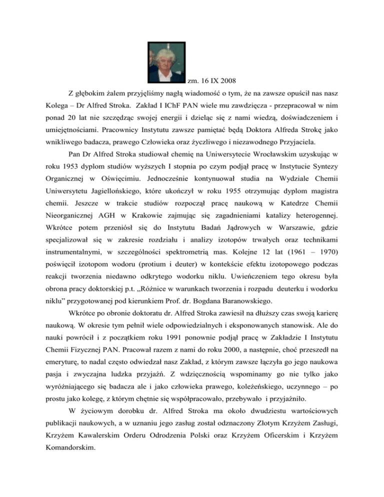 zm. 16 IX 2008 Z głębokim żalem przyjęliśmy nagłą wiadomość o tym, że na zawsze opuścił nas nasz Kolega – Dr Alfred Stroka. Zakład I IChF PAN wiele mu zawdzięcza - przepracował w nim ponad 20 lat nie szczędząc swojej energii i dzieląc się z nami wiedzą, doświadczeniem i umiejętnościami. Pracownicy Instytutu zawsze pamiętać będą Doktora Alfreda Strokę jako wnikliwego badacza, prawego Człowieka oraz życzliwego i niezawodnego Przyjaciela. Pan Dr Alfred Stroka studiował chemię na Uniwersytecie Wrocławskim uzyskując w roku 1953 dyplom studiów wyższych I stopnia po czym podjął pracę w Instytucie Syntezy Organicznej w Oświęcimiu. Jednocześnie kontynuował studia na Wydziale Chemii Uniwersytetu Jagiellońskiego, które ukończył w roku 1955 otrzymując dyplom magistra chemii. Jeszcze w trakcie studiów rozpoczął pracę naukową w Katedrze Chemii Nieorganicznej AGH w Krakowie zajmując się zagadnieniami katalizy heterogennej. Wkrótce potem przeniósł się do Instytutu Badań Jądrowych w Warszawie, gdzie specjalizował się w zakresie rozdziału i analizy izotopów trwałych oraz technikami instrumentalnymi, w szczególności spektrometrią mas. Kolejne 12 lat (1961 – 1970) poświęcił izotopom wodoru (protium i deuter) w kontekście efektu izotopowego podczas reakcji tworzenia niedawno odkrytego wodorku niklu. Uwieńczeniem tego okresu była obrona pracy doktorskiej p.t. „Różnice w warunkach tworzenia i rozpadu deuterku i wodorku niklu” przygotowanej pod kierunkiem Prof. dr. Bogdana Baranowskiego. Wkrótce po obronie doktoratu dr. Alfred Stroka zawiesił na dłuższy czas swoją karierę naukową. W okresie tym pełnił wiele odpowiedzialnych i eksponowanych stanowisk. Ale do nauki powrócił i z początkiem roku 1991 ponownie podjął pracę w Zakładzie I Instytutu Chemii Fizycznej PAN. Pracował razem z nami do roku 2000, a następnie, choć przeszedł na emeryturę, to nadal często odwiedzał nasz Zakład, z którym zawsze łączyła go jego naukowa pasja i zwyczajna ludzka przyjaźń. Z wdzięcznością wspominamy go nie tylko jako wyróżniającego się badacza ale i jako człowieka prawego, koleżeńskiego, uczynnego – po prostu jako kolegę, z którym chętnie się współpracowało, przebywało i przyjaźniło. W życiowym dorobku dr. Alfred Stroka ma około dwudziestu wartościowych publikacji naukowych, a w uznaniu jego zasług został odznaczony Złotym Krzyżem Zasługi, Krzyżem Kawalerskim Orderu Odrodzenia Polski oraz Krzyżem Oficerskim i Krzyżem Komandorskim. Rodzinie i przyjaciołom Doktora Alfreda Stroki składamy wyrazy głębokiego współczucia. Koledzy i współpracownicy z Zakładu I IChF PAN w Zakładzie, czerwiec 1998 odejście na emeryturę, 2000
