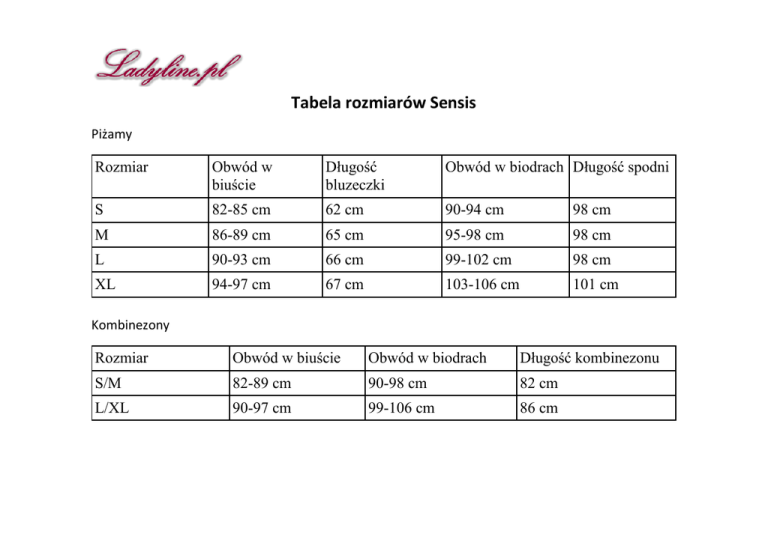 Tabela rozmiarów Sensis Piżamy Rozmiar Obwód w biuście Długość bluzeczki Obwód w biodrach Długość spodni S 82-85 cm 62 cm 90-94 cm 98 cm M 86-89 cm 65 cm 95-98 cm 98 cm L 90-93 cm 66 cm 99-102 cm 98 cm XL 94-97 cm 67 cm 103-106 cm 101 cm Kombinezony Rozmiar Obwód w biuście Obwód w biodrach Długość kombinezonu S/M 82-89 cm 90-98 cm 82 cm L/XL 90-97 cm 99-106 cm 86 cm