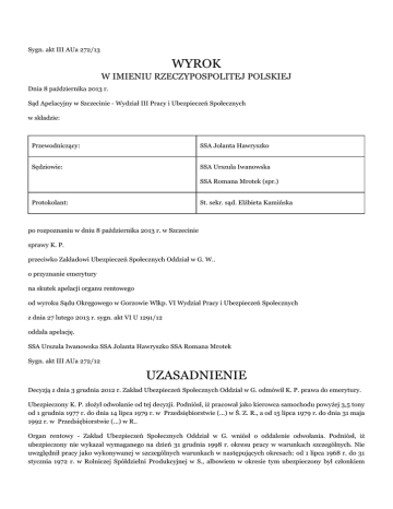 Sygn. akt III AUa 272/13 WYROK W IMIENIU RZECZYPOSPOLITEJ POLSKIEJ Dnia 8 października 2013 r. Sąd Apelacyjny w Szczecinie - Wydział III Pracy i Ubezpieczeń Społecznych w składzie: Przewodniczący: SSA Jolanta Hawryszko Sędziowie: SSA Urszula Iwanowska SSA Romana Mrotek (spr.) Protokolant: St. sekr. sąd. Elżbieta Kamińska po rozpoznaniu w dniu 8 października 2013 r. w Szczecinie sprawy K. P. przeciwko Zakładowi Ubezpieczeń Społecznych Oddział w G. W.. o przyznanie emerytury na skutek apelacji organu rentowego od wyroku Sądu Okręgowego w Gorzowie Wlkp. VI Wydział Pracy i Ubezpieczeń Społecznych z dnia 27 lutego 2013 r. sygn. akt VI U 1291/12 oddala apelację. SSA Urszula Iwanowska SSA Jolanta Hawryszko SSA Romana Mrotek Sygn. akt III AUa 272/12 UZASADNIENIE Decyzją z dnia 3 grudnia 2012 r. Zakład Ubezpieczeń Społecznych Oddział w G. odmówił K. P. prawa do emerytury. Ubezpieczony K. P. złożył odwołanie od tej decyzji. Podniósł, iż pracował jako kierowca samochodu powyżej 3,5 tony od 1 grudnia 1977 r. do dnia 14 lipca 1979 r. w Przedsiębiorstwie (...) w Ś. Z. R., a od 15 lipca 1979 r. do dnia 31 maja 1992 r. w Przedsiębiorstwie (...) w R.. Organ rentowy - Zakład Ubezpieczeń Społecznych Oddział w G. wniósł o oddalenie odwołania. Podniósł, iż ubezpieczony nie wykazał wymaganego na dzień 31 grudnia 1998 r. okresu pracy w warunkach szczególnych. Nie uwzględnił pracy jako wykonywanej w szczególnych warunkach w następujących okresach: od 1 lipca 1968 r. do 31 stycznia 1972 r. w Rolniczej Spółdzielni Produkcyjnej w S., albowiem w okresie tym ubezpieczony był członkiem spółdzielni - zgodnie z zaświadczeniem pracy i dochodach ubezpieczonego spółdzielcy z dnia 25 października 2005 r., od 4 października 1974 r. do 10 maja 1975 r. w Przedsiębiorstwie (...) w G. na podstawie świadectwa wykonywania pracy w szczególnych warunkach z dnia 1 sierpnia 2012 r. ponieważ ze świadectwa pracy nie wynika, że Przedsiębiorstwo (...) spółka z o.o. w G. jest następcą prawnym lub powstała z przekształcenia Przedsiębiorstwa (...) w G., od 1 grudnia 1977 r. do 14 lipca 1979 r. w Przedsiębiorstwie (...) w Ś. Zajezdnia w R. na podstawie świadectwa pracy z dnia 14 lipca 1979 r. na stanowisku kierowcy i mechanika oraz od 15 lipca 1979 r. do 31 maja 1992 r. w Przedsiębiorstwie (...) w R. na podstawie świadectwa pracy z dnia 29 maja 1992 r. na stanowisku kierowcy, albowiem ubezpieczony nie przedłożył świadectw wykonywania pracy w szczególnych warunkach, zaś przedłożona w kserokopii dokumentacja szczątkowa nie pozwala na ustalenie przynależności resortowej zakładów pracy, jak też nie pozwala na jednoznaczne stwierdzenie że praca wykonywana w powyższych zakładach pracy była pracą w szczególnych warunkach. Wyrokiem Sądu Okręgowego w Gorzowie Wielkopolskim z dnia 27 lutego 2013 r. zmieniono decyzje Zakładu Ubezpieczeń Społecznych w ten sposób, że przyznano K. P. prawo do emerytury od dnia 1 sierpnia 2012 r. W trakcie postępowania Sąd ustalił, że K. P. urodził się (...)r. Na dzień 01 stycznia 1999 r. udowodnił okres ubezpieczenia wynoszący łącznie 27 lat i 7 dni. K. P. był zatrudniony w okresie od 1 grudnia 1977 r. do dnia 14 lipca 1979 r. w Przedsiębiorstwie (...) w Ś. -Z. R. na stanowisku kierowcy samochodu ciężarowego powyżej 3,5 tony. W 1980 r. zdobył uprawnienia klasy III na koparkę jednonaczyniową - wielkość do 96 m( 3). W okresie od 15 lipca 1979 r. do dnia 31 maja 1992 r. pracował również jako kierowca samochodów ciężarowych powyżej 3,5 tony w Przedsiębiorstwie (...) w R.. We wskazanych okresach kierował samochodami typu: S. (...) (ciągnikiem siodłowym), S. (...) (wozem asenizacyjnym), (...) (koparką gąsienicową) i J. (...) (cementowozem). Przez rok czasu był kierowcą (...) i mechanikiem w pogotowiu technicznym. Pracę kierowcy samochodów ciężarowych wykonywał stale i w pełnym wymiarze czasu pracy. Kwestią sporną w rozpoznawanej sprawie było spełnienie przez wnioskodawcę warunku posiadania co najmniej 15 lat pracy w szczególnych warunkach. Pozostałe warunki nie były kwestionowane. Spornymi okresami pracy były okresy zatrudnienia ubezpieczonego w Przedsiębiorstwie (...) w Ś.z. R. oraz w Przedsiębiorstwie (...) w R.. Z dokumentów zawartych w aktach osobowych ubezpieczonego wynikało, iż ubezpieczony pracował jako kierowca samochodów ciężarowych o dopuszczalnym ciężarze całkowitym powyżej 3,5 tony (S. (...). operator koparki (...), kierowca pojazdu asenizacyjnego). Dokumenty te nie budziły wątpliwości Sądu Okręgowego co do ich autentyczności. Organ rentowy kwestionował ich wiarygodność, albowiem wskazywały również na świadczenie przez ubezpieczonego pracy mechanika, a świadectwa pracy wskazywały, iż zajmował stanowisko kierowcy, a to nie jest wystarczające do uznania, że ubezpieczony pracował w szczególnych warunkach. Ponadto nie były to świadectwa pracy wydane w stosownej formie, a nadto nie wymieniały rozporządzenia zgodnie z którym ubezpieczony miał świadczyć kierowcę pojazdów ciężarowych. W ocenie Sądu Okręgowego nie ulegało wątpliwości, że sama nazwa stanowiska pracy zawarta w świadectwie pracy nie ma decydującego znaczenia dla uznania danej pracy za wykonywaną w szczególnych warunkach, ponieważ istotny jest rzeczywisty zakres obowiązków wykonywanych czynności. Zgodnie z zeznaniami zawnioskowanych przez ubezpieczonego świadków, ubezpieczony kierował samochodami typu S. (...). (...) ( 8 ton). S. (...) (około 10 ton). (...)oraz koparką (...). Z zeznań świadków wynikało również, iż ubezpieczony dokonywał napraw samochodu którymi jeździł, w razie ich awarii. Ubezpieczony w swoich zeznaniach potwierdził zakres obowiązków wynikający z zeznań świadków. Przyznał, że dokonywał napraw sprzętu, którym kierował, stąd też w dokumentach osobowych widnieją adnotacje, iż wykonywał pr