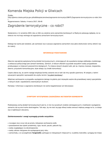 Komenda Miejska Policji w Gliwicach Źródło: http://gliwice.slaska.policja.gov.pl/ka9/bezpieczenstwo/zagrozenie-terrorystyc/28675,Zagrozenie-terrorystyczne-co-robic.htm l Wygenerowano: Sobota, 4 marca 2017, 06:40 Zagrożenie terrorystyczne - co robić? Wydarzenia z 11 września 2001 roku w USA czy ostatnia seria zamachów bombowych w Madrycie pokazują najlepiej, że na świecie nie ma kraju wolnego od zagrożenia zamachami terrorystycznymi. Dlatego też warto jest wiedzieć, jak zachować się w sytuacji zagrożenia zamachem oraz jakie okoliczności winny skłonić nas do reakcji. INFORMACJE PODSTAWOWE Obecnie najczęściej spotykaną formą działań terrorystycznych, zmierzających do wywołania dużego oddźwięku medialnego, a zwłaszcza politycznego jest zamach bombowy. Zamach, w którym ofiarami są przede wszystkim osoby przypadkowe przebywające w miejscach powszechnie dostępnych. To miejsca dużych skupisk ludzi, jak np. imprezy masowe, targowiska, dworce, przystanki komunikacyjne, duże sklepy czy środki komunikacji. Często zdarza się, że zanim nastąpi eksplozja bomby zostanie ona w taki lub inny sposób ujawniona. W związku z takimi sytuacjami specjaliści wprowadzili do użytku termin "incydent bombowy". Właściwe zachowanie w przypadku wystąpienia takiego incydentu jest niezwykle ważne dla prawidłowej reakcji specjalistów z różnych służb i zapobieżeniu ewentualnym skutkom. Pamiętaj ! informacji o zagrożeniu bombowym nie wolno bagatelizować ani lekceważyć. SYMPTOMY WYSTĄPIENIA ZAGROŻENIA INCYDENTEM BOMBOWYM Podstawową cechą działań terrorystycznych jest to, iż nie ma wyraźnych znaków ostrzegawczych o możliwości wystąpienia zamachu lub są one trudno dostrzegalne. Tak więc, by nie stać się jego ofiarą trzeba zwracać większą uwagę na to, co dzieje się w najbliższym otoczeniu. Zainteresowania i uwagi wymagają przede wszystkim: ● rzucające się w oczy lub po prostu nietypowe zachowania osób; ● pozostawione bez opieki przedmioty, typu: teczki, paczki, pakunki itp.; ● osoby wyglądające na obcokrajowców; ● osoby ubrane nietypowo do występującej pory roku; ● samochody, a w szczególności furgonetki, parkujące w nietypowych miejscach tj. w pobliżu kościołów, synagog lub miejsc organizowania imprez masowych i zgromadzeń; Należy jednak pamiętać, że terrorysta nie zawsze musi być odmiennej narodowości i wyróżniać się z tłumu szczególnym wyglądem. POSTĘPOWANIE W SYTUACJACH ZAGROŻENIA INCYDENTEM BOMBOWYM Oto kilka rad, przygotowanych przez ekspertów z Biura Operacji Antyterrorystycznych Komendy Głównej Policji. W budynku użyteczności publicznej: ● zawczasu pomyśl, którędy można się ewakuować. Zapamiętaj, gdzie znajdują się klatki schodowe i wyjścia ewakuacyjne; ● zwróć uwagę na ciężkie lub łatwo tłukące się przedmioty, które mogą być przesunięte, zrzucone lub zniszczone podczas wybuchu ● nie przyjmuj od osób obcych żadnych pakunków oraz sam nie pozostawiaj bagażu bez opieki. Jeżeli jesteś osobą, która przyjęła zgłoszenie o podłożeniu ładunku wybuchowego lub ujawniła przedmiot niewiadomego pochodzenia, co do którego istnieje podejrzenie, że może on stanowić zagrożenie dla osób i mienia, powinieneś ten fakt zgłosić: ● służbom odpowiedzialnym za bezpieczeństwo w danym miejscu; ● administratorowi terenu, na którym zdarzenie ma miejsce; ● Policji lub Straży Miejskiej. Pamiętaj ! Informacji takiej nie należy przekazywać niepowołanym osobom, gdyż jej niekontrolowane rozpowszechnienie może doprowadzić do paniki i w konsekwencji utrudnić przeprowadzenie sprawnej ewakuacji osób z zagrożonego miejsca. W strukturach polskiej Policji funkcjonują pododdziały antyterrorystyczne i komórki minersko-pirotechniczne specjalnie przygotowywane do tego, aby zapobiegać i stawiać czoła aktom terroru. Zawiadamiając Policję należy podać następujące informacje: ● rodzaj zagrożenia i źródło informacji o zagrożeniu (informacja telefoniczna, ujawniony podejrzany przedmiot); ● treść rozmowy z osobą informującą o podłożeniu ładunku wybuchowego; ● numer telefonu, na który przekazano informację o zagrożeniu oraz dokładny czas jej przyjęcia; ● adres, numer telefonu i nazwisko osoby zgłaszającej; ● opis miejsca i wygląd ujawnionego przedmiotu; Ogłoszenie alarmu bombowego oraz procedury postępowania w czasie zagrożenia bombowego: ● Do czasu przybycia Policji akcją kieruje administrator obiektu, terenu lub osoba odpowiedzialna za jego bezpieczeństwo. ● Na miejsce zagrożenia incydentem bombowym należy wezwać służby pomocnicze, takie jak: pogotowie ratunkowe, straż pożarną, pogotowie gazowe, pogotowie wodno- kanalizacyjne, pogotowie energetyczne. ● Po przybyciu Policji na miejsce incydentu bombowego przejmuje ona dalsze kierowanie akcją. ● Przy braku informacji o konkretnym miejscu podłożenia "bomby" użytkownicy pomieszczeń służbowych powinni sprawdzić swoje miejsce pracy i jego bezpośrednie otoczenie pod kątem obecności przedmiotów nieznanego pochodzenia. ● Pomieszczenia ogólnodostępne (korytarze, klatki schodowe, windy, toalety, piwnice, strychy) oraz najbliższe otoczenie zewnętrzne obiektu sprawdzają i przeszukują osoby wyznaczone lub służby odpowiedzialne za bezpieczeństwo w danej instytucji. ● Podejrzanych przedmiotów NIE WOLNO DOTYKAĆ! O ich lokalizacji należy powiadomić administratora oraz osoby odpowiedzialne za bezpieczeństwo. ● Po ogłoszeniu ewakuacji należy zachować spokój i opanowanie, pozwoli to sprawnie i bezpiecznie opuścić zagrożony rejon. ● Po ogłoszeniu ewakuacji w miejscu twojej pracy należy je spokojnie opuścić, zabierając rzeczy osobiste (torebki, siatki, nesesery itp.). ● Identyfikacją i rozpoznawaniem zlokalizowanego ładunku wybuchowego oraz jego neutralizacją zajmują się uprawnione i wyspecjalizowane jednostki i komórki organiz
