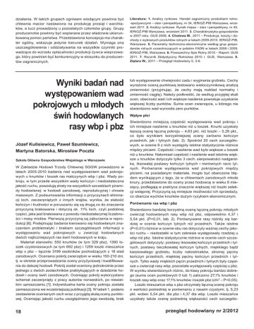 działania. W takich grupach ogniwem wiodącym powinna być chlewnia macior nastawiona na produkcję prosiąt i warchlaków, a tucz prowadzony u pozostałych członków grupy. Grupy producenckie powinny być wspierane przez właściwie ukierunkowaną pomoc państwa. Przedstawiona koncepcja ma charakter ogólny, wskazuje jedynie kierunek działań. Wymaga ona uszczegółowienia i oddziaływania na wszystkie czynniki prowadzące do wzrostu opłacalności produkcji żywca wieprzowego, który powinien być konkurencyjny w stosunku do producentów zagranicznych. Literatura: 1. Analizy rynkowe. Handel zagraniczny produktami rolno-spożywczymi – stan i perspektywy, nr 34, IERiGŻ-PIB Warszawa, wrzesień 2011. 2. Analizy rynkowe. Rynek mięsa – stan i perspektywy, nr 40, IERiGŻ-PIB Warszawa, wrzesień 2011. 3. Charakterystyka gospodarstw w 2007 roku. GUS 2008. 4. Cholewa M., 2011 – Produkcja, koszty i dochody z wybranych produktów rolnych w latach 2009-2010. IERiGŻ-PIB, Warszawa. 5. Parametry techniczno-ekonomiczne według grup gospodarstw rolnych uczestniczących w polskim FADN w latach 2008 i 2009. IERiGŻ-PIB, Warszawa. 6. Powszechny Spis Rolny 2010 – Raport. GUS 2011. 7. Rocznik Statystyczny Rolnictwa 2010 r. GUS, Warszawa. 8. Ziętara W., 2011 – Przegląd Hodowlany 5, 3-6. Wyniki badań nad występowaniem wad pokrojowych u młodych świń hodowlanych rasy wbp i pbz lub występowanie chwiejności zadu i wyginania grzbietu. Cechy wyrażone oceną punktową testowano wieloczynnikową analizą zmienności (przyjmując, że cechy mają rozkład normalny i zmienność ciągłą). Należy podkreślić, że według przyjętej skali ocen, obecność wad i ich większe nasilenie powoduje uzyskanie większej liczby punktów. Suma ocen zwierzęcia, u którego nie stwierdzono wad wynosiła zero punktów. Józef Kulisiewicz, Paweł Szumlewicz, Martyna Batorska, Mirosław Poczta Szkoła Główna Gospodarstwa Wiejskiego w Warszawie W Zakładzie Hodowli Trzody Chlewnej SGGW prowadzono w latach 2005-2010 badania nad występowaniem wad pokrojowych u knurków i loszek ras matczynych wbp i pbz. Wady pokroju, w tym przede wszystkim wady kończyn i niedostateczna jakość ruchu, powodują straty na wszystkich szczeblach piramidy hodowlanej: w hodowli zarodowej, reprodukcyjnej i chowie masowym. Z podsumowania informacji o przyczynach eliminacji loch, zaczerpniętych z innych krajów, wynika, że słabość kończyn i trudności w poruszaniu się są drugą co do znaczenia przyczyną brakowania i dotyczą ok. 11% loch, czyli podobnej części, jaka jest brakowana z powodu niedostatecznej liczebności i masy miotów. Pierwszą przyczyną są zaburzenia w reprodukcji [6]. Podejmując badania kierowano się hodowlanym znaczeniem problematyki i brakiem szczegółowych informacji o występowaniu wad pokrojowych u zwierząt hodowlanych dwóch najliczniejszych ras świń hodowanych w kraju. Materiał stanowiło: 550 knurków (w tym 329 pbz), 1390 loszek czystorasowych (w tym 692 pbz) i 1259 loszki mieszańce wbp x pbz – łącznie 3199 osobników pochodzących z 18 stad zarodowych. Oceniano pokrój zwierzętom w wieku 150-210 dni, tj. w okresie przeprowadzania oceny przyżyciowej i kwalifikowania do dalszej hodowli. Pokrój został oceniony jednokrotnie przez jednego z dwóch zootechników praktykujących w dziedzinie hodowli i oceny świń zarodowych. Oceniając pokrój wykorzystano schemat zaczerpnięty z pracy autorów norweskich, po niewielkim uproszczeniu [1]. Indywidualna karta oceny pokroju została zamieszczona we wcześniejszej publikacji [3]. W tabeli 1. podano zestawienie ocenianych cech wraz z przyjętą skalą oceny punktowej. Oceniając jakość ruchu uwzględniano jego swobodę, brak 18 Wpływ płci Stwierdzono mniejszą częstość występowania wad pokroju i ich mniejsze nasilenie u knurków niż u loszek. Knurki uzyskały lepszą ocenę łączną pokroju – 4,63 pkt. niż loszki – 5,26 pkt., co było wynikiem korzystniejszej oceny zarówno kończyn przednich, jak i tylnych (tab. 2). Spośród 20 cech szczegółowych, w ocenie 9 z nich wystąpiły istotne statystycznie różnice między płciami. Częstość i nasilenie wad było większe u loszek niż u knurków. Natomiast częstość i nasilenie wad istotnie większe u knurków dotyczyło tylko 3 cech: sierpowatości nadgarstka, iksowatej postawy kończyn tylnych i nierównych racic tylnych. Porównanie występowania wad pokrojowych między płciami, na posiadanym materiale, mogło być obarczone błędem wynikającym z tego, że w chlewniach zarodowych młode knury, przedstawione do oceny przez hodowcę w wieku 6 miesięcy, podlegają w praktyce znacznie większej niż loszki selekcji wstępnej. Przyczyną są mniejsze możliwości ich sprzedaży, co obarcza wychów knurków dużym ryzykiem ekonomicznym. Porównanie ras wbp i pbz Stwierdzono bardziej korzystną ocenę łączną pokroju młodych zwierząt hodowlanych rasy wbp niż pbz, odpowiednio 4,37 i 5,54 pkt. (P<0,01, tab. 2). Porównywane rasy różniły się bardziej w ocenie kończyn tylnych niż przednich. Także istotne (P<0,01) różnice w ocenie obu ras dotyczyły ważnej cechy jakości ruchu – niedostatki w tym zakresie występowały rzadziej u wbp niż pbz. Istotne statystycznie różnice w ocenie cech szczegółowych dotyczyły: postawy iksowatej kończyn przednich i tylnych, postawy beczkowatej kończyn tylnych, miękkiego bądź karpiowatego grzbietu, liczby nakostniaków, stromej pęciny kończyn przednich, miękkiej pęciny kończyn przednich i tylnych. Tylko wady miękkich pęcin przednich i tylnych były częstsze u zwierząt rasy wbp, pozostałe występowały częściej u pbz. W wyniku stwierdzonych różnic, do klasy pokroju bardzo dobrego (suma ocen punktowych 0 lub 1) zaliczono 27,1% knurków i loszek rasy wbp oraz 17,1% knurków i loszek pbz (chi2 – P<0,05). Loszki mieszańce wbp x pbz otrzymały łączną ocenę pokroju o wartości pośredniej w porównani