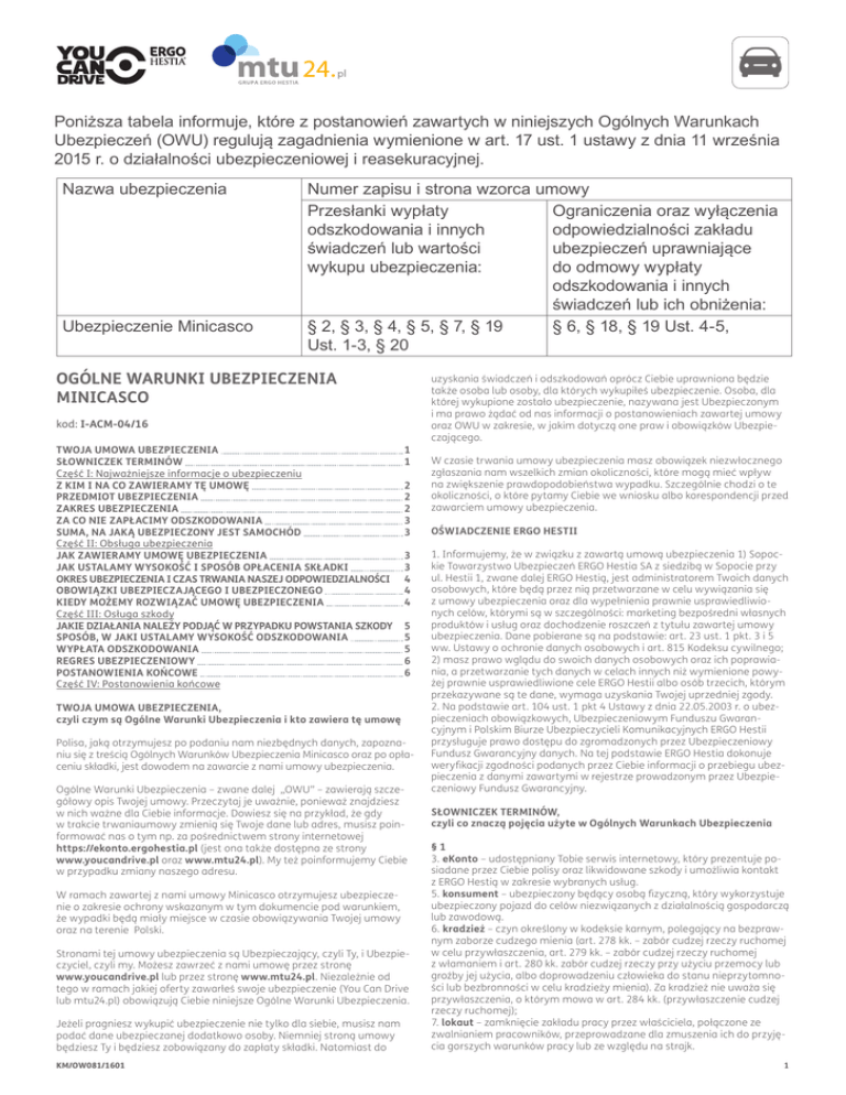 Poniższa tabela informuje, które z postanowień zawartych w niniejszych Ogólnych Warunkach Ubezpieczeń (OWU) regulują zagadnienia wymienione w art. 17 ust. 1 ustawy z dnia 11 września 2015 r. o działalności ubezpieczeniowej i reasekuracyjnej. Nazwa ubezpieczenia Ubezpieczenie Minicasco Numer zapisu i strona wzorca umowy Przesłanki wypłaty Ograniczenia oraz wyłączenia odszkodowania i innych odpowiedzialności zakładu świadczeń lub wartości ubezpieczeń uprawniające wykupu ubezpieczenia: do odmowy wypłaty odszkodowania i innych świadczeń lub ich obniżenia: § 2, § 3, § 4, § 5, § 7, § 19 § 6, § 18, § 19 Ust. 4-5, Ust. 1-3, § 20 OGÓLNE WARUNKI UBEZPIECZENIA MINICASCO kod: I-ACM-04/16 TWOJA UMOWA UBEZPIECZENIA SŁOWNICZEK TERMINÓW Część I: Najważniejsze informacje o ubezpieczeniu Z KIM I NA CO ZAWIERAMY TĘ UMOWĘ PRZEDMIOT UBEZPIECZENIA ZAKRES UBEZPIECZENIA ZA CO NIE ZAPŁACIMY ODSZKODOWANIA SUMA, NA JAKĄ UBEZPIECZONY JEST SAMOCHÓD Część II: Obsługa ubezpieczenia JAK ZAWIERAMY UMOWĘ UBEZPIECZENIA JAK USTALAMY WYSOKOŚĆ I SPOSÓB OPŁACENIA SKŁADKI OKRES UBEZPIECZENIA I CZAS TRWANIA NASZEJ ODPOWIEDZIALNOŚCI OBOWIĄZKI UBEZPIECZAJĄCEGO I UBEZPIECZONEGO KIEDY MOŻEMY ROZWIĄZAĆ UMOWĘ UBEZPIECZENIA Część III: Osługa szkody JAKIE DZIAŁANIA NALEŻY PODJĄĆ W PRZYPADKU POWSTANIA SZKODY SPOSÓB, W JAKI USTALAMY WYSOKOŚĆ ODSZKODOWANIA WYPŁATA ODSZKODOWANIA REGRES UBEZPIECZENIOWY POSTANOWIENIA KOŃCOWE Część IV: Postanowienia końcowe 1 1 2 2 2 3 3 3 3 4 4 4 5 5 5 6 6 TWOJA UMOWA UBEZPIECZENIA, czyli czym są Ogólne Warunki Ubezpieczenia i kto zawiera tę umowę Polisa, jaką otrzymujesz po podaniu nam niezbędnych danych, zapoznaniu się z treścią Ogólnych Warunków Ubezpieczenia Minicasco oraz po opłaceniu składki, jest dowodem na zawarcie z nami umowy ubezpieczenia. Ogólne Warunki Ubezpieczenia – zwane dalej „OWU” – zawierają szczegółowy opis Twojej umowy. Przeczytaj je uważnie, ponieważ znajdziesz w nich ważne dla Ciebie informacje. Dowiesz się na przykład, że gdy w trakcie trwaniaumowy zmienią się Twoje dane lub adres, musisz poinformować nas o tym np. za pośrednictwem strony internetowej https://ekonto.ergohestia.pl (jest ona także dostępna ze strony www.youcandrive.pl oraz www.mtu24.pl). My też poinformujemy Ciebie w przypadku zmiany naszego adresu. W ramach zawartej z nami umowy Minicasco otrzymujesz ubezpieczenie o zakresie ochrony wskazanym w tym dokumencie pod warunkiem, że wypadki będą miały miejsce w czasie obowiązywania Twojej umowy oraz na terenie Polski. Stronami tej umowy ubezpieczenia są Ubezpieczający, czyli Ty, i Ubezpieczyciel, czyli my. Możesz zawrzeć z nami umowę przez stronę www.youcandrive.pl lub przez stronę www.mtu24.pl. Niezależnie od tego w ramach jakiej oferty zawarłeś swoje ubezpieczenie (You Can Drive lub mtu24.pl) obowiązują Ciebie niniejsze Ogólne Warunki Ubezpieczenia. Jeżeli pragniesz wykupić ubezpieczenie nie tylko dla siebie, musisz nam podać dane ubezpieczanej dodatkowo osoby. Niemniej stroną umowy będziesz Ty i będziesz zobowiązany do zapłaty składki. Natomiast do KM/OW081/1601 uzyskania świadczeń i odszkodowań oprócz Ciebie uprawniona będzie także osoba lub osoby, dla których wykupiłeś ubezpieczenie. Osoba, dla której wykupione zostało ubezpieczenie, nazywana jest Ubezpieczonym i ma prawo żądać od nas informacji o postanowieniach zawartej umowy oraz OWU w zakresie, w jakim dotyczą one praw i obowiązków Ubezpieczającego. W czasie trwania umowy ubezpieczenia masz obowiązek niezwłocznego zgłaszania nam wszelkich zmian okoliczności, które mogą mieć wpływ na zwiększenie prawdopodobieństwa wypadku. Szczególnie chodzi o te okoliczności, o które pytamy Ciebie we wniosku albo korespondencji przed zawarciem umowy ubezpieczenia. OŚWIADCZENIE ERGO HESTII 1. Informujemy, że w związku z zawartą umową ubezpieczenia 1) Sopockie Towarzystwo Ubezpieczeń ERGO Hestia SA z siedzibą w Sopocie przy ul. Hestii 1, zwane dalej ERGO Hestią, jest administratorem Twoich danych osobowych, które będą przez nią przetwarzane w celu wywiązania się z umowy ubezpieczenia oraz dla wypełnienia prawnie usprawiedliwionych celów, którymi są w szczególności: marketing bezpośredni własnych produktów i usług oraz dochodzenie roszczeń z tytułu zawartej umowy ubezpieczenia. Dane pobierane są na podstawie: art. 23 ust. 1 pkt. 3 i 5 ww. Ustawy o ochronie danych osobowych i art. 815 Kodeksu cywilnego; 2) masz prawo wglądu do swoich danych osobowych oraz ich poprawiania, a przetwarzanie tych danych w celach innych niż wymienione powyżej prawnie usprawiedliwione cele ERGO Hestii albo osób trzecich, którym przekazywane są te dane, wymaga uzyskania Twojej uprzedniej zgody. 2. Na podstawie art. 104 ust. 1 pkt 4 Ustawy z dnia 22.05.2003 r. o ubezpieczeniach obowiązkowych, Ubezpieczeniowym Funduszu Gwarancyjnym i Polskim Biurze Ubezpieczycieli Komunikacyjnych ERGO Hestii przysługuje prawo dostępu do zgromadzonych przez Ubezpieczeniowy Fundusz Gwarancyjny danych. Na tej podstawie ERGO Hestia dokonuje weryfikacji zgodności podanych przez Ciebie informacji o przebiegu ubezpieczenia z danymi zawartymi w rejestrze prowadzonym przez Ubezpieczeniowy Fundusz Gwarancyjny. SŁOWNICZEK TERMINÓW, czyli co znaczą pojęcia użyte w Ogólnych Warunkach Ubezpieczenia §1 3. eKonto – udostępniany Tobie serwis internetowy, który prezentuje posiadane przez Ciebie polisy oraz likwidowane szkody i umożliwia kontakt z ERGO Hestią w zakresie wybranych usług. 5. konsument – ubezpieczony będący osobą fizyczną, który wykorzystuje ubezpieczony pojazd do celów niezwiązanych z działalnością gospodarczą lub zawodową. 6. kradzież – czyn określony w kodeksie karnym, polegający na bezprawnym zaborze cudzego mienia (art. 278 kk. – zabór cudzej rzeczy ruchomej w celu przywłaszczenia, art. 279 kk. – zabór cudzej rzeczy ruchomej z wł