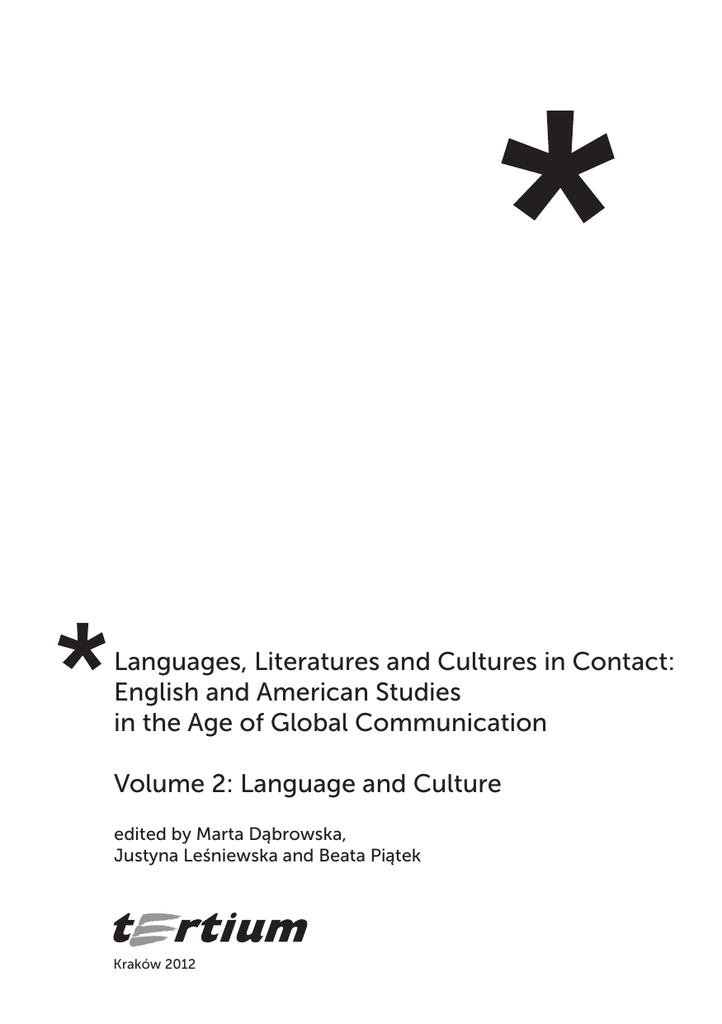 Languages, Literatures and Cultures in Contact: English and American Studies in the Age of Global Communication Volume 2: Language and Culture edited by Marta Dąbrowska, Justyna Leśniewska and Beata Piątek Kraków 2012 litera cul es ag Languages, Literatures and Cultures in Contact: English and American Studies in the Age of Global Communication, Vol. 2: Language and Culture www.tertium.edu.pl The publication of this volume was supported by the Jagiellonian University Board of reviewers: Prof. dr hab. Elżbieta Mańczak-Wohlfeld Dr hab. Elżbieta Chrzanowska-Kluczewska Prof. dr. hab. Anna Niżegorodcew Dr hab. Andrzej Pawelec Publisher’s mailing address: Krakowskie Towarzystwo Popularyzowania Wiedzy o Komunikacji Językowej “Tertium” ul. Łobzowska 12 31-140 Kraków, Poland Contact us at: [email protected] The publications of Cracow Tertium Society which remain in print are available directly from the publisher (order from the website, payment bank transfer). Credit card orders: www.haeria.pl. © 2012 Cracow Tertium Society for the Promotion of Language Studies All rights reserved Cover design: Marcin Klag Typeseing: Sebastian Leśniewski Printed by: Drukarnia Eikon Plus, Kraków ISBN 978-83-61678-68-7 Contents Preface . . . . . . . . . . . . . . . . . . . . . . . . . . . . . . . . . Part I Multidisciplinary approaches to language studies 9 15 Elżbieta Chrzanowska-Kluczewska Caught in the web of worlds: Modalities of oneiric discourse and Freudian figuration in Kazuo Ishiguro’s e Unconsoled . . . . . . 17 Olga Vorobyova Caught in the web of worlds: Postmodernist wanderings through the ASC labyrinths in Kazuo Ishiguro’s e Unconsoled – Philosophy, emotions, perception . . . . . . . . . . . . . . . . . . . . . . . . . . 37 Hans-Jürgen Diller Historical Semantics, corpora, and the unity of English Studies . . . . . 57 Barbara Bacz For the conceptualization approach to meaning: Evidence from languages in contact . . . . . . . . . . . . . . . . . . . . . . . 83 Branka Drljača Margić Croatian university students’ perception of stylistic and domain-based differences between Anglicisms and their native equivalents . . . . . . . . . . . . . . . . . . . . . . . . . . . . . . . 109 Dobromiła Jagiełła On the syntactic and discourse/pragmatic aspects of parenthetical constructions: Evidence from English and Polish . . . . . . . . . . . . 127 Part II Computer-mediated discourse 149 Jolanta Łącka-Badura Global leaders, product pioneers, centres of excellence: e linguistic representation of an ideal employer in British online job ads . . . . . . 151 6 Contents Anna Tereszkiewicz Global trends in mainstream citizen journalism . . . . . . . . . . . . . 173 Marianna Lya Zummo Health on the net: e doctor answers . . . . . . . . . . . . . . . . . 191 Yen-Liang Lin Lexical features of adolescent online intercultural communication . . . 217 Marta Dąbrowska “You look fab on this pic!”: Gender and age in Facebook communication 233 Part III English studies at university level 259 Anna Niżegorodcew Communicative competence, individual differences and L2 learning theories: A theoretical background for an MA applied linguistics course 261 Danuta Gabryś-Barker At the initiation stage: Pre-service teachers in their period of school placement . . . . . . . . . . . . . . . . . . . . . . . . . . . . . . . 275 Alan S. Weber English studies in the Middle East . . . . . . . . . . . . . . . . . . . 293 Part IV Teaching EFL: Focus on the language classroom 309 Mirosław Pawlak Corrective feedback during fluency-oriented activities: Challenging the myths . . . . . . . . . . . . . . . . . . . . . . . . . . . . . . . 311 Monika Kusiak How “educated” is educational talk in an academic FL classroom? . . . 333 Ewa Donesch-Jeżo Integrating corpus work into teaching academic discourse writing to university students . . . . . . . . . . . . . . . . . . . . . . . . . . . 353 Marcin Kleban Division of labour in a collaborative writing task . . . . . . . . . . . . 373 Contents 7 Joanna Rokita-Jaśkow Motives for early foreign language learning and parental educational aspirations in the era of globalization . . . . . . . . . . . . . . . . . . 393 Part V Culture: Film as the medium of globalisation 407 Claudia Ioana Doroholschi Sex, art and Beethoven: e languages of sexuality in Kubrick’s A Clockwork Orange . . . . . . . . . . . . . . . . . . . . . . . . . . 409 Piotr Olański Contemporary flâneur in Tokyo: Analysis of a non-western city in Sofia Coppola’s Lost in Translation . . . . . . . . . . . . . . . . . . 421 Bartłomiej Błaszkiewicz On the figure of the devil in Neil Young’s Greendale . . . . . . . . . . 433 Dominika Oramus Messengers of “self-help” and “well-being”: e use of angels in contemporary popular culture . . . . . . . . . . . . . . . . . . . . 447 Part VI Topics in translation studies Agata Hołobut Individualization of film characters in subtitling and voice-over 459 . . . . 461 Alina Szwajczuk, Arkadiusz Kaczorowski Why university is not always the optimum choice: On incompatible translations of tertiary school names in Poland . . . . . . . . . . . . . 481 Iwona Staniszewska Sailing into unknown waters: Popularizing Latin American literature and the translator’s visibility . . . . . . . . . . . . . . . . . . . . . . 499