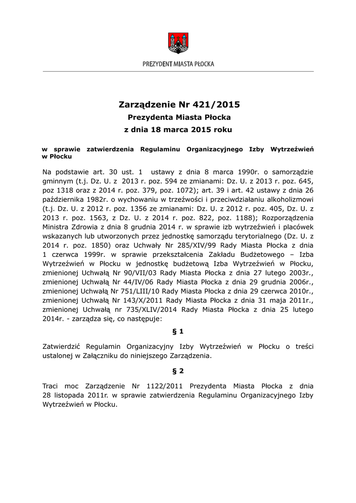 Zarządzenie Nr 421/2015 Prezydenta Miasta Płocka z dnia 18 marca 2015 roku w sprawie w Płocku zatwierdzenia Regulaminu Organizacyjnego Izby Wytrzeźwień Na podstawie art. 30 ust. 1 ustawy z dnia 8 marca 1990r. o samorządzie gminnym (t.j. Dz. U. z 2013 r. poz. 594 ze zmianami: Dz. U. z 2013 r. poz. 645, poz 1318 oraz z 2014 r. poz. 379, poz. 1072); art. 39 i art. 42 ustawy z dnia 26 października 1982r. o wychowaniu w trzeźwości i przeciwdziałaniu alkoholizmowi (t.j. Dz. U. z 2012 r. poz. 1356 ze zmianami: Dz. U. z 2012 r. poz. 405, Dz. U. z 2013 r. poz. 1563, z Dz. U. z 2014 r. poz. 822, poz. 1188); Rozporządzenia Ministra Zdrowia z dnia 8 grudnia 2014 r. w sprawie izb wytrzeźwień i placówek wskazanych lub utworzonych przez jednostkę samorządu terytorialnego (Dz. U. z 2014 r. poz. 1850) oraz Uchwały Nr 285/XIV/99 Rady Miasta Płocka z dnia 1 czerwca 1999r. w sprawie przekształcenia Zakładu Budżetowego – Izba Wytrzeźwień w Płocku w jednostkę budżetową Izba Wytrzeźwień w Płocku, zmienionej Uchwałą Nr 90/VII/03 Rady Miasta Płocka z dnia 27 lutego 2003r., zmienionej Uchwałą Nr 44/IV/06 Rady Miasta Płocka z dnia 29 grudnia 2006r., zmienionej Uchwałą Nr 751/LIII/10 Rady Miasta Płocka z dnia 29 czerwca 2010r., zmienionej Uchwałą Nr 143/X/2011 Rady Miasta Płocka z dnia 31 maja 2011r., zmienionej Uchwałą nr 735/XLIV/2014 Rady Miasta Płocka z dnia 25 lutego 2014r. - zarządza się, co następuje: §1 Zatwierdzić Regulamin Organizacyjny Izby Wytrzeźwień w Płocku o treści ustalonej w Załączniku do niniejszego Zarządzenia. §2 Traci moc Zarządzenie Nr 1122/2011 Prezydenta Miasta Płocka z dnia 28 listopada 2011r. w sprawie zatwierdzenia Regulaminu Organizacyjnego Izby Wytrzeźwień w Płocku. §3 Wykonanie Zarządzenia powierza się Zastępcy Prezydenta Miasta Płocka ds. Polityki Społecznej. §4 Zarządzenie wchodzi w życie z dniem podpisania. Prezydent Miasta Płocka /-/ Andrzej Nowakowski Załącznik Do Zarządzenia Nr 421/2015 Miasta Płocka z dnia 18 marca 2015 roku REGULAMIN ORGANIZACYJNY IZBY WYTRZEŹWIEŃ W PŁOCKU I. Postanowienia ogólne §1 Izba Wytrzeźwień w Płocku – Jednostka Budżetowa zwana dalej „Izbą” działa na podstawie: 1. ustawy z dnia 8 marca 1990 r. o samorządzie gminnym: (tj. Dz.U. z 2013 r. poz. 594 z późn. zm.), 2. ustawy z dnia 26 października 1982 r. o wychowaniu w trzeźwości i przeciwdziałaniu alkoholizmowi (Dz.U. z 2012 r. poz. 1356 z późn. zm.), 3. ustawy z dnia 27 sierpnia 2009 r. o finansach publicznych (tj. Dz.U. z 2013 r. poz. 885 z późn. zm.), 4. rozporządzenia Ministra Zdrowia z dnia 8 grudnia 2014 r. w sprawie izb wytrzeźwień i placówek wskazanych lub utworzonych przez jednostkę samorządu terytorialnego (Dz.U. z 2014 poz. 1850), 5. niniejszego Regulaminu II. Cele i zadania §2 1. Izba jest instytucją powołaną do ochrony porządku i bezpieczeństwa publicznego poprzez izolowanie osób będących w stanie nietrzeźwości, które swoim zachowaniem dają powód do zgorszenia w miejscu publicznym lub w zakładzie pracy, znajdują się w okolicznościach zagrażających ich życiu lub zdrowiu albo zagrażają życiu lub zdrowiu innych osób. 2. Osoby doprowadzone do Izby pozostają tam aż do wytrzeźwienia, nie dłużej niż 24 godziny. Osoby do lat 18 umieszcza się w odrębnych pomieszczeniach, oddzielnie od osób dorosłych. 3. Osoby w stanie nietrzeźwości mogą być doprowadzone do Izby przez funkcjonariuszy Policji lub Straży Miejskiej, zwanych dalej „doprowadzającymi”. 4. Podstawą przyjęcia osoby doprowadzonej do Izby jest wynik badania na zawartość alkoholu w organizmie tej osoby wskazujący na stan nietrzeźwości. Wynik badania potwierdzony jest wydrukiem z atestowanego urządzenia elektronicznego służącego do pomiaru zawartości alkoholu w organizmie. Wydruk załącza się do karty ewidencyjnej. 5. Badanie, o którym mowa w ust. 4, przeprowadza się za zgodą osoby doprowadzonej do Izby. W razie nie wyrażenia zgody na przeprowadzenie badania, o którym mowa w ust. 4 osobę doprowadzoną przyjmuje się do Izby wyłącznie w przypadku występowania symptomów wskazujących na stan nietrzeźwości potwierdzonych pisemnie przez lekarza lub felczera Izby w karcie ewidencyjnej. 6. Informacja o nie wyrażeniu zgody osoby doprowadzonej na badanie, o którym mowa w ust. 4 winna być odnotowana w karcie ewidencyjnej. 7. O przyjęciu lub odmowie przyjęcia do Izby osoby w stanie nietrzeźwości decyduje: Dyrektor Izby bądź upoważnione przez niego osoby. 8. O zwolnieniu osoby przyjętej z Izby decyduje odpowiednio Dyrektor Izby lub upoważniona przez niego osoba na podstawie badania zawartości alkoholu w organizmie osoby zwalnianej, w miarę potrzeb biorąc pod uwagę opinię lekarza lub felczera. §3 1. Osobie doprowadzonej do Izby przysługuje zażalenie do sądu rejonowego właściwego ze względu na miejsce doprowadzenia. W zażaleniu osoba doprowadzona może domagać się zbadania zasadności i legalności doprowadzenia, jak również decyzji o przyjęciu albo zatrzymaniu oraz prawidłowości ich wykonania. O tym prawie osoby zwalniane z Izby są informowane pisemnie. 2. W przypadku, gdy zażalenie składa się za pośrednictwem Izby podmiot ten przekazuje zażalenie niezwłocznie sądowi określonemu w ust. 1. 3. Do rozpoznania zażalenia stosuje się przepisy ustawy z dnia 6 czerwca 1997 r. – Kodeks postępowania karnego (Dz.U. z 1997r. Nr 89, poz. 555, z póżn. zm.). §4 Izba zapewnia osobom doprowadzonym w stanie nietrzeźwości bezpieczeństwo, świadczenia higieniczno-sanitarne oraz doraźną medyczną. opiekę, pomoc §5 1. O przyjęciu do Izby zawiadamia się niezwłocznie: a) w przypadku małoletnich – ich rodziców lub opiekunów oraz sąd opiekuńczy, b) w przypadku innych osób – na ich żądanie, wskazane przez nie osoby. 2. Osoby małoletnie doprowadzone do Izby mogą być zwolnione, niezwłocznie po udzieleniu im niezbędnych świadczeń zd