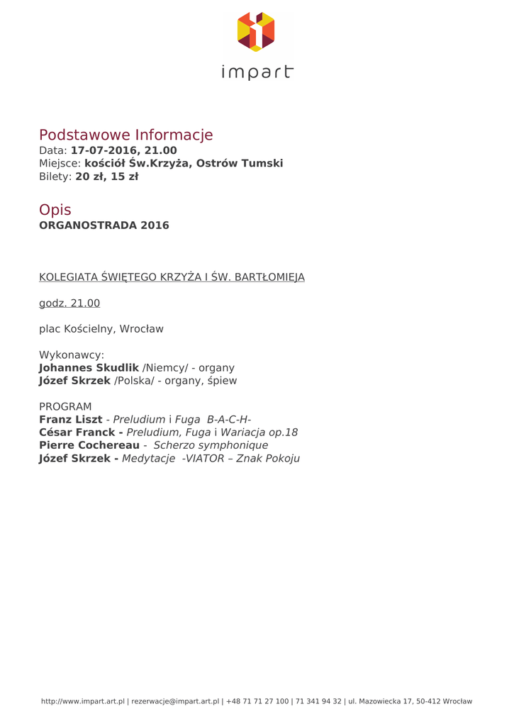 Podstawowe Informacje Data: 17-07-2016, 21.00 Miejsce: kościół Św.Krzyża, Ostrów Tumski Bilety: 20 zł, 15 zł Opis ORGANOSTRADA 2016 KOLEGIATA ŚWIĘTEGO KRZYŻA I ŚW. BARTŁOMIEJA godz. 21.00 plac Kościelny, Wrocław Wykonawcy: Johannes Skudlik /Niemcy/ - organy Józef Skrzek /Polska/ - organy, śpiew PROGRAM Franz Liszt - Preludium i Fuga B-A-C-HCésar Franck - Preludium, Fuga i Wariacja op.18 Pierre Cochereau - Scherzo symphonique Józef Skrzek - Medytacje -VIATOR – Znak Pokoju http://www.impart.art.pl | [email protected] | +48 71 71 27 100 | 71 341 94 32 | ul. Mazowiecka 17, 50-412 Wrocław Powered by TCPDF (www.tcpdf.org)