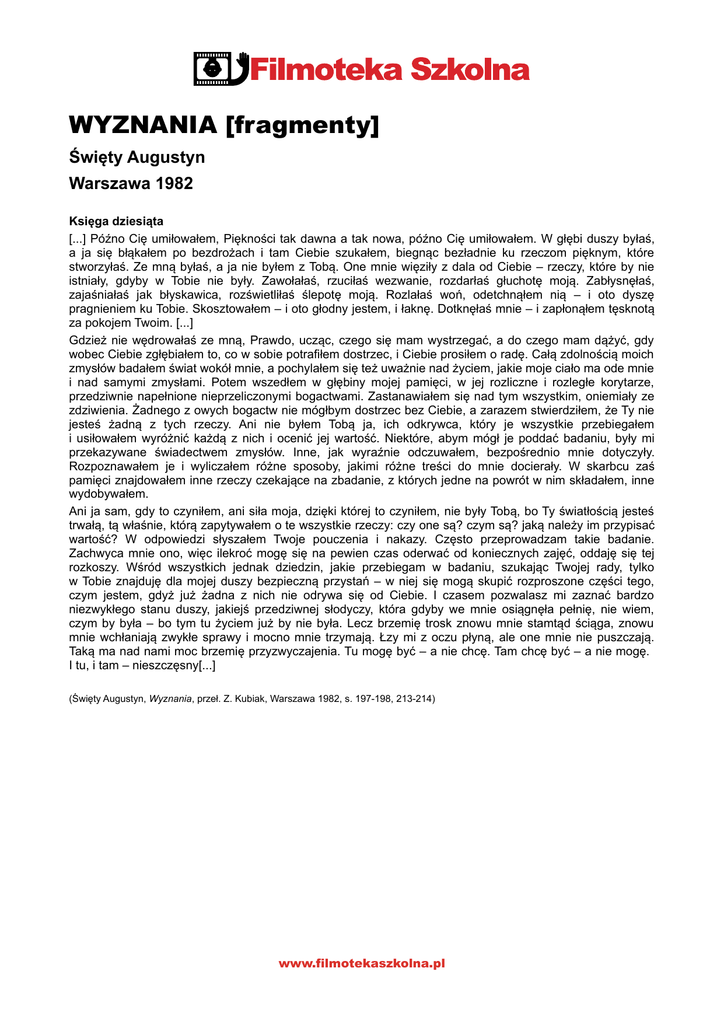 WYZNANIA [fragmenty] wity Augustyn Warszawa 1982 Ksiga dziesita [...] Póno Ci umiowaem, Piknoci tak dawna a tak nowa, póno Ci umiowaem. W gbi duszy bya, a ja si bkaem po bezdroach i tam Ciebie szukaem, biegnc bezadnie ku rzeczom piknym, które stworzya. Ze mn bya, a ja nie byem z Tob. One mnie wiziy z dala od Ciebie – rzeczy, które by nie istniay, gdyby w Tobie nie byy. Zawoaa, rzucia wezwanie, rozdara guchot moj. Zabysna, zajaniaa jak byskawica, rozwietlia lepot moj. Rozlaa wo, odetchnem ni – i oto dysz pragnieniem ku Tobie. Skosztowaem – i oto godny jestem, i akn. Dotkna mnie – i zaponem tsknot za pokojem Twoim. [...] Gdzie nie wdrowaa ze mn, Prawdo, uczc, czego si mam wystrzega, a do czego mam dy, gdy wobec Ciebie zgbiaem to, co w sobie potrafiem dostrzec, i Ciebie prosiem o rad. Ca zdolnoci moich zmysów badaem wiat wokó mnie, a pochylaem si te uwanie nad yciem, jakie moje ciao ma ode mnie i nad samymi zmysami. Potem wszedem w gbiny mojej pamici, w jej rozliczne i rozlege korytarze, przedziwnie napenione nieprzeliczonymi bogactwami. Zastanawiaem si nad tym wszystkim, oniemiay ze zdziwienia. adnego z owych bogactw nie mógbym dostrzec bez Ciebie, a zarazem stwierdziem, e Ty nie jeste adn z tych rzeczy. Ani nie byem Tob ja, ich odkrywca, który je wszystkie przebiegaem i usiowaem wyróni kad z nich i oceni jej warto. Niektóre, abym móg je podda badaniu, byy mi przekazywane wiadectwem zmysów. Inne, jak wyranie odczuwaem, bezporednio mnie dotyczyy. Rozpoznawaem je i wyliczaem róne sposoby, jakimi róne treci do mnie docieray. W skarbcu za pamici znajdowaem inne rzeczy czekajce na zbadanie, z których jedne na powrót w nim skadaem, inne wydobywaem. Ani ja sam, gdy to czyniem, ani sia moja, dziki której to czyniem, nie byy Tob, bo Ty wiatoci jeste trwa, t wanie, któr zapytywaem o te wszystkie rzeczy: czy one s? czym s? jak naley im przypisa warto? W odpowiedzi syszaem Twoje pouczenia i nakazy. Czsto przeprowadzam takie badanie. Zachwyca mnie ono, wic ilekro mog si na pewien czas oderwa od koniecznych zaj, oddaj si tej rozkoszy. Wród wszystkich jednak dziedzin, jakie przebiegam w badaniu, szukajc Twojej rady, tylko w Tobie znajduj dla mojej duszy bezpieczn przysta – w niej si mog skupi rozproszone czci tego, czym jestem, gdy ju adna z nich nie odrywa si od Ciebie. I czasem pozwalasz mi zazna bardzo niezwykego stanu duszy, jakiej przedziwnej sodyczy, która gdyby we mnie osigna peni, nie wiem, czym by bya – bo tym tu yciem ju by nie bya. Lecz brzemi trosk znowu mnie stamtd ciga, znowu mnie wchaniaj zwyke sprawy i mocno mnie trzymaj. zy mi z oczu pyn, ale one mnie nie puszczaj. Tak ma nad nami moc brzemi przyzwyczajenia. Tu mog by – a nie chc. Tam chc by – a nie mog. I tu, i tam – nieszczsny[...] (wity Augustyn, Wyznania, prze. Z. Kubiak, Warszawa 1982, s. 197-198, 213-214) www.filmotekaszkolna.pl