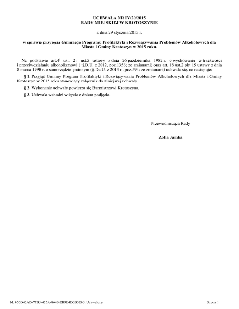 UCHWAŁA NR IV/20/2015 RADY MIEJSKIEJ W KROTOSZYNIE z dnia 29 stycznia 2015 r. w sprawie przyjęcia Gminnego Programu Profilaktyki i Rozwiązywania Problemów Alkoholowych dla Miasta i Gminy Krotoszyn w 2015 roku. Na podstawie art.41 ust. 2 i ust.5 ustawy z dnia 26 października 1982 r. o wychowaniu w trzeźwości i przeciwdziałaniu alkoholizmowi ( tj.D.U. z 2012, poz.1356; ze zmianami) oraz art. 18 ust.2 pkt 15 ustawy z dnia 8 marca 1990 r. o samorządzie gminnym (tj.Dz.U. z 2013 r., poz.594; ze zmianami) uchwala się, co następuje: § 1. Przyjąć Gminny Program Profilaktyki i Rozwiązywania Problemów Alkoholowych dla Miasta i Gminy Krotoszyn w 2015 roku stanowiący załącznik do niniejszej uchwały. § 2. Wykonanie uchwały powierza się Burmistrzowi Krotoszyna. § 3. Uchwała wchodzi w życie z dniem podjęcia. Przewodnicząca Rady Zofia Jamka Id: 056D43AD-77B5-425A-8640-EB9E4D0B0E00. Uchwalony Strona 1 Załącznik do Uchwały Nr IV/20/2015 Rady Miejskiej w Krotoszynie z dnia 29 stycznia 2015 r. Wprowadzenie Wśród wielu problemów społecznych występujących w naszym kraju, problemy związane z alkoholem mają szczególne znaczenie. Wynika to przede wszystkim z rozmiarów tego zjawiska oraz społecznych i ekonomicznych kosztów, jakie z tego tytułu ponosi budżet państwa. Nadużywanie alkoholu jest jednym z czynników silnie obniżających stan zdrowotności społeczeństwa. Liczne badania dowodzą, że nie tylko osoby nadużywające alkoholu ponoszą szkody zdrowotne, ale także osoby pijące w sposób ryzykowny i szkodliwy. Jak wykazują badania corocznie z przyczyn pośrednio lub bezpośrednio związanych z nadużywaniem alkoholu, umiera w Polsce kilkanaście tysięcy osób. Alkohol może być przyczyną ponad 60 chorób. Konsumpcja alkoholu ma istotny wpływ nie tylko na zdrowie fizyczne ale również na zdrowie psychiczne zarówno osób pijących jak również członków ich rodzin, a konsekwencje tego dotyczą nie tylko pijących szkodliwie, ale ma wpływ na całą populację. Nadużywanie alkoholu powoduje wiele szkód społecznych takich jak: - zakłócenie bezpieczeństwa publicznego, - przestępczość, - wypadki samochodowe, - przemoc w rodzinie, - ubóstwo i bezrobocie. Najtrudniej wyliczalne są straty w sferze psychologicznej i emocjonalnej dotyczące szczególnie rodzin. Rozmiary tych szkód mogą być zmniejszone przez skuteczną politykę wobec alkoholu i problemów z nim związanych. Samorząd gminy realizuje swoje zadania w postaci gminnego programu profilaktyki i rozwiązywania problemów alkoholowych, który uchwalany jest corocznie przez Radę Gminy. Zadania przewidziane do realizacji zapisane w Gminnym Programie Profilaktyki i Rozwiązywania Problemów Alkoholowych na 2014 rok są w większości kontynuacją działalności prowadzonej w tym zakresie w latach ubiegłych. Podstawę prawną rozwiązywania problemów alkoholowych w Polsce stanowi ustawa z dnia 26 października 1982 r. o wychowaniu w trzeźwości i przeciwdziałaniu alkoholizmowi (Dz. U. z 2012 r. poz. 1356; ze zmianami). Ustawa określa między innymi zadania samorządu gminnego oraz kierunki polityki państwa wobec alkoholu. W szczególności zadania samorządu gminnego obejmują: 1) zwiększenie dostępności pomocy terapeutycznej i rehabilitacyjnej dla osób uzależnionych od alkoholu, 2) udzielanie rodzinom, w których występują problemy alkoholowe pomocy psychospołecznej i prawnej, a w szczególności ochrony przed przemocą w rodzini, 3) prowadzenie profilaktycznej działalności informacyjnej i edukacyjnej w zakresie rozwiązywania problemów alkoholowych i przeciwdziałania narkomanii w szczególności dla dzieci i młodzieży, 4) podejmowanie interwencji w związku z naruszeniem przepisów określonych w art. 131 i 15 ustawy oraz występowanie przed sądem w charakterze oskarżyciela publicznego, 5) wspomaganie działalności instytucji, stowarzyszeń i osób fizycznych służącej rozwiązywaniu problemów alkoholowych. Diagnoza problemów alkoholowych Miasto i Gmina Krotoszyn liczy około 40.922 mieszkańców (stan na dzień 31.12.2013 r.) szacować należy, że w naszym mieście i gminie żyje około 818 osób uzależnionych od alkoholu. Wokół nich żyją dorośli członkowie rodzin (małżonkowie, rodzeństwo, rodzice, dziadkowie) czyli około 1.636 mieszkańców. Ofertą dla nich sa działajace na terenie Gminy Krotoszyn następujące instytucje : - Punkt Konsultacyjny dla osób z problemem alkoholowym Id: 056D43AD-77B5-425A-8640-EB9E4D0B0E00. Uchwalony Strona 1 - 3 grupy AA „ Kroton”, „Dąb”, “Dwudziesta” oraz grupa Al-Anon „Gracja” - 3 świetlice socjoterapeutyczne, świetlice środowiskowe oraz świetlice opiekuńczo-wychowawcze - Młodzieżowy Klub Środowiskowy „Rivendell” - Powiatowe Centrum Pomocy Rodzinie - Ośrodek Interwencji Kryzysowej - Miejsko-Gminny Ośrodek Pomocy Społecznej - Sąd Rejonowy z zespołem kuratorskim - Poradnia Zdrowia Psychicznego “Psyche” - Poradnia Leczenia Uzależnień - Poradnia Psychologiczno-Pedagogiczna - Organizacje pozarządowe działające w sferze pomocy dzieciom i rodzinom z problemem alkoholowym - Krotoszyński Ośrodek Kultury z sekcjami zainteresowań - Centrum Sportu i Rekreacji „Wodnik” . Analizując problemy społeczne ujawniające się w Mieście i Gminie Krotoszyn na pierwsze miejsce wysuwa się spożywanie alkoholu i związana z tym przemoc zwłaszcza w środowiskach rodzinnych. O rozmiarach tego problemu świadczą niektóre dane za 2014 rok: - około 120 osób zatrzymanych do wytrzeźwienia w policyjnej izbie zatrzymań, - Gminna Komisja Rozwiązywania Problemów Alkoholowych rozpatrzyła 39 wniosków o objęcie osób uzależnionych od alkoholu leczeniem w zakładzie lecznictwa odwykowego, z tego 27 wnioski nowe oraz 12 wniosków dotyczyło osób zgłoszonych już w ubiegłych latach, - do Sądu skierowano 5 wnioski o wydanie postanowienia zobowiązujące do leczenia odwykowego, - zdiagnozo