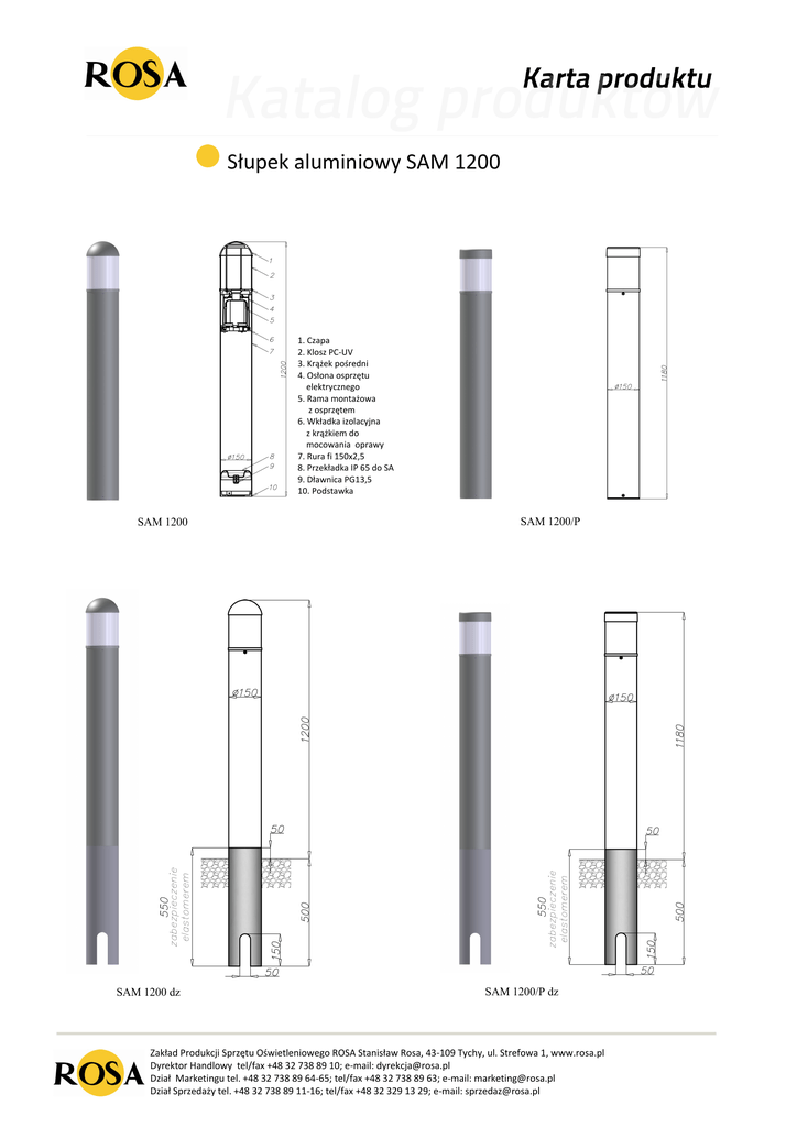 Słupek aluminiowy SAM 1200 1. Czapa 2. Klosz PC-UV 3. Krążek pośredni 4. Osłona osprzętu elektrycznego 5. Rama montażowa z osprzętem 6. Wkładka izolacyjna z krążkiem do mocowania oprawy 7. Rura fi 150x2,5 8. Przekładka IP 65 do SA 9. Dławnica PG13,5 10. Podstawka SAM 1200 SAM 1200 dz SAM 1200/P SAM 1200/P dz Zakład Produkcji Sprzętu Oświetleniowego ROSA Stanisław Rosa, 43-109 Tychy, ul. Strefowa 1, www.rosa.pl Dyrektor Handlowy tel/fax +48 32 738 89 10; e-mail: [email protected] Dział Marketingu tel. +48 32 738 89 64-65; tel/fax +48 32 738 89 63; e-mail: [email protected] Dział Sprzedaży tel. +48 32 738 89 11-16; tel/fax +48 32 329 13 29; e-mail: [email protected] Słupek aluminiowy SAM 1200 Charakterystyka Stopieo ochrony Napięcie Częstotliwośd Klasa izolacji IP 65 230V, AC 50 Hz II rura ze stopu aluminium o średnicy zewnętrznej Ø150, klosz cylindryczny biały PC-UV anodowany lub malowany (oznaczone symbolem M) według palety RAL Materiał Kolor na fundamentach betonowych B-0A lub koszach zbrojeniowych Z-0A do twardego podłoża 3 kołkami rozporowymi Ø8 lub wkopywane bezpośrednio do ziemi (oznaczone symbolem dz) Montaż na uniwersalnej ramie montażowej, statecznik magnetyczny z zabezpieczeniem termicznym dla lamp 50W-100W, możliwośd zastosowania statecznika elektronicznego dla lampy MH 70W (EL) Osprzęt elektryczny Dane techniczne Nazwa rodzaj źródła światła SAM 1200 rodzaj wysokośd [mm] na fundament dz - wkopywany do ziemi 1200 3 objętośd jednostkowa [m ] 0,031 0,043 Sodowe S-50W E-27 anodowany malowany 45015/C../P 45015M, 45015M/P 45074/C../P 45074M, 45074M/P Sodowe S-70W E-27 waga [kg] anodowany malowany 6,25 45016/C../P 45016M, 45016M/P 7,55 45075/C../P 45075M, 45075M/P waga [kg] 6,55 7,75 anodowany 45017/C../P 45076/C../P malowany waga 45017M, 45017M/P 6,55 45076M, 45076M/P 7,75 anodowany 45017E/C../P 45076E/C../P malowany 45017ME, 45017ME/P 45076ME, 45076ME/P waga [kg] 5,35 6,65 anodowany 45018/C../P 45077/C../P malowany 45018M, 45018M/P 45077M, 45077M/P waga [kg] 6,75 7,95 anodowany malowany 45019/C../P 45019M, 45019M/P 45078/C../P 45078M, 45078M/P waga [kg] 5,45 6,75 anodowany 45021/C../P 45080/C../P 45021M, 45021M/P 5,15 45080M, 45080M/P 6,45 Metalohalogenkowe MH-70W E-27 Metalohalogenkowe MH-70W Electronic E-27 Metalohalogenkowe MH-100W E-27 LED 11W Świetlówki kompaktowe 23W E-27 malowany waga [kg] /P - z daszkiem płaskim, dz - wkopywane do ziemi, M -malowane, C.. - anodowane Dyrektywa niskonapięciowa LVD 2006/95/WE, norma PN-EN 60598-1 Dyrektywa EMC 2004/108/WE, normy: PN-EN 55015, PN-EN 61547, PN-EN 61000-3-2 Zakład Produkcji Sprzętu Oświetleniowego ROSA Stanisław Rosa, 43-109 Tychy, ul. Strefowa 1, www.rosa.pl Dyrektor Handlowy tel/fax +48 32 738 89 10; e-mail: [email protected] Dział Marketingu tel. +48 32 738 89 64-65; tel/fax +48 32 738 89 63; e-mail: [email protected] Dział Sprzedaży tel. +48 32 738 89 11-16; tel/fax +48 32 329 13 29; e-mail: [email protected]