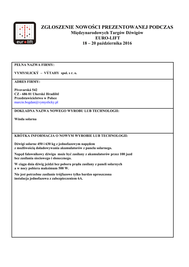 ZGŁOSZENIE NOWOŚCI PREZENTOWANEJ PODCZAS Międzynarodowych Targów Dźwigów EURO-LIFT 18 – 20 października 2016 PEŁNA NAZWA FIRMY: VYMYSLICKÝ – VÝTAHY spol. s r. o. ADRES FIRMY: Pivovarská 542 CZ - 686 01 Uherské Hradiště Przedstawicielstwo w Polsce [email protected] DOKŁADNA NAZWA NOWEGO WYROBU LUB TECHNOLOGII: Winda solarna KRÓTKA INFORMACJA O NOWYM WYROBIE LUB TECHNOLOGII: Dźwigi solarne 450 i 630 kg z jednofazowym napędem z możliwością doładowywania akumulatorów z panelu solarnego. Napęd falownikowy dźwigu może być zasilany z akumulatorów przez 100 jazd bez zasilania sieciowego i słonecznego. W ciągu dnia dźwig jeździ bez poboru prądu zasilany z paneli solarnych a w nocy pobiera maksimum 500 W. Nie jest potrzebne zasilanie trójfazowe tylko bardzo uproszczona instalacja jednofazowa z zabezpieczeniem 6A.