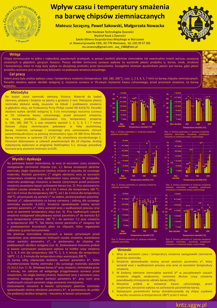 Wpływ czasu i temperatury smażenia na barwę chipsów ziemniaczanych Mateusz Szczęsny, Paweł Sakowski, Małgorzata Nowacka Koło Naukowe Technologów Żywności Wydział Nauk o Żywności Szkoła Główna Gospodarstwa Wiejskiego w Warszawie ul. Nowoursynowska 159c, 02-776 Warszawa, tel. (22) 59 37 182 [email protected] , [email protected] Wstęp Chipsy ziemniaczane to jedna z najbardziej popularnych przekąsek, w postaci cienkich plastrów ziemniaków lub ewentualnie innych warzyw, zazwyczaj smażonych w głębokim, gorącym tłuszczu. Proces obróbki termicznej surowca wpływa na wyróżniki jakości produktu tj. barwa, smak, struktura i konsystencja, które to mają duży wpływ na akceptację produktu przez konsumenta. Szczególnie istotnym wyróżnikiem jakości jest barwa, gdyż jakośd produktu oceniana jest w pierwszej kolejności na podstawie wrażenia wizualnego. Cel pracy Celem pracy była analiza wpływu czasu i temperatury smażenia (temperatura: 160, 180, 200 ⁰C, czas: 1, 2 3, 4, 5, 7 min) na barwę chipsów ziemniaczanych. Ponadto zbadano wpływ obróbki wstępnej tj. moczenia surowca w 1%-owym roztworze kwasu cytrynowego, przed procesem smażenia, na barwę produktu. Metodyka a 1 min 65 2 min 60 L* 1 min 65 b 60 c L* 160 180 Bez obróbki 200 Temperatura obróbki [oC] 12 g h g 3 min a* 2 c -4 -6 0 -2 a,b -8 c c 4 min a,b b a,b a,b a,b a 5 min a -6 7 min d 3 min -4 a d,e 2 min a* 2 d a,b 1 min 4 c 5 min 200 de 8 e,f d b,c 10 6 e 4 min 0 min 12 8 f,g 180 Rys. 2. Zmiany parametru L* podczas smażenia plastrów ziemniaka, wcześniej poddanych moczeniu w roztworze kwasu cytrynowego h 2 min 160 Temperatura obróbki [oC] 1 min 10 7 min -8 Bez obróbki 160 180 200 0 min 29 2 min 27 3 min 4 min 31 200 Temperatura obróbki [oC] 1 min 29 a,b 2 min 27 21 3 min b b b a,b b a a,b a,b a,b a,b a 4 min 19 5 min 17 5 min c 15 7 min 13 13 Bez obróbki 180 0 min 25 a,b b* 23 a a a,b 1 min d,e c,d,e 31 160 Rys. 4. Zmiany parametru a* podczas smażenia plastrów ziemniaka, wcześniej poddanych moczeniu w roztworze kwasu cytrynowego 33 d,e c,d,e c,d a,b a,b 33 Bez obróbki Temperatura obróbki [oC] Rys. 3. Zmiany parametru a* podczas smażenia plastrów ziemniaka 15 b,c 7 min 0 min 17 c b 40 Rys. 1. Zmiany parametru L* podczas smażenia plastrów ziemniaka 19 c 45 Bez obróbki 21 aa a 5 min 40 b* 23 a aa 4 min 7 min 25 a 50 45 -2 a 3 min 55 5 min 0 a 2 min 4 min 4 Na podstawie badao stwierdzono, że wraz ze wzrostem czasu smażenia następowało ciemnienie chipsów (rys. 1.). Barwa smażonych plastrów ziemniaka uległa statystycznie istotnej zmianie w stosunku do surowego materiału. Wartośd parametru L* ulegała obniżeniu wraz ze wzrostem temperatury smażenia oraz wydłużaniem czasu procesu. W przypadku materiału poddanego moczeniu w kwasie cytrynowym przed procesem smażenia zauważono lepsze zachowanie barwy (rys. 2). Przy zastosowaniu krótkich czasów smażenia, tj. od 3 do 5 minut dla temperatury 160 ⁰C, od 2 do 4 minut dla temperatury 180 ⁰C, od 1 do 3 minut dla temperatury 200 ⁰C, utrzymywała się wartośd L* na stałym, porównywalnym poziomie. Wartośd a*, odpowiedzialna za barwę czerwoną i zieloną, dla surowego ziemniaka wynosiła -4,3±0,5. Smażenie spowodowało istotny wzrost wartości parametru a*, który wzrastał wraz z wydłużaniem procesu oraz wraz ze wzrostem temperatury oleju (rys. 3). Przy najdłuższych czasach smażenia następował zdecydowany wzrost parametru a* do wartości 8,5 przy temperaturze smażenia 180 ⁰C i do wartości 7,2 przy smażeniu w temperaturze 200 ⁰C. Tak istotny wzrost parametru a* związany był z powstawaniem brunatnych plam na chipsach, które negatywnie odbierane są przez konsumentów. Dla plastrów ziemniaków moczonych w kwasie cytrynowym przed smażeniem, przy zastosowaniu krótszych czasów smażenia, stwierdzono niższe wartości parametru a*, w porównaniu do chipsów nie poddawanych obróbce wstępnej (rys. 4). Zastosowanie moczenia próbek w kwasie cytrynowym pozytywnie wpływa na krótkie czasy smażenia tj. 3, 4, 5 min dla temperatury 160 ⁰C; 2, 3, 4 minuty dla temperatury 180⁰C i 1, 2, 3 minuty dla temperatury oleju wynoszącej 200 ⁰C. Za barwę żółtą odpowiada dodatnia wartośd parametru b*, która charakteryzowała tkankę ziemniaka i dla surowego materiału wynosiła 21,3±2,5 (rys. 5 i 6). Składowa barwy b* przy smażeniu ziemniaków przez 1 minutę, nie zależnie od wstępnego przygotowania surowca przed smażeniem, nie uległa istotnej zmianie. Natomiast wraz z wzrostem czasu smażenia następuje wzrost wartości parametru b*, przy czym przy najdłuższych czasach parametr ulega ponownie zmniejszeniu. Zastosowanie moczenia w kwasie cytrynowym plastrów ziemniaka spowodowało istotne obniżenie parametru b*, w porównaniu do próbki nie poddanej obróbce wstępnej – moczeniu w kwasie cytrynowym. c a,b a,b b,c c,dd 50 6 Wyniki i dyskusja b,c a aa a,b a 3 min 55 0 min 70 d,e d,e e b,c,d Do badao użyto ziemniaki odmiany Victoria. Materiał do badao obierano, płukano i krojono na plastry o grubości 2 mm. Pokrojone plastry ziemniaka płukano wodą, osuszano na bibule i poddawano smażeniu w głębokim oleju, we frytkownicy firmy Philips model HD 6103/70. Ponadto zbadano wpływ obróbki wstępnej tj. 5-cio minutowego moczenia surowca w 1% roztworze kwasu cytrynowego, przed procesem smażenia, na barwę produktu. Zastosowano trzy temperatury smażenia tj. 160, 180, 200 ⁰C, a czas smażenia wynosił 1, 2, 3, 4, 5 i 7 minut. Gotowe chipsy ziemniaczane pakowano w folię aluminiową. Barwę materiału surowego i smażonego przy zastosowaniu różnych parametrów,określano za pomocą chromametru typu CR-300 firmy Minolta. Barwę mierzono w systemie CIE L*a*b* dla oświetlenia standardowego C. Oznaczeo dokonywano w czterech powtórzeniach dla 10 chipsów. Analizę statystyczną wykonano w programie StatGraphics 5.1, stosując procedurę Duncana przy poziomie istotności α=0,05. 0 min 70 160 180 200