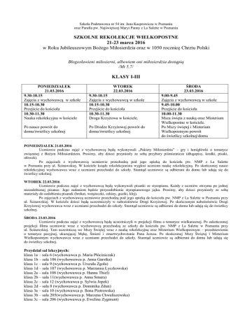 Szkoła Podstawowa nr 54 im. Jana Kasprowicza w Poznaniu oraz Parafia pw. Najświętszej Maryi Panny z La Salette w Poznaniu SZKOLNE REKOLEKCJE WIELKOPOSTNE 21-23 marca 2016 w Roku Jubileuszowym Bożego Miłosierdzia oraz w 1050 rocznicę Chrztu Polski Błogosławieni miłosierni, albowiem oni miłosierdzia dostąpią /Mt 5,7/ KLASY I-III PONIEDZIAŁEK 21.03.2016 9.30-10.15 Zajęcia z wychowawcą w szkole 10.15-10.30 Przejście do kościoła 10.30-11.30 Nauka rekolekcyjna w kościele WTOREK 22.03.2016 9.30-10.15 Zajęcia z wychowawcą w szkole 10.15-10.30 Przejście do kościoła 10.30-11.30 Droga Krzyżowa w kościele. Po nauce powrót do domu/świetlicy szkolnej Po Drodze Krzyżowej powrót do domu/świetlicy szkolnej ŚRODA 23.03.2016 9.00-9.45 Zajęcia z wychowawcą w szkole 9.45-10.00 Przejście do kościoła 10.00-11.30 Msza święta z nauką oraz Misterium Wielkopostne w kościele. Po Mszy świętej i Misterium Wielkopostnym powrót do świetlicy szkolnej/domu PONIEDZIAŁEK 21.03.2016 Uczniowie podczas zajęć z wychowawcą będą wykonywali „Pakiety Miłosierdzia” – gry i łamigłówki o tematyce związanej z Bożym Miłosierdziem. Prosimy, aby dzieci przyniosły ze sobą przybory piśmiennicze (długopisy, kredki, pisaki, ołówek). Po zajęciach z wychowawcą uczniowie przechodzą pod jego opieką do kościoła pw. NMP z La Salette w Poznaniu przy ul. Ścinawskiej. W kościele ksiądz rekolekcjonista wygłosi uczniom naukę rekolekcyjną. Po skończonej nauce rekolekcyjnej wychowawca wraz z uczniami przechodzi do szkoły. Stamtąd uczniowie są odbierani do domu lub udają się do świetlicy szkolnej. WTOREK 22.03.2016 Uczniowie podczas zajęć z wychowawcą będą wykonywali pisanki ze styropianu. Każdy z uczniów otrzyma po jednej nieozdobionej pisance. Jego zadaniem będzie przyozdobienie styropianowego jajka. Prosimy, aby dzieci przyniosły ze sobą materiały do ozdobienia pisanek (brokat, wstążeczki, cekiny, guziki, klej). Po zajęciach z wychowawcą uczniowie przechodzą pod jego opieką do kościoła pw. NMP z La Salette w Poznaniu przy ul. Ścinawskiej. W kościele dzieci będą uczestniczyły w nabożeństwie Drogi Krzyżowej. Po skończonym nabożeństwie Drogi Krzyżowej wychowawca wraz z uczniami przechodzi do szkoły. Stamtąd uczniowie są odbierani do domu lub udają się do świetlicy szkolnej. ŚRODA 23.03.2016 Uczniowie podczas zajęć z wychowawcą będą uczestniczyli w projekcji filmu o tematyce wielkanocnej. Po zakończonej projekcji filmu uczniowie wraz z wychowawcą przechodzą ze szkoły do kościoła pw. NMP z La Salette w Poznaniu przy ul. Ścinawskiej. Tam uczestniczą we Mszy Świętej wraz z nauką rekolekcyjną oraz Misterium Wielkopostnym – przedstawieniu o tematyce pasyjnej, ukazującej Mękę, Śmierć i zmartwychwstanie Pana Jezusa. Po skończonej Mszy Świętej i Misterium Wielkopostnym wychowawca wraz z uczniami przechodzi do szkoły. Stamtąd uczniowie są odbierani do domu lub udają się do świetlicy szkolnej. Przydział sal lekcyjnych: klasa 1a – sala 6 (wychowawca p. Maria Płóciniczak) klasa 1b – sala 106 (wychowawca p. Anna Garstka) klasa 1c – sala 9 (wychowawca p. Urszula Zgoła) klasa 1d – sala 107 (wychowawca p. Marzanna Łyczkowska) klasa 2a – sala 108 (wychowawca p. Hanna Thiel) klasa 2b – sala 11(wychowawca p. Anna Smura) klasa 2c – sala 12 (wychowawca p. Sylwia Jopek) klasa 2d – sala 8 (wychowawca p. Dominika Zdun) klasa 3a – sala 10 (wychowawca p. Ilona Piotrowska) klasa 3b – sala 205(wychowawca p. Marzena Chwaliszewska) klasa 3c – sala 206 (wychowawca p. Ewelina Zygmunt) Szkoła Podstawowa nr 54 im. Jana Kasprowicza w Poznaniu oraz Parafia pw. Najświętszej Maryi Panny z La Salette w Poznaniu SZKOLNE REKOLEKCJE WIELKOPOSTNE 21-23 marca 2016 w Roku Jubileuszowym Bożego Miłosierdzia oraz w 1050 rocznicę Chrztu Polski Błogosławieni miłosierni, albowiem oni miłosierdzia dostąpią /Mt 5,7/ KLASY IV-VI PONIEDZIAŁEK 21.03.2016 10.30-11.15 Zajęcia z wychowawcą w szkole WTOREK 22.03.2016 10.30-11.15 Zajęcia z wychowawcą w szkole 11.15-11.30 Przejście do kościoła 11.30-12.30 nauka rekolekcyjna w kościele 11.15-11.30 przejście do kościoła 11.30-12.30 Droga Krzyżowa w kościele Po nauce powrót do domu/świetlicy szkolnej Po Drodze Krzyżowej do domu/świetlicy szkolnej ŚRODA 23.03.2016 9.00-9.45 Zajęcia z wychowawcą w szkole 9.45-10.00 Przejście do kościoła 10.00-11.30 Msza święta z nauką oraz Misterium Wielkopostne w kościele. Po Mszy świętej i Misterium Wielkopostnym powrót do świetlicy szkolnej/domu. PONIEDZIAŁEK 21.03.2016 Uczniowie podczas zajęć z wychowawcą będą wykonywali „Pakiety Miłosierdzia” – gry i łamigłówki o tematyce związanej z Bożym Miłosierdziem. Prosimy, aby dzieci przyniosły ze sobą przybory piśmiennicze (długopisy, kredki, pisaki, ołówek). Po zajęciach z wychowawcą uczniowie przechodzą pod jego opieką do kościoła pw. NMP z La Salette w Poznaniu przy ul. Ścinawskiej. W kościele ksiądz rekolekcjonista wygłosi uczniom naukę rekolekcyjną. Po skończonej nauce rekolekcyjnej wychowawca wraz z uczniami przechodzi do szkoły. Stamtąd uczniowie są odbierani do domu lub udają się do świetlicy szkolnej. WTOREK 22.03.2016 Uczniowie podczas zajęć z wychowawcą będą wykonywali obrazy „Jezu, ufam Tobie”. Każdy z uczniów otrzyma fragment obrazu „Jezu, ufam Tobie” – jego zadaniem będzie domalowanie pozostałej części obrazu. Prosimy, aby dzieci przyniosły ze sobą materiały do malowania obrazu (farby, pędzelki, kubeczki do wody, podkładki). Po zajęciach z wychowawcą uczniowie przechodzą pod jego opieką do kościoła pw. NMP z La Salette w Poznaniu przy ul. Ścinawskiej. W kościele dzieci będą uczestniczyły w nabożeństwie Drogi Krzyżowej; będzie też możliwość skorzystania z sakramentu spowiedzi świętej. Po skończonym nabożeństwie Drogi Krzyżowej wychowawca wraz z uczniami przech