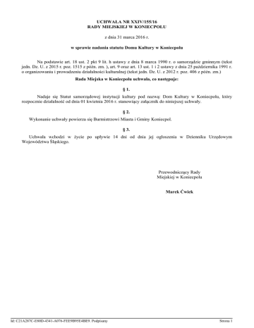 UCHWAŁA NR XXIV/155/16 RADY MIEJSKIEJ W KONIECPOLU z dnia 31 marca 2016 r. w sprawie nadania statutu Domu Kultury w Koniecpolu Na podstawie art. 18 ust. 2 pkt 9 lit. h ustawy z dnia 8 marca 1990 r. o samorządzie gminnym (tekst jedn. Dz. U. z 2015 r. poz. 1515 z późn. zm. ), art. 9 oraz art. 13 ust. 1 i 2 ustawy z dnia 25 października 1991 r. o organizowaniu i prowadzeniu działalności kulturalnej (tekst jedn. Dz. U. z 2012 r. poz. 406 z późn. zm.) Rada Miejska w Koniecpolu uchwala, co następuje: § 1. Nadaje się Statut samorządowej instytucji kultury pod nazwą: Dom Kultury w Koniecpolu, który rozpocznie działalność od dnia 01 kwietnia 2016 r. stanowiący załącznik do niniejszej uchwały. § 2. Wykonanie uchwały powierza się Burmistrzowi Miasta i Gminy Koniecpol. § 3. Uchwała wchodzi w życie po upływie 14 dni od dnia jej ogłoszenia w Dzienniku Urzędowym Województwa Śląskiego. Przewodniczący Rady Miejskiej w Koniecpolu Marek Ćwiek Id: C21A287C-E80D-4341-A076-FEE9B95E4BE9. Podpisany Strona 1 Załącznik do uchwały Nr XXIV/155/16 Rady Miejskiej w Koniecpolu z dnia 31 marca 2016 roku Statut Domu Kultury w Koniecpolu Rozdział I Postanowienia ogólne §1 Dom Kultury w Koniecpolu jest samorządową instytucją powołaną uchwałą Rady Miejskiej. §2 Dom Kultury działa na podstawie: 1. Ustawy z dnia 25 października 1991 r. o organizowaniu i prowadzeniu działalności kulturalnej tj. Dz. U. z 2012 r. poz. 406 z późn. zm. 2. Ustawy z dnia 27 czerwca 1997 r. o bibliotekach tj. Dz. U. z 2013 r. poz. 829. 3. Niniejszego statutu. §3 W skład Domu Kultury wchodzą: a) Ośrodek Kultury, b) Biblioteka Publiczna Miasta i Gminy w Koniecpolu §4 1. Siedziba i działalność Domu Kultury mieści się w obiektach pod adresem: Koniecpol: ul. Mickiewicza 28, pomieszczenia przy Hali Sportowej ul. Szkolna 17 oraz pomieszczenia przy ul. Chrząstowskiej 6A. 2. Dom Kultury używa pieczęci podłużnej z nazwą w pełnym brzmieniu i adresem siedziby tj. Dom Kultury w Koniecpolu, ul. Chrząstowska 6 A, 42-230 Koniecpol. 3. Terenem działania Domu Kultury jest obszar miasta i gminy Koniecpol. 4. Dom Kultury może także w ramach współpracy i wymiany z innymi podmiotami prowadzić swoją działalność na terenie Rzeczypospolitej Polskiej oraz poza jej granicami. 5. Organizatorem Domu Kultury jest Gmina Koniecpol. 1 Id: C21A287C-E80D-4341-A076-FEE9B95E4BE9. Podpisany Strona 1 §5 Dom Kultury jest wpisany do rejestru instytucji kultury prowadzonego przez organizatora i posiada osobowość prawną. Rozdział II Cele i zadania Domu Kultury §6 Celem Domu Kultury jest ochrona dóbr kultury, a w szczególności: a) prowadzenie wielofunkcyjnej działalności rozwijającej i zaspokajającej potrzeby kulturalne, oświatowe i informacyjne mieszkańców; b) upowszechnianie, promocja kultury i turystyki w miejscu działania, w kraju i zagranicą. d) zaspokajanie potrzeb czytelniczych, oświatowych, kulturalnych i informacyjnych mieszkańców Koniecpola i gminy; §7 Przedmiotem działalności Domu Kultury w Koniecpolu jest: 1. Prowadzenie działalności społeczno-kulturalnej, 2. Upowszechnianie sztuki oraz wspieranie aktywności społeczności lokalnej, 3. Pozyskiwanie i przygotowanie społeczeństwa do aktywnego uczestnictwa w kulturze oraz współtworzenie jej wartości, 4. Zaspokajanie i rozwijanie potrzeb oświatowych, kulturalnych i informacyjnych ogółu społeczeństwa, 5. Współpraca ze szkołami, instytucjami i organizacjami społecznymi w zakresie upowszechniania kultury. 6. Prowadzenie dokumentacji życia kulturalnego miasta i gminy. 7. Realizacja zadań w dziedzinie kultury wynikających ze współpracy kulturalnej z miastami partnerskimi z kraju i zagranicy. 8. Współpraca z Kołami Gospodyń Wiejskich z terenu gminy. §8 Do podstawowych zadań istniejącej w strukturze Domu Kultury Biblioteki Miasta i Gminy w Koniecpolu należy: 2 Id: C21A287C-E80D-4341-A076-FEE9B95E4BE9. Podpisany Strona 2 1. Gromadzenie, opracowywanie, przechowywanie i konserwacja zbiorów bibliotecznych, w tym materiałów dotyczących własnego regionu. 2. Udostępnianie zbiorów bibliotecznych na zewnątrz i na miejscu oraz prowadzenie wypożyczeń międzybibliotecznych. 3. Czynne wykorzystanie możliwości obsługi grup specjalnych (w tym osób niepełnosprawnych) poprzez dostarczanie i odbieranie książek w miejscu zamieszkania. 4. Prowadzenie działalności informacyjno-bibliograficznej i dokumentacyjnej ze szczególnym uwzględnieniem własnego regionu. 5. Popularyzacja książki i czytelnictwa, zwłaszcza w zakresie prowadzenia zajęć dla dzieci i młodzieży, udzielanie doradztwa czytelniczego oraz organizowanie spotkań dyskusyjnych o książce. 6. Upowszechnianie dostępu do technologii informacyjnych, w tym prowadzenie spotkań i szkoleń dla osób zagrożonych wykluczeniem cyfrowym. 7. Współdziałanie z bibliotekami innych sieci, instytucjami upowszechniania kultury, organizacjami i towarzystwami w rozwijaniu i zaspokajaniu potrzeb oświatowych i kulturalnych społeczeństwa. 8. Doskonalenie form i metod pracy bibliotecznej. Rozdział III Zarządzanie i organizacja §9 1. Dyrektor Domu Kultury powoływany jest przez Burmistrza Koniecpola, zarządza instytucją i reprezentuje ją na zewnątrz. 2. Dyrektor jest pracodawcą w rozumieniu Kodeksu Pracy. 3. Dyrektora powołuje się na okres 5-letniej kadencji. 4. Powołanie Dyrektora może być poprzedzone wyłonieniem kandydata w drodze konkursu ogłoszonego przez Burmistrza Koniecpola. 5. Po upływie kadencji, o której mowa w ust. 3, Burmistrz może przedłużyć zatrudnienie Dyrektora na okres nie dłuższy niż 2 lata po uzyskaniu pozytywnej opinii Rady Miejskiej. 6. Odpowiedzialność za organizacyjno-kadrowe funkcjonowanie Biblioteki Miasta i Gminy w Koniecpolu ponosi jej Kierownik, którego zatrudnia Dyrektor Domu Kultury w porozumieniu z Burmistrzem Koniecpola. 7. Organizację wewnętrzną Domu Kultury określa Regulamin Organizacyjny wy