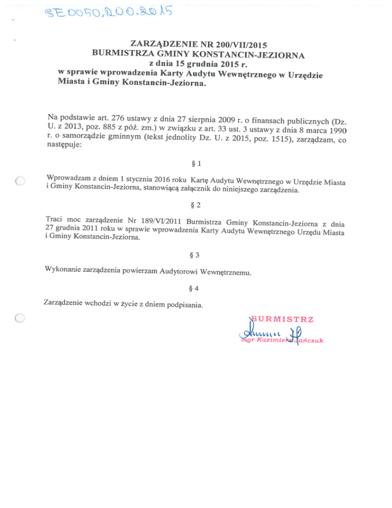 ZARZĄDZENIE NR 200/VII/2015 BURMISTRZA GMINY KONSTANCIN-JEZIORNA z dnia 15 grudnia 2015 r. w sprawie wprowadzenia Karty Audytu Wewnętrznego w Urzę dzie Miasta i Gminy Konstancin-Jeziorna. Na podstawie art. 276 ustawy z dnia 27 sierpnia 2009 r. o finan sach publicznych (Dz. U. z 2013, poz. 885 z póź. zm.) w związku z art. 33 ust. 3 ustawy z dnia 8 marca 1990 r. o samorządzie gminnym (tekst jednolity Dz. U. z 2015, poz. 1515), zarządzam, co następuje: *1 Wprowadzam z dniem 1 stycznia 2016 roku Kartę Audytu Wewn ętrznego w Urzędzie Miasta i Gminy Konstancin-Jeziorna, stanowiącą załącznik do niniej szego zarządzenia. *2 Traci moc zarządzenie Nr 189/VI/2011 Burmistrza Gminy Konstancin-Jeziorna z dnia 27 grudnia 2011 roku w sprawie wprowadzenia Karty Audytu Wewnętrznego Urzędu Miasta i Gminy Konstancin-Jeziorna. Wykonanie zarządzenia powierzam Audytorowi Wewnętrznem u. Zarządzenie wchodzi w życie z dniem podpisania. C URMISTRZ x: anczuk Uzasadnienie do zarządzenia NR 200/VII/2015 Burmistrza Gminy Konstancin Jeziorna z dnia 15 grudnia 2015 roku w sprawie wprowadzenia Karty Audytu Wewnętrznego w Urzędzie Miasta i Gminy Konstancin Jeziorna. Konieczność dokonania zmian w zasadach funkcjonowania audytu w Urzędzie Miasta i Gminy Konstancin-Jeziorna oraz jednostkach organizacyjnych Gminy wynika ze zmian w zasadach obowiązujących audytora wewnętrznego w prowadzeniu audytu wewnętrznego. RURMISTRZ C Załącznik do Zarządzenia nr 200/VH/2015 Burmistrza Gminy Konstancin-Jeziorna z dnia 15.12.2015 r. KARTA AUDYTU WEWNĘTRZNEGOW URZĘDZIE MIASTA I GMINY KONSTANCIN-JEZIORNA 1. Definicje i pojęcia zawarte w karcie audytu wewnętrznego 1. Gmina rozumie się przez to Gminę Konstancin-Jeziorna jako jednostkę samorządu terytorialnego. 2. Urząd — — rozumie się przez to Urząd Miasta i Gminy Konstancin-Jeziorna. 3. Burmistrz rozumie się przez to Burmistrza Gminy Konstancin-Jeziorna, który w związku z art. 276 ustawy o finansach publicznych wykonuje zadania związane audyte z m wewnętrznym przypisane kierownikowi jednostki. 4. Audytor rozumie się przez to audytora wewnętrznego zatrudnionego w Urzędz ie. 5. Komórka organizacyjna rozumie się przez to wydziały i inne równorzędne komórki organizacyjne Urzędu. — — 6. Jednostka organizacyjna rozumie się przez to jednostkę organizacyjną Gminy Konstancin-Jeziorna, w tym instytucje kultury i samodzielny publiczny zakład opieki zdrowotnej. 7. Komórka audytowana — rozumie się przez to zarówno komórkę organizacyjną Urzędu, jak i jednostkę organizacyjną Gminy, w której prowadzony jest audyt wewnętrzny. — 8. Kierownik komórki audytowanej rozumie się przez to osobę kierującą komórką audytowaną lub wykonującą jej obowiązki. 9. Obszar audytu rozumie się przez to sferę działalności Gminy w obrębi e, której audytor wyodrębnił obszary ryzyka do przeprowadzenia zadania audytowego. 10. Zadanie zapewniające rozumie się przez to zespół działań podejmowanych w celu dostarczenia niezależnej i obiektywnej oceny, o której mowa w art. 272 ustawy. 11. Czynności doradcze rozumie się przez to inne działania niż czynno ści zapewniające, podejmowane przez audytora, których charakter i zakres jest uzgodniony z Burmistrzem, a których celem jest zwłaszcza usprawnienie funkcjonowania Gminy. — — — — 12. Plan audytu wewnętrznego — rozumie się przez to roczny plan audytu wewnętrznego. 13. Ustawa rozumie się przez to ustawę z dnia 27 sierpnia 2009 roku o finansach publicznych (Dz. U. z 2013 roku, poz. 885 z póż. zm.). — 14. Rozporządzenie rozumie się przez to rozporządzenie Ministra Finansów z dnia 4 września 2015 roku w sprawie audytu wewnętrznego oraz informacji o pracy i wynikach tego audytu (Dz. U. poz. 1480). — 15. Standardy audytu wewnętrznego — rozumie się przez to Międzynarodowe Standardy Praktyki Zawodowej Audytu Wewnętrznego określone w komunikacie Nr 2 Ministra Finansów z dnia 17 czerwca 2013 r. w sprawie standardów audytu wewnętrznego dla jednostek sektora finansów publicznych (Dz. Urz. M F poz. 15). 2. Cel dokumentu Karta Audytu Wewnętrznego zostaje wprowadzona w celu: 1) uregulowania zasad funkcjonowania auclytu w Gminie. 2) uregulowania podstaw funkcjonowania audytora wewnętrznego zatrudnionego w Urzędzie. 3) uregulowania praw i obowiązków audytora. 4) uregulowania praw i obowiązków audytowanych. 3. Zasięg działania audytora Audytor przeprowadza audyt wewnętrzny w: 1) Urzędzie 2) jednostkach organizacyjnych Gminy 4. Cele audytu wewnętrznego Ogólnym celem audytu wewnętrznego jest przysporzenie wartoś ci i usprawnienie działalności operacyjnej Gminy. Audyt wewnętrzny polega na systematycznej i dokonywanej w uporządkowany sposób ocenie procesów: 1) zarządzania ryzykiem; 2) kontroli; 3) ładu organizacyjnego, przyczyniając się do poprawy ich działania, oraz procesów działających w komórkachljednostkach organizacyjnych. 5. Ogólne zasady audytu wewnętrznego 1. Audyt wewnętrzny obejmuje czynności o charakterze zapewniającym oraz doradczym. 2. Działanie o charakterze zapewniającym- jest to zespół działań pode jmowanych w celu dostarczenia niezależnej i obiektywnej oceny dotyczącej adek watności, skuteczności i efektywności kontroli zarządczej. za którą odpowiada Burm istrz. 3. Działania o charakterze doradczym - to działania podejmowane przez audytora, których charakter i zakres jest uzgodniony z Burmistrzem, z zastrzeżeniem, że audytor nie przejmuje na siebie zadań lub uprawnień wcho dzących w zakres zarządzania w Urzędzie i jednostkach organizacyjnych Gminy, Są to inre czynności niż zadania zapewniające. 6. Prawa i obowiązki audytora wewnętrznego 1. Audytor ma prawo dostępu do wszelkich dokumentów, z zachowaniem przepisów o ochronie informacji niejawnych, do wszystkich prac owników oraz wszelkich innych źródeł informacji potrzebnych do przeprowadze nia audytu wewnętrznego, z