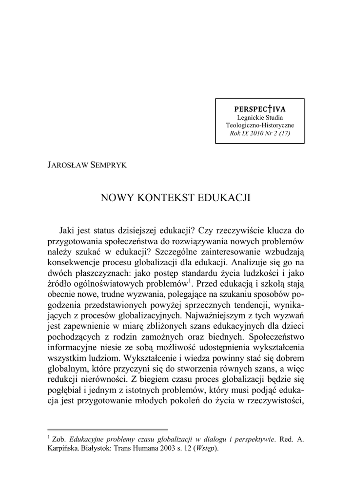 PERSPEC † IVA Legnickie Studia Teologiczno-Historyczne Rok IX 2010 Nr 2 (17) JAROSŁAW SEMPRYK NOWY KONTEKST EDUKACJI Jaki jest status dzisiejszej edukacji? Czy rzeczywiście klucza do przygotowania społeczeństwa do rozwiązywania nowych problemów należy szukać w edukacji? Szczególne zainteresowanie wzbudzają konsekwencje procesu globalizacji dla edukacji. Analizuje się go na dwóch płaszczyznach: jako postęp standardu życia ludzkości i jako źródło ogólnoświatowych problemów1. Przed edukacją i szkołą stają obecnie nowe, trudne wyzwania, polegające na szukaniu sposobów pogodzenia przedstawionych powyżej sprzecznych tendencji, wynikających z procesów globalizacyjnych. Najważniejszym z tych wyzwań jest zapewnienie w miarę zbliżonych szans edukacyjnych dla dzieci pochodzących z rodzin zamożnych oraz biednych. Społeczeństwo informacyjne niesie ze sobą możliwość udostępnienia wykształcenia wszystkim ludziom. Wykształcenie i wiedza powinny stać się dobrem globalnym, które przyczyni się do stworzenia równych szans, a więc redukcji nierówności. Z biegiem czasu proces globalizacji będzie się pogłębiał i jednym z istotnych problemów, który musi podjąć edukacja jest przygotowanie młodych pokoleń do życia w rzeczywistości, 1 Zob. Edukacyjne problemy czasu globalizacji w dialogu i perspektywie. Red. A. Karpińska. Białystok: Trans Humana 2003 s. 12 (Wstęp). 158 JAROSŁAW SEMPRYK która w wielu kwestiach w zasadniczy sposób będzie odbiegać od obecnej2. W klimacie niepokoju i troski o przyszłość świata wszyscy zwracają się ku edukacji, która może odegrać szczególną rolę w minimalizowaniu ujemnych skutków procesu globalizacji. Przed jakimi wyzwaniami stoi obecnie edukacja? Są to między innymi: – rozwarstwianie się przestrzeni społecznej szkoły, – przezwyciężanie napięć związanych z ambiwalencją procesów towarzyszących globalizacji, – zapobieganie wykluczeniom społecznym i kulturowym, – skuteczne przeciwdziałanie rozpadowi tradycyjnych norm i wzorów ludzkiego działania oraz systemów wartości, narastającej fali prymitywnych standardów kultury masowej i postaw konsumpcyjnych, wreszcie walka z dehumanizacją człowieka, – stworzenie nowego modelu szkoły, reprezentującego wartości i ideały społeczeństwa informacyjnego, opartego na wiedzy i oświacie, – przeciwdziałanie syndromowi wirtualizacji, – ukształtowanie nowego modelu człowieka, który potrafi kreować warunki dla działania i współżycia w ramach różnych społeczności3. Jeśli chodzi o pierwsze z tych wyzwań, jest to rozszerzanie się zjawiska tzw. apartheidu szkolnego, które polega na umacnianiu rozmiarów wykluczenia społecznego, o czym świadczy fakt, że 20-30% uczniów nie ma dostępu do szkolnictwa, zaś edukację poddaje się logice, która zachęca uprzywilejowane klasy do izolowania swoich dzieci w dobrych szkołach oraz do globalizacji ich szans życiowych poprzez ponadnarodowe kariery szkolne i uniwersyteckie. Głównym celem edukacji XXI w. powinno być przywrócenie człowiekowi możliwości decydowania o swoim losie, a także wyzwolenie go z ograniczeń wszędzie tam, gdzie jest to możliwe. W tym celu powinniśmy promować edukację dla wszystkich, pluralistyczną, obywatelską. W obszarze zaś wychowania powinniśmy uczyć dzieci zasady: najpierw być, a dopiero potem – mieć4. 2 A. ZAJĄC. Globalne procesy zmieniające świat wyzwaniem dla pedagogiki i edukacji. W: Edukacyjne problemy czasu globalizacji. s. 59. 3 A. BOGAJ. Konsekwencje procesu globalizacji dla edukacji. W: Edukacyjne problemy czasu globalizacji. s. 44. 4 Tamże. s. 45. Nowy kontekst edukacji 159 Dokonująca się obecnie rewolucja informatyczna (wprowadzanie nowych technik i technologii informatycznych do wszystkich dziedzin życia) przekształca społeczeństwo i prowadzi do globalizacji kolejnych obszarów naszego życia5. Z. Kwieciński w rozprawie pt. Przyszłość edukacji w świecie bez przyszłości stwierdza, że na progu nowego tysiąclecia świat stoi przed groźbą końca historii, końca geografii, końca tożsamości, końca człowieczeństwa i końca własnego istnienia6. Koniec historii to analogia do słów F. Fukuyamy oznaczających brak alternatywy dla globalnego rynku, poszerzającą się sferę ubóstwa i wykluczenia, bezrobocia, pogłębiające się różnice położenia społecznego. Koniec geografii to zanikanie granic państw dla ekonomii, kultury, terroryzmu, AIDS itd. Koniec tożsamości sugeruje, że nie możemy być tacy sami przez całe życie, nie możemy z różnych powodów w pełni sterować swoim losem. Koniec człowieczeństwa oznacza dla Z. Kwiecińskiego zatratę zdolności współodczuwania odpowiedzialności za przyszłość7. 1. RÓWNOŚĆ SZANS MŁODZIEŻY Jedną z priorytetowych strategii w edukacji dla przyszłości jest równość szans młodzieży z różnych środowisk społecznych. W zróżnicowanym świecie wykształcenie uznawane jest za wartość szczególnie cenną. Jednak nabywanie wiedzy nie zależy tylko od dobrych chęci uczącego się. Olbrzymią rolę w kształtowaniu nierówności szans edukacyjnych mają oddziaływania społeczne oraz to, co dzieje się w samej oświacie. Procesy różnicowania się dróg szkolnych i szans edukacyjnych nazywane są obecnie selekcją szkolną8. 5 M. BOGAJ. Szkoła XXI wieku – wybrane idee i strategie edukacji dla przyszłości. W: Edukacyjne problemy czasu globalizacji. s. 100. 6 Z. KWIECIŃSKI. Przyszłość edukacji w świecie bez przyszłości. Ratujmy naszą młodzież! W: Przetrwanie i rozwój jako niezbywalne powinności wychowania. Red. M. Dziemianowicz, B. Gołębniak i R. Kwaśnica. Wrocław: Wyd. Nauk DSWE 2006 s. 15-18. 7 BOGAJ. Szkoła XXI wieku. s. 101. 8 M.J. SZYMAŃSKI. Studia i szkice z socjologii edukacji. Warszawa: Wyd. IBE 2000 s. 101. 160 JAROSŁAW SEMPRYK Do najbardziej znanych definicji selekcji szkolnej należy definicj
