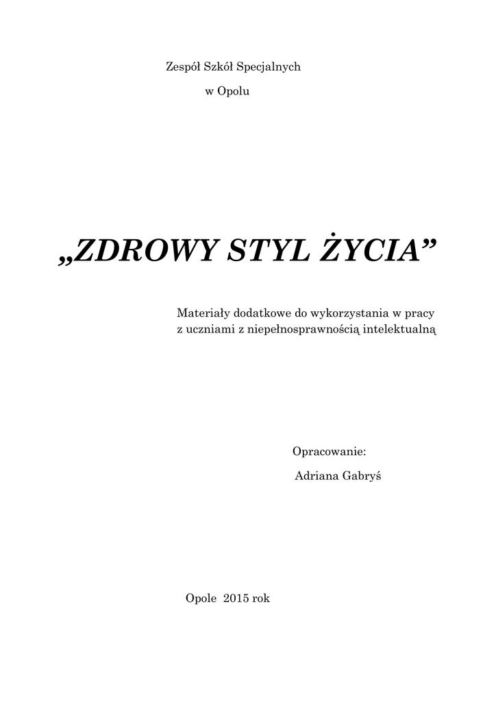 Zespół Szkół Specjalnych w Opolu „ZDROWY STYL ŻYCIA” Materiały dodatkowe do wykorzystania w pracy z uczniami z niepełnosprawnością intelektualną Opracowanie: Adriana Gabryś Opole 2015 rok PROPOZYCJE TEMATYCZNE: Odżywiam się zdrowo - jem kolorowo. Zdrowe śniadanie na dobry początek dnia. Warsztaty dla dzieci klas Szkoły Podstawowej „Jem zdrowo”. „Tęczowy Tydzień”- tygodniowa akcja polegająca na spożywaniu codziennie porcji warzyw i owoców w wybranym kolorze. Kąciki warzywno- owocowe- ekspozycja świeżych warzyw i owoców. Wartości odżywcze. Wykonanie sałatek, surówek, zdrowych kanapek-degustacja. Dzień z jogurtem, kefirem - dla odporności i zdrowych kości. Szkolna akcja „Jesień i zima z witaminami”(codzienne spożywanie owoców, warzyw do II śniadania) Ćwiczenia ruchowe na świeżym powietrzu. Program edukacyjny dla rodziców. Co wiem o zdrowym stylu życia? Chcesz być zdrowy nie stroń od wody. Prezentacja „Zalety picia wody” dla klas I-VI. Popularyzacja picia wody niegazowanej wśród uczniów, pracowników i rodziców. Konkurs produkty zdrowe i niezdrowe. Zagadki owocowo-warzywne. „Woda dla każdego”- pogadanka z wychowawcą w klasie. Wykonanie prac plastycznych na temat : „Kraina owoców i warzyw”. Zasady zdrowego odżywiania się. Planowanie jadłospisu. Przygotowanie sałatki owocowej. Wartości odżywcze owoców. Przygotowanie soku owocowego, koktajlu owocowego. Każdy uczeń dobrze wie jak odżywiać zdrowo się. Znaczenie mleka i jego przetworów w diecie człowieka. Jakie zagrożenia powoduje palenie papierosów i picie alkoholu? Wykonanie plakatów. Wartości odżywcze warzyw. Przygotowanie sałatki warzywnej, dekorowanie potraw. Wypoczynek czynny –jak spędzać czas wolny? Jesienne kolory. Zimowe przetwory. Co to są witaminy? „W krainie czystości”-dbamy o codzienną higienę ciała. „Czyste ręce-zdrowia więcej”. Dbamy o zęby i poznajemy zawód stomatologa. Dlaczego należy dbać o higienę? Zioła w naszym domu, znaczenie ziół, degustacja herbat ziołowych. Dbamy o swoje zdrowie – spotkanie z panią pielęgniarką. „Zdrowie to największy skarb”-uczymy się o nie troszczyć. Ruch receptą na zdrowie. „W zdrowym ciele, zdrowy duch” Myję się bo chcę być zdrowy. Co to są bakterie i wirusy? Dlaczego mam katar i boli mnie gardło? WIERSZE I RYMOWANKI: Umyj ręce przed jedzeniem, Wychodź na dwór, dbaj o siebie”. „Gimnastykuj się codziennie, Bo to zdrowo i przyjemnie”. „Rób przysiady, ćwicz podskoki, Będziesz chudy i wysoki”. Na zdrówko Na zdrówko dobra to rada - dużo owoców zajadaj! W owocach są witaminki - są to zdrowia okruszynki. Pamiętaj łakomczuszku Pamiętaj dziś łakomczuszku o malutkim swoim brzuszku, bo lubi czasem ten brzuszek zjeść także trochę jabłuszek. Warzywa jedz od dziś Chcesz być zwinny jak wiewiórka? Chcesz być szybki jak zajączek? Chcesz być silny tak jak miś? Więc warzywa jedz od dziś! Kto chce Kto chce małym być siłaczem, zjada wszystko i nie płacze! Kto się długo bawić chce - ten śniadanie pięknie zje. Kto chce posiąść siłę lwa, ten obiadek je raz dwa. A kto zje też podwieczorek ten wspaniały ma humorek. Mniam mniam Mniam mniam mniam owoce zjadam, bo za nimi wprost przepadam. Już śliweczki i jabłuszka lecą wprost do mego brzuszka. Suróweczka Do ziemniaków suróweczka to jest pomysł doskonały, bo dodaje moc zdróweczka oraz uśmiech na dzień cały. Kotlecik Ten, kto mięska nie chce jeść, będzie słaby no i cześć. Dziś kotlecik chętnie zjem Bo jest zdrowy – ja to wiem! Zupka jarzynowa Por, marchewka i pietruszka już wskoczyły do garnuszka. Jeszcze seler i ziemniaczki i fasolka i buraczki. Szybko zupka jest gotowa - jarzynowa, bardzo zdrowa! Jedz owoce i jarzyny, w nich mieszkają witaminy. Kto je sobie lekceważy – musi chodzić do lekarzy. Lubię biegać, lubię skakać. Lubię kąpać się i chlapać. Jeżdżę także na rowerze . Rolkach, wrotkach i skuterze. Ruch to zdrowie mówię Wam . Uśmiech wciąż na twarzy mam. Dla każdej dziewczynki i każdego chłopczyka, ważna dla zdrowia jest gimnastyka. Kto o zdrowie swoje dba ćwiczy co dzień hop -sa -sa. Każde dziecko ci to powie, ruch i czystość, odpoczynek. Jabłko, jogurt, moc jarzynek, rolki, sanki, narty, mróz. Dbaj o zdrowie swe i już! „Na paluszki się wspinamy W górę rączki wyciągamy Do podłogi dotykamy I ze sobą się witamy. Dzień dobry.” Nie pal tytoniu, wdychaj tlen świeży, myśl o swym zdrowiu, droga młodzieży! Jak być zdrowym ? Prosta sprawa Ruch to zdrowia jest podstawa Więc od dzisiaj przyjaciele Zdrowy duch w zdrowym ciele. WIERSZ DO ĆWICZEŃ LODOPEDYCZNYCH "KRAN" W.Chotomska Myła ręce jakaś gapa, kap, kap, kap. Poszła, a kran dalej kapał, kap, kap, kap. Wczoraj kapał i dziś kapie: kap, kap, kap. I źle myśli o tej gapie, kap, kap, kap! To przez gapę kran ma katar, kap, kap, kap. Taki katar to jest strata! Kap, kap, kap. Bo te krople- to są grosze, kap, kap, kap. Grosz za groszem z wodą poszedł, kap, kap, kap. Co tu robić? Gapa nie wie, kap, kap, kap. A więc my powiemy gapie: “Dokręć kran!” O, już nie kapie! „Czystość” I. Salach Kto o zdrowie własne dba Czyste ręce zawsze ma. Myje zęby, uszy, szyję Włosy dobrze też umyje. Czyste nogi, czyste ręce To uciecha jest w łazience! Aby zawsze czystym być Musisz się dokładnie myć „Witaminowe abecadło”- S. Karaszewski Oczy, gardło, włosy, kości zdrowe są, gdy A w nich gości. A – w marchewce, pomidorze, w maśle, mleku też być może. B – bądź bystry, zwinny, żwawy do nauki i zabawy. W drożdżach, ziarnach i orzeszkach, w serach, jajkach B też mieszka. Naturalne witaminy lubią chłopcy i dziewczyny, bo najlepsze witaminy to owoce i jarzyny. C – to coś na przeziębienie i na lepsze ran gojenie. C – porzeczka i cytryna, świeży owoc i jarzyna. Zęby, kości lepiej rosną, kiedy D dostaniesz wiosną