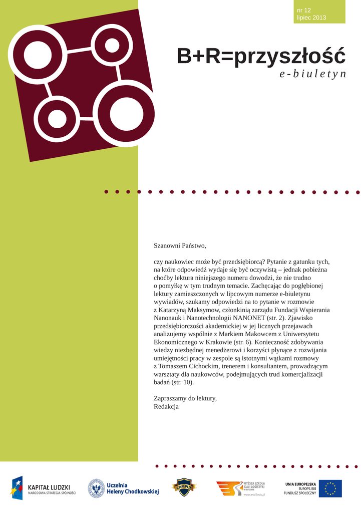 nr 12 lipiec 2013 B+R=przyszłość e-biuletyn Szanowni Państwo, czy naukowiec może być przedsiębiorcą? Pytanie z gatunku tych, na które odpowiedź wydaje się być oczywistą – jednak pobieżna choćby lektura niniejszego numeru dowodzi, że nie trudno o pomyłkę w tym trudnym temacie. Zachęcając do pogłębionej lektury zamieszczonych w lipcowym numerze e-biuletynu wywiadów, szukamy odpowiedzi na to pytanie w rozmowie z Katarzyną Maksymow, członkinią zarządu Fundacji Wspierania Nanonauk i Nanotechnologii NANONET (str. 2). Zjawisko przedsiębiorczości akademickiej w jej licznych przejawach analizujemy wspólnie z Markiem Makowcem z Uniwersytetu Ekonomicznego w Krakowie (str. 6). Konieczność zdobywania wiedzy niezbędnej menedżerowi i korzyści płynące z rozwijania umiejętności pracy w zespole są istotnymi wątkami rozmowy z Tomaszem Cichockim, trenerem i konsultantem, prowadzącym warsztaty dla naukowców, podejmujących trud komercjalizacji badań (str. 10). Zapraszamy do lektury, Redakcja 3 2 czy naukowiec może być przedsiębiorcą? O działalności Fundacji NANONET, polskim potencjale w dziedzinie nanotechnologii, innowacyjności, wyzwaniach współpracy nauki i biznesu i specyfice kontaktu badacza z przedsiębiorcą rozmawiamy z Katarzyną Maksymow, brokerem technologii, członkinią zarządu Fundacji Wspierania Nanonauk i Nanotechnologii NANONET. Na czym polega działalność brokera technologii? Z czego wynika konieczność powoływania wyspecjalizowanych podmiotów, których funkcje pełnią naukowcy w ramach działalności projektowej lub jednostek wsparcia? Broker technologii wyszukuje i pośredniczy w transferze technologii pomiędzy naukowcami, a przedsiębiorcami. Usprawnia i wspomaga proces komercjalizacji badań. Broker technologii ma za zadanie pośredniczyć w dialogu pomiędzy naukowcami, a przedsiębiorcami. Z jednej strony musi być to osoba posiadająca gruntowną wiedzę techniczną, z drugiej umiejętności pozwalające poruszać się w warunkach ściśle biznesowych. Brokerzy Fundacji Wspierania Nanonauk i Nanotechnologii NANONET są młodymi pracownikami naukowymi specjalizującymi się w szeroko pojętej nanotechnologii. Dla przedsiębiorców zgłaszających się do Fundacji prowadzą analizy technologii, które powstają w laboratoriach i mają potencjał aplikacyjny oraz analizy rynku i konkurencji pod kątem nowinek technologicznych. Jest do niezwykle ważne zwłaszcza obecnie, kiedy mamy do czynienia z procesem globalizacji gospodarki. b+r=przyszłość Konieczność wsparcia procesu komercjalizacji wynika z faktu ogromnego zapotrzebowania na innowacje. Przyszłość biznesu jest oparta na innowacjach, które wytwarzane są między innymi w jednostkach naukowo-badawczych. W większości polskich uczelni rolę brokerów technologii pełnią centra transferu technologii. Konieczność powoływania oddzielnych podmiotów odpowiedzialnych za wspieranie komercjalizacji wyników badań jest związana szerokim spektrum działań związanych z tym procesem. Nie wystarczy przeprowadzić odpowiednich badań, należy jeszcze zapewnić ich ochronę prawną, znaleźć przedsiębiorcę, który chciałby zainwestować w nową technologię i doprowadzić transakcje do skutku. Fundacja NANONET jest jednostką złożoną głównie z wolontariuszy, pochodzących z całej Polski. Są wśród nich głównie studenci, doktoranci i młodzi pracownicy naukowi najbardziej prestiżowych polskich jednostek naukowych. Dzięki temu mamy szybki kontakt i najświeższe informacje na temat badań realizowanych w większości uczelni i możemy skutecznie wyszukiwać technologie oraz odpowiednich ekspertów zgodnie z zapotrzebowaniem przedsiębiorców. Czy trudno człowiekowi nauki podjąć wyzwanie komercjalizacji? Działania przedsiębiorcze? Promować, zdobywać zainteresowanie klientów i partnerów, zabiegać o finansowanie? Najmocniejszym motywatorem większości naukowców jest ciekawość procesów natury, zjawisk, tego jak działa i zbudowany jest świat. Po co naukowiec miałby zabiegać o komercjalizację wyników swoich badań? Jak często zdarza się, że badania wykonywane na polskich uczelniach finansowane są ze środków przedsiębiorstw? Naukowcy nie są przyzwyczajeni do zarabiania na wynikach badań, do końca nie wiedzą jak to robić. Uczelnie już radzą sobie z komercjalizacją swoich badań, ale wciąż jeszcze rozwiązania systemowe są w fazie kształtowania. Brakuje silnych więzi pomiędzy przedsiębiorstwami, a jednostkami naukowymi. Być może nasz rodzimy przemysł nie widzi potrzeby wdrażania innowacji, bądź też nie znajduje tego typu interesujących rozwiązań na uczelniach. Według teorii osobowości zawodowych Hollanda zdolności badawcze nie idą w parze z przedsiębiorczością. Istnieje stereotyp, który mówi o tym, że naukowcy są skromni. Jest to nie do końca prawdziwe. Naukowcy świetnie sobie radzą we własnym gronie, natomiast trudności pojawiają się, gdy o badaniach trzeba opowiedzieć językiem korzyści potencjalnemu inwestorowi. Starając się o finansowanie należy pokazać jak bardzo wartościowe i przydatne dla całego społeczeństwa badania chce się wykonać. Jednak projekty oceniane są przez ekspertów, którymi w większości są inni naukowcy, co stwarza pewną dogodność w operowaniu językiem naukowym. Promocja badań oraz zdobywanie zainteresowania klientów i partnerów wśród przedsiębiorców są dla naukowca wymagającymi zadaniami, ale nie niemożliwymi. Praca naukowa polega jednak na prowadzeniu badań i to są działania, w których naukowcy są ekspertami. Dużo łatwiej jest powołać zespół wyspecjalizowanych pośredników naukowych, którzy z pewnością będą mieli większą skuteczność i dokonają korzystniejszych transakcji. Nanotechnologie zostały zidentyfikowana jako jedne z kluczowych w ramach wsparcia z najbliższego programu ramowego. Czy Polska ma potencjał wykorzy