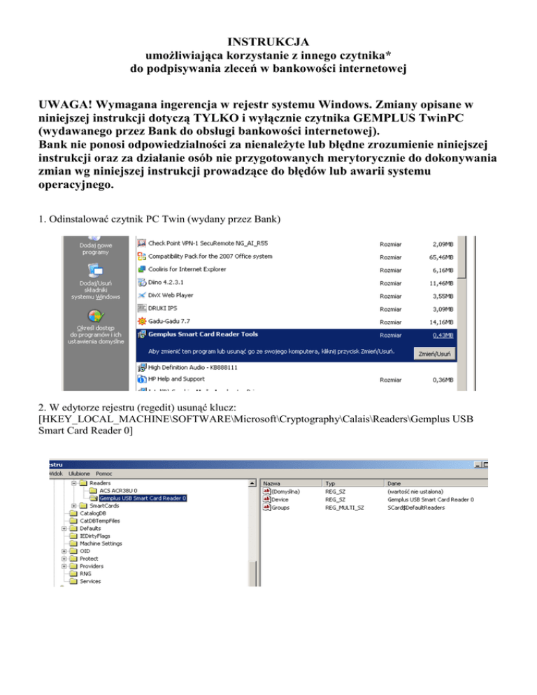 INSTRUKCJA umoŜliwiająca korzystanie z innego czytnika* do podpisywania zleceń w bankowości internetowej UWAGA! Wymagana ingerencja w rejestr systemu Windows. Zmiany opisane w niniejszej instrukcji dotyczą TYLKO i wyłącznie czytnika GEMPLUS TwinPC (wydawanego przez Bank do obsługi bankowości internetowej). Bank nie ponosi odpowiedzialności za nienaleŜyte lub błędne zrozumienie niniejszej instrukcji oraz za działanie osób nie przygotowanych merytorycznie do dokonywania zmian wg niniejszej instrukcji prowadzące do błędów lub awarii systemu operacyjnego. 1. Odinstalować czytnik PC Twin (wydany przez Bank) 2. W edytorze rejestru (regedit) usunąć klucz: [HKEY_LOCAL_MACHINE\SOFTWARE\Microsoft\Cryptography\Calais\Readers\Gemplus USB Smart Card Reader 0] 3. Zainstalować z programu instalacyjnego dołączonego do czytnika PC Twin (wydanego przez Bank) TYLKO komponenty Java. 4. Po restarcie komputera moŜna korzystać z kart kryptograficznych (wydanych przez Bank) przy pomocy innego zainstalowanego w systemie czytnika. * inny czytnik – czytnik nie pochodzący z Banku Spółdzielczego. Np. czytnik uŜywany przez Klienta do podpisywania dokumentów ZUS.