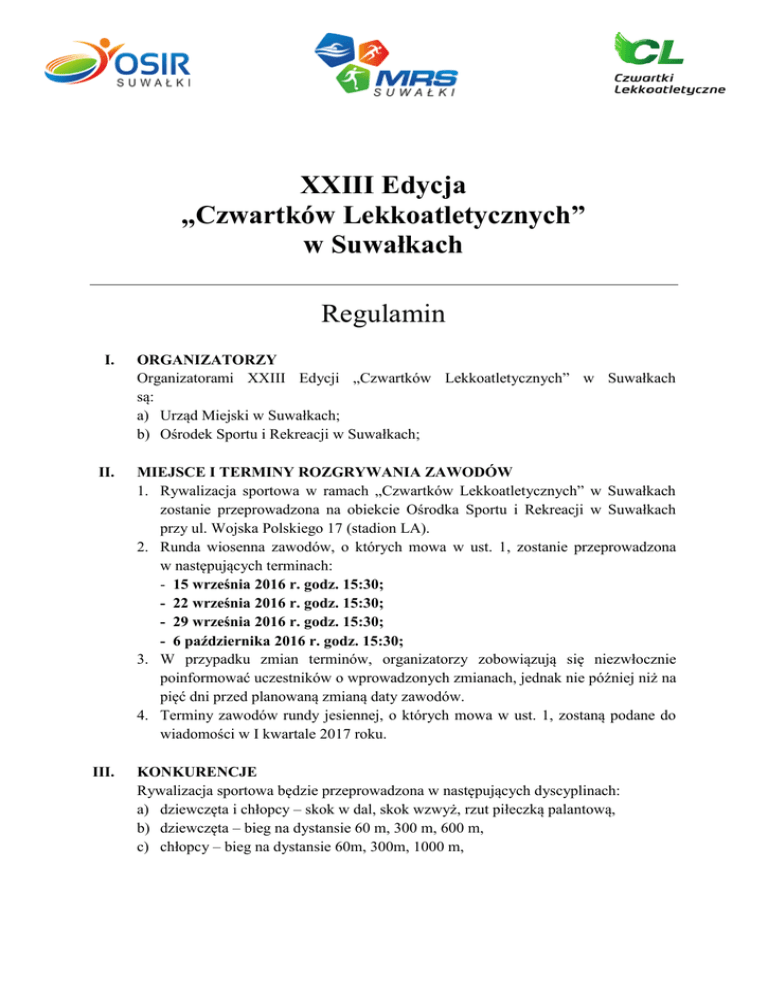 XXIII Edycja ,,Czwartków Lekkoatletycznych” w Suwałkach Regulamin I. ORGANIZATORZY Organizatorami XXIII Edycji „Czwartków Lekkoatletycznych” w Suwałkach są: a) Urząd Miejski w Suwałkach; b) Ośrodek Sportu i Rekreacji w Suwałkach; II. MIEJSCE I TERMINY ROZGRYWANIA ZAWODÓW 1. Rywalizacja sportowa w ramach „Czwartków Lekkoatletycznych” w Suwałkach zostanie przeprowadzona na obiekcie Ośrodka Sportu i Rekreacji w Suwałkach przy ul. Wojska Polskiego 17 (stadion LA). 2. Runda wiosenna zawodów, o których mowa w ust. 1, zostanie przeprowadzona w następujących terminach: - 15 września 2016 r. godz. 15:30; - 22 września 2016 r. godz. 15:30; - 29 września 2016 r. godz. 15:30; - 6 października 2016 r. godz. 15:30; 3. W przypadku zmian terminów, organizatorzy zobowiązują się niezwłocznie poinformować uczestników o wprowadzonych zmianach, jednak nie później niż na pięć dni przed planowaną zmianą daty zawodów. 4. Terminy zawodów rundy jesiennej, o których mowa w ust. 1, zostaną podane do wiadomości w I kwartale 2017 roku. III. KONKURENCJE Rywalizacja sportowa będzie przeprowadzona w następujących dyscyplinach: a) dziewczęta i chłopcy – skok w dal, skok wzwyż, rzut piłeczką palantową, b) dziewczęta – bieg na dystansie 60 m, 300 m, 600 m, c) chłopcy – bieg na dystansie 60m, 300m, 1000 m, IV. ZASADY UCZESTNICTWA 1. Prawo udziału w rywalizacji sportowej mają uczniowie (dziewczęta i chłopcy) szkół podstawowych z terenu Miasta Suwałk i Gminy Suwałki z uwzględnieniem następujących kategorii: I grupa wiekowa 13 lat – rocznik 2004, II grupa wiekowa 12 lat – rocznik 2005, III grupa wiekowa 11 lat i młodsi – rocznik 2006. 2. Zawodnik ma prawo do startu w dwóch konkurencjach (jednej biegowej + jednej technicznej). Wszystkie biegi zostaną rozegrane w seriach na czas. 3. W ogólnopolskich zawodach Grand Prix zawodnicy mogą startować w jednej konkurencji (biegowej albo technicznej). Jednak nie może to być konkurencja, w której nie wystartowali w finale miejskim. 4. Uczestnik zobowiązany jest do posiadania aktualnych badań lekarskich. Odpowiedzialnym za przedłożenie badań lekarskich u sędziego głównego zawodów jest opiekun uczestnika rywalizacji. 5. Do rywalizacji sportowej określonej niniejszym regulaminem dopuszczeni są uczniowie bez dodatkowych badań lekarskich posiadający grupę dyspanseryjną A lub B, uczestniczący czynnie w zajęciach wychowania fizycznego (Rozporządzenie Ministra Zdrowia z dnia 29 sierpnia 2009 r. w sprawie świadczeń gwarantowanych z zakresu podstawowej opieki zdrowotnej (Dz. U. Nr 139, poz.1138). Uwaga! W uzasadnionych przypadkach, zawodnik, który nie stawi się na starcie danej konkurencji w wyznaczonym czasie i odpowiedniej kategorii wiekowej, ma prawo startu w innej grupie wiekowej zgodnie z płcią zawodnika. W zaistniałej sytuacji, zawodnik pomimo zwycięstwa, nie będzie uwzględniany przy dekoracji na danym „czwartku la”, natomiast uzyskany wynik i punkty będą uwzględnione do klasyfikacji. V. ZASADY PUNKTACJI I KWALIFIKACJI 1. Punktacja zostanie obliczona według tabel punktowych oddzielnych dla każdej grupy wiekowej. 2. Prawo startu w finale miejskim uzyskują zawodnicy, którzy uczestniczyli przynajmniej w pięciu czwartkach lekkoatletycznych. 3. Do finału ogólnopolskiego Grand Prix kwalifikuje się trzech pierwszych zawodników w każdej konkurencji, według ilości zdobytych punktów. Stowarzyszenie zastrzega sobie możliwość ograniczenia ilości zawodników dopuszczonych do startu w ogólnopolskich zawodach Grand Prix do dwóch w każdej konkurencji ze względu na możliwości finansowe. Stowarzyszenie Sport Dzieci i Młodzieży poinformuje organizatorów zawodów miejskich o ostatecznej ilości zawodników, których będzie można zgłosić do uczestnictwa w ogólnopolskich zawodach Grand Prix najpóźniej na 30 dni przed terminem ich przeprowadzenia. 4. 5. 6. 7. Prawo startu w finale krajowym uzyskują zawodnicy, którzy uczestniczyli przynajmniej w pięciu zawodach i w finale miejskim. Do punktacji Grand Prix we wszystkich konkurencjach, z wyjątkiem biegów na 600m dziewcząt i 1000m chłopców, zalicza się punkty pięciu najlepszych startów w danej konkurencji oraz szósty wynik finału miejskiego. W biegach na 600m dziewcząt i na 1000m chłopców do punktacji Grand Prix zalicza się punkty z trzech najlepszych startów oraz czwarty wynik z finału miejskiego. Nie zwalnia to z obowiązku uczestnictwa w pięciu zawodach i finale miejskim. Jeżeli zawodnik jest sklasyfikowany w pierwszej trójce w więcej niż jednej konkurencji, to przysługuje mu prawo wyboru konkurencji, w której wystartuje w ogólnopolskim Grand Prix. Jednak nie może to być konkurencja, w której nie wystartował w finale miejskim. VI. KLASYFIKACJA NAUCZYCIELI I SZKÓŁ 1. Organizator prowadzi klasyfikację nauczycieli zgodnie z regulaminem uchwalonym przez Stowarzyszenie ,,Sport Dzieci i Młodzieży” w Warszawie. 2. Klasyfikacja szkół prowadzona jest z uwzględnieniem punktów przyznanych szkołom za poziom sportowy startujących dzieci. 3. Dziecko jest przyporządkowane na cały cykl startów wyłącznie do jednego nauczyciela. Nie istnieje możliwość zmiany nauczyciela. VII. SPRAWY FINANSOWE 1. Koszty organizacyjne związane z przygotowaniem obiektów do zawodów i przeprowadzenia sportowej rywalizacji pokrywają organizatorzy. 2. Koszty uczestnictwa w zawodach pokrywają szkoły lub organizacje zgłaszające uczestników zawodów. VIII. NAGRODY 1. Za trzy pierwsze miejsca na każdym „czwartku la” dzieci otrzymują dyplomy. 2. Za miejsca I – III w finale miejskim dzieci otrzymują dyplomy oraz nagrody rzeczowe w zależności od możliwości finansowych organizatora. 3. Sześciu pierwszych nauczycieli i sześć szkół otrzyma puchary według regulaminu, o którym mowa w dziale VI ust. 1 niniejszego regulaminu. Uwaga! Po zakończeniu danej konkurencji, obowiązkiem na