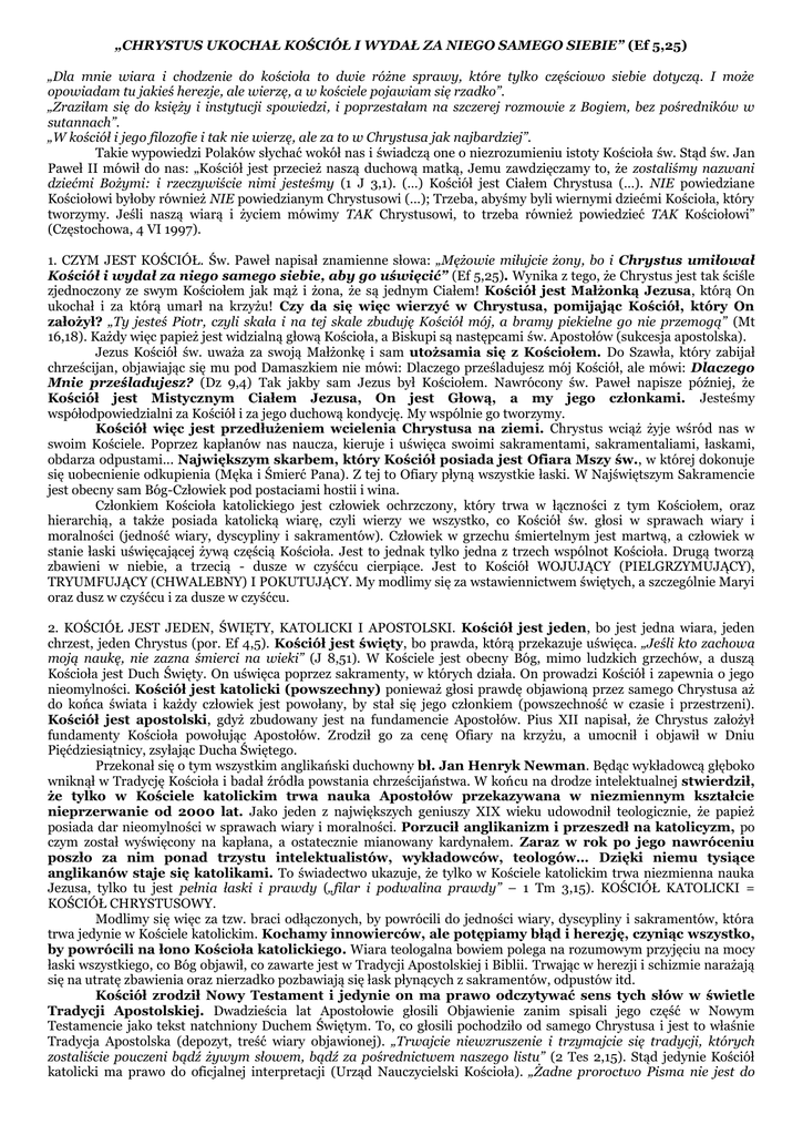 „CHRYSTUS UKOCHAŁ KOŚCIÓŁ I WYDAŁ ZA NIEGO SAMEGO SIEBIE” (Ef 5,25) „Dla mnie wiara i chodzenie do kościoła to dwie różne sprawy, które tylko częściowo siebie dotyczą. I może opowiadam tu jakieś herezje, ale wierzę, a w kościele pojawiam się rzadko”. „Zraziłam się do księży i instytucji spowiedzi, i poprzestałam na szczerej rozmowie z Bogiem, bez pośredników w sutannach”. „W kościół i jego filozofie i tak nie wierzę, ale za to w Chrystusa jak najbardziej”. Takie wypowiedzi Polaków słychać wokół nas i świadczą one o niezrozumieniu istoty Kościoła św. Stąd św. Jan Paweł II mówił do nas: „Kościół jest przecież naszą duchową matką, Jemu zawdzięczamy to, że zostaliśmy nazwani dziećmi Bożymi: i rzeczywiście nimi jesteśmy (1 J 3,1). (…) Kościół jest Ciałem Chrystusa (…). NIE powiedziane Kościołowi byłoby również NIE powiedzianym Chrystusowi (…); Trzeba, abyśmy byli wiernymi dziećmi Kościoła, który tworzymy. Jeśli naszą wiarą i życiem mówimy TAK Chrystusowi, to trzeba również powiedzieć TAK Kościołowi” (Częstochowa, 4 VI 1997). 1. CZYM JEST KOŚCIÓŁ. Św. Paweł napisał znamienne słowa: „Mężowie miłujcie żony, bo i Chrystus umiłował Kościół i wydał za niego samego siebie, aby go uświęcić” (Ef 5,25). Wynika z tego, że Chrystus jest tak ściśle zjednoczony ze swym Kościołem jak mąż i żona, że są jednym Ciałem! Kościół jest Małżonką Jezusa, którą On ukochał i za którą umarł na krzyżu! Czy da się więc wierzyć w Chrystusa, pomijając Kościół, który On założył? „Ty jesteś Piotr, czyli skała i na tej skale zbuduję Kościół mój, a bramy piekielne go nie przemogą” (Mt 16,18). Każdy więc papież jest widzialną głową Kościoła, a Biskupi są następcami św. Apostołów (sukcesja apostolska). Jezus Kościół św. uważa za swoją Małżonkę i sam utożsamia się z Kościołem. Do Szawła, który zabijał chrześcijan, objawiając się mu pod Damaszkiem nie mówi: Dlaczego prześladujesz mój Kościół, ale mówi: Dlaczego Mnie prześladujesz? (Dz 9,4) Tak jakby sam Jezus był Kościołem. Nawrócony św. Paweł napisze później, że Kościół jest Mistycznym Ciałem Jezusa, On jest Głową, a my jego członkami. Jesteśmy współodpowiedzialni za Kościół i za jego duchową kondycję. My wspólnie go tworzymy. Kościół więc jest przedłużeniem wcielenia Chrystusa na ziemi. Chrystus wciąż żyje wśród nas w swoim Kościele. Poprzez kapłanów nas naucza, kieruje i uświęca swoimi sakramentami, sakramentaliami, łaskami, obdarza odpustami... Największym skarbem, który Kościół posiada jest Ofiara Mszy św., w której dokonuje się uobecnienie odkupienia (Męka i Śmierć Pana). Z tej to Ofiary płyną wszystkie łaski. W Najświętszym Sakramencie jest obecny sam Bóg-Człowiek pod postaciami hostii i wina. Członkiem Kościoła katolickiego jest człowiek ochrzczony, który trwa w łączności z tym Kościołem, oraz hierarchią, a także posiada katolicką wiarę, czyli wierzy we wszystko, co Kościół św. głosi w sprawach wiary i moralności (jedność wiary, dyscypliny i sakramentów). Człowiek w grzechu śmiertelnym jest martwą, a człowiek w stanie łaski uświęcającej żywą częścią Kościoła. Jest to jednak tylko jedna z trzech wspólnot Kościoła. Drugą tworzą zbawieni w niebie, a trzecią - dusze w czyśćcu cierpiące. Jest to Kościół WOJUJĄCY (PIELGRZYMUJĄCY), TRYUMFUJĄCY (CHWALEBNY) I POKUTUJĄCY. My modlimy się za wstawiennictwem świętych, a szczególnie Maryi oraz dusz w czyśćcu i za dusze w czyśćcu. 2. KOŚCIÓŁ JEST JEDEN, ŚWIĘTY, KATOLICKI I APOSTOLSKI. Kościół jest jeden, bo jest jedna wiara, jeden chrzest, jeden Chrystus (por. Ef 4,5). Kościół jest święty, bo prawda, którą przekazuje uświęca. „Jeśli kto zachowa moją naukę, nie zazna śmierci na wieki” (J 8,51). W Kościele jest obecny Bóg, mimo ludzkich grzechów, a duszą Kościoła jest Duch Święty. On uświęca poprzez sakramenty, w których działa. On prowadzi Kościół i zapewnia o jego nieomylności. Kościół jest katolicki (powszechny) ponieważ głosi prawdę objawioną przez samego Chrystusa aż do końca świata i każdy człowiek jest powołany, by stał się jego członkiem (powszechność w czasie i przestrzeni). Kościół jest apostolski, gdyż zbudowany jest na fundamencie Apostołów. Pius XII napisał, że Chrystus założył fundamenty Kościoła powołując Apostołów. Zrodził go za cenę Ofiary na krzyżu, a umocnił i objawił w Dniu Pięćdziesiątnicy, zsyłając Ducha Świętego. Przekonał się o tym wszystkim anglikański duchowny bł. Jan Henryk Newman. Będąc wykładowcą głęboko wniknął w Tradycję Kościoła i badał źródła powstania chrześcijaństwa. W końcu na drodze intelektualnej stwierdził, że tylko w Kościele katolickim trwa nauka Apostołów przekazywana w niezmiennym kształcie nieprzerwanie od 2000 lat. Jako jeden z największych geniuszy XIX wieku udowodnił teologicznie, że papież posiada dar nieomylności w sprawach wiary i moralności. Porzucił anglikanizm i przeszedł na katolicyzm, po czym został wyświęcony na kapłana, a ostatecznie mianowany kardynałem. Zaraz w rok po jego nawróceniu poszło za nim ponad trzystu intelektualistów, wykładowców, teologów… Dzięki niemu tysiące anglikanów staje się katolikami. To świadectwo ukazuje, że tylko w Kościele katolickim trwa niezmienna nauka Jezusa, tylko tu jest pełnia łaski i prawdy („filar i podwalina prawdy” – 1 Tm 3,15). KOŚCIÓŁ KATOLICKI = KOŚCIÓŁ CHRYSTUSOWY. Modlimy się więc za tzw. braci odłączonych, by powrócili do jedności wiary, dyscypliny i sakramentów, która trwa jedynie w Kościele katolickim. Kochamy innowierców, ale potępiamy błąd i herezję, czyniąc wszystko, by powrócili na łono Kościoła katolickiego. Wiara teologalna 