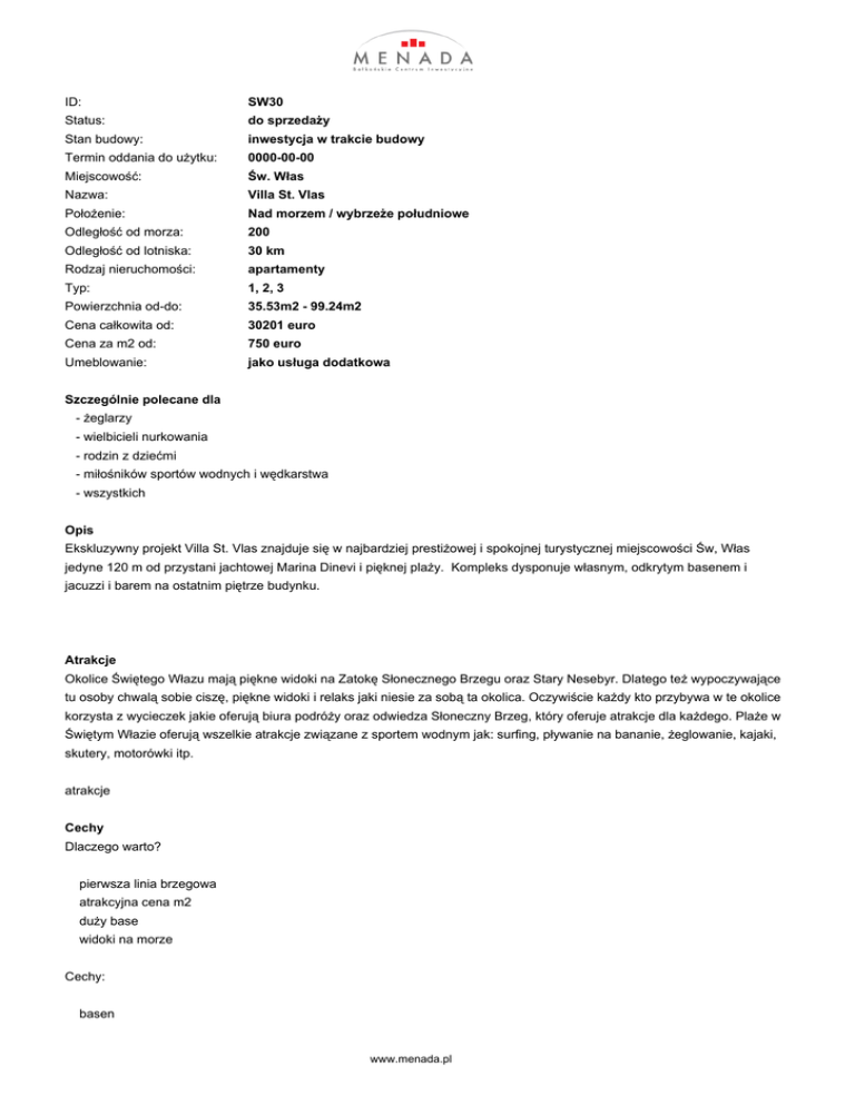 ID: SW30 Status: do sprzedaży Stan budowy: inwestycja w trakcie budowy Termin oddania do użytku: 0000-00-00 Miejscowość: Św. Włas Nazwa: Villa St. Vlas Położenie: Nad morzem / wybrzeże południowe Odległość od morza: 200 Odległość od lotniska: 30 km Rodzaj nieruchomości: apartamenty Typ: 1, 2, 3 Powierzchnia od-do: 35.53m2 - 99.24m2 Cena całkowita od: 30201 euro Cena za m2 od: 750 euro Umeblowanie: jako usługa dodatkowa Szczególnie polecane dla - żeglarzy - wielbicieli nurkowania - rodzin z dziećmi - miłośników sportów wodnych i wędkarstwa - wszystkich Opis Ekskluzywny projekt Villa St. Vlas znajduje się w najbardziej prestiżowej i spokojnej turystycznej miejscowości Św, Włas jedyne 120 m od przystani jachtowej Marina Dinevi i pięknej plaży. Kompleks dysponuje własnym, odkrytym basenem i jacuzzi i barem na ostatnim piętrze budynku. Atrakcje Okolice Świętego Włazu mają piękne widoki na Zatokę Słonecznego Brzegu oraz Stary Nesebyr. Dlatego też wypoczywające tu osoby chwalą sobie ciszę, piękne widoki i relaks jaki niesie za sobą ta okolica. Oczywiście każdy kto przybywa w te okolice korzysta z wycieczek jakie oferują biura podróży oraz odwiedza Słoneczny Brzeg, który oferuje atrakcje dla każdego. Plaże w Świętym Włazie oferują wszelkie atrakcje związane z sportem wodnym jak: surfing, pływanie na bananie, żeglowanie, kajaki, skutery, motorówki itp. atrakcje Cechy Dlaczego warto? pierwsza linia brzegowa atrakcyjna cena m2 duży base widoki na morze Cechy: basen www.menada.pl jacuzzi bar ochrona wysoki standard Usługi Roczna opłata za zarządzanie - 8 E/m2 bez Vat. Nasza firma dba o utrzymanie apartamentu w ciągu roku - Dla naszych Klientów zapewniamy utrzymanie nieruchomości, ochronę 24 h przez cały rok, oświetlenie, bezpieczeństwo elektryczne i wodne, naprawy, sprzątanie i czyszczenie części wspólnych, zieleni, czyszczenie apartamentu czy też płatności rachunków. Uzyskiwanie dodatkowych dochodów z ewentualnego wynajmu apartamentu - Zapewniamy bowiem również organizację wynajmu apartamentu. obsługa posprzedażowa Zasady płatności Plan płatności: 1000 E depozyt 30% do 20 dni od wpłaty depozytu, przy podpisywaniu umowy przedwstępnej 70 %-maj 2012 r. Koszty: Należy pamiętać, iż oprócz ceny za nieruchomość dochodzi koszt związany z opłatą notarialną u Notariusza (jest to maksymalnie 3,5 - 4,5 % wartości zakupu). www.menada.pl